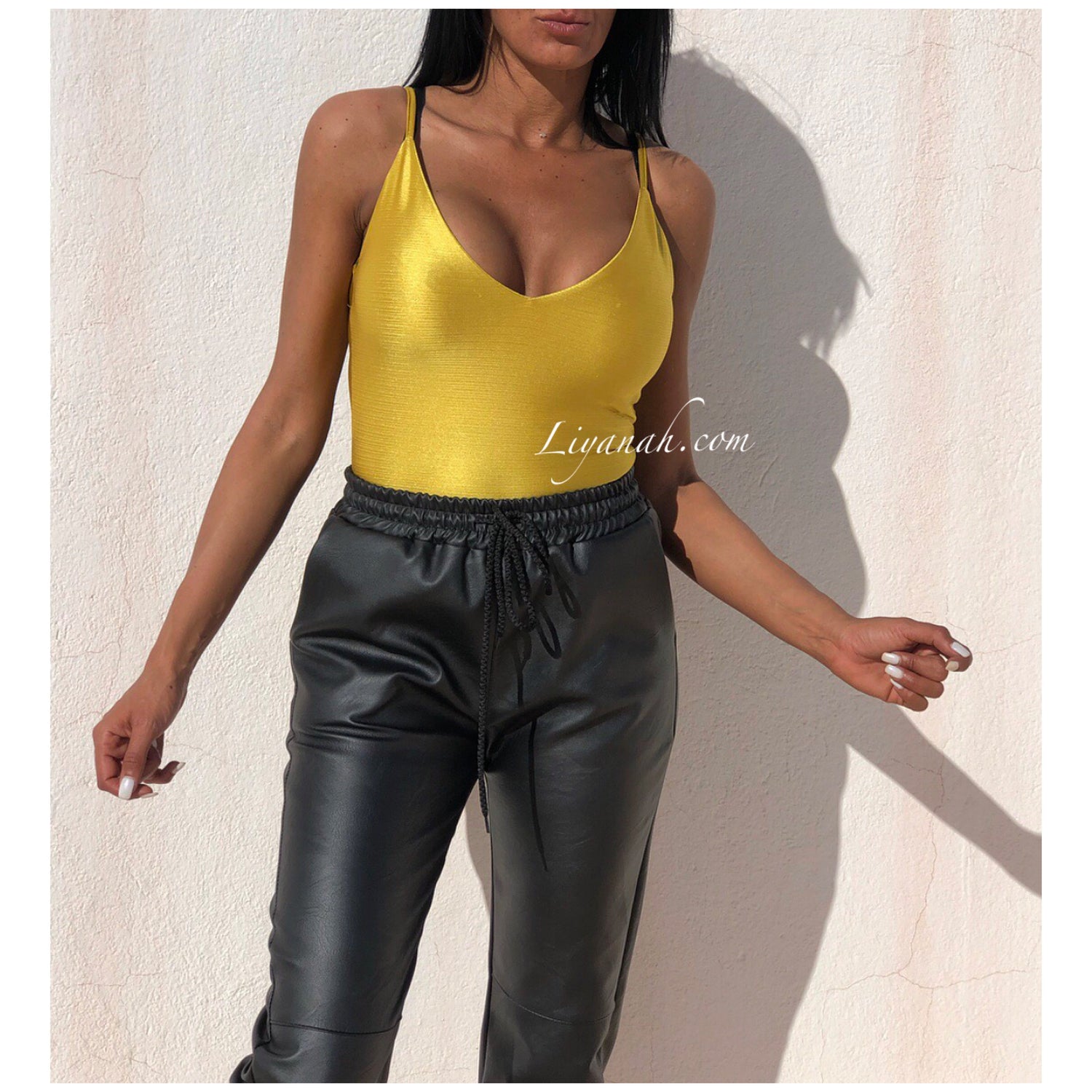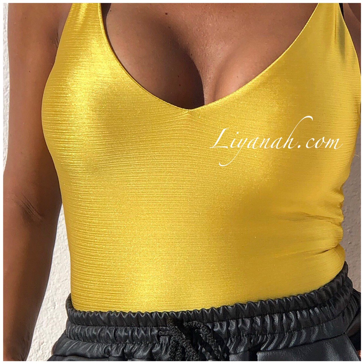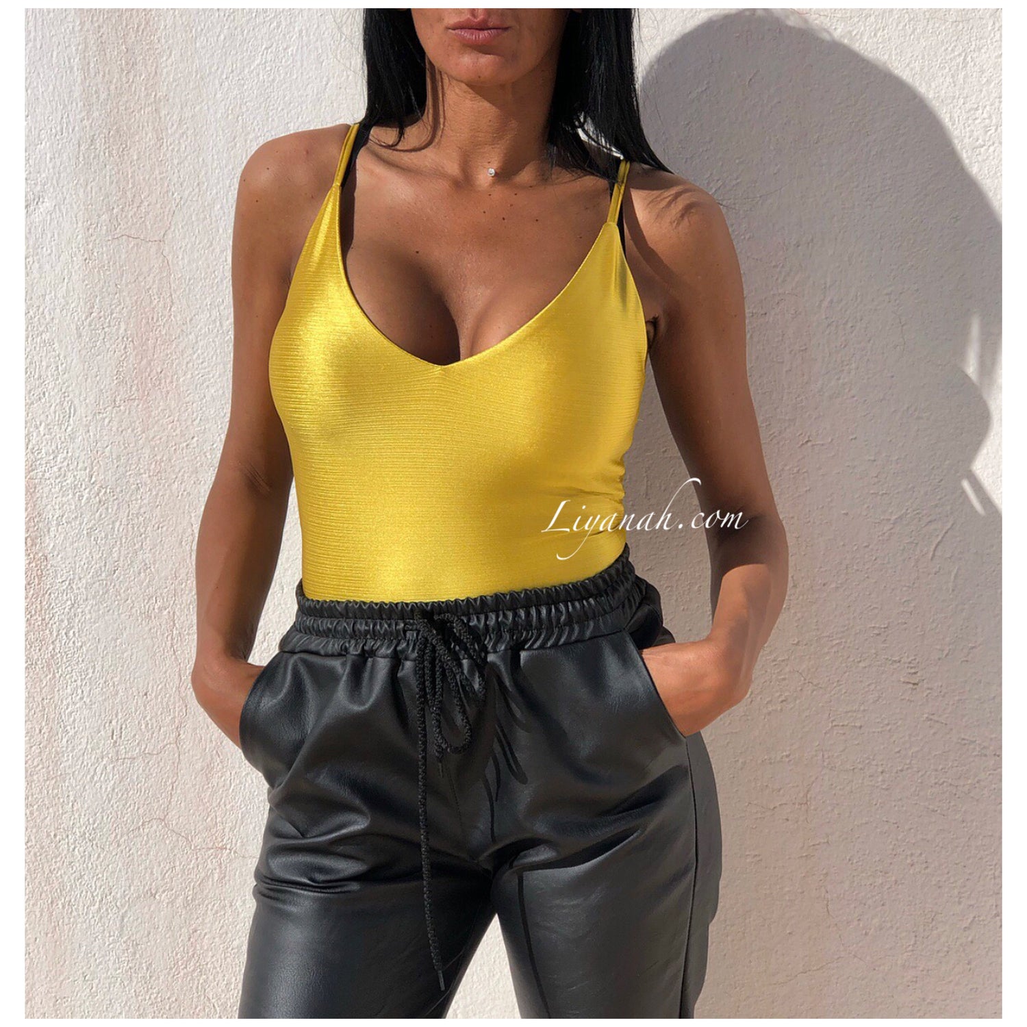 BODY Aspect Brillant Modèle OKARA JAUNE - Dingue des bodys chez Liyanah et ce modèle est sexy et décontracté !!! Portez-le avec un jean, short, pantalon ou jupe !!! Il s'adaptera à toutes vos envies !! Décolleté plongeant avec dos nu !! 100% Polyester - Taille XS au L - FERMETURE À BOUTONS A L’ENTREJAMBE - Notre modèle porte une Taille XS / Pour des raisons d'hygiène, les bodys et sous vêtement ne sont ni repris ni échangés