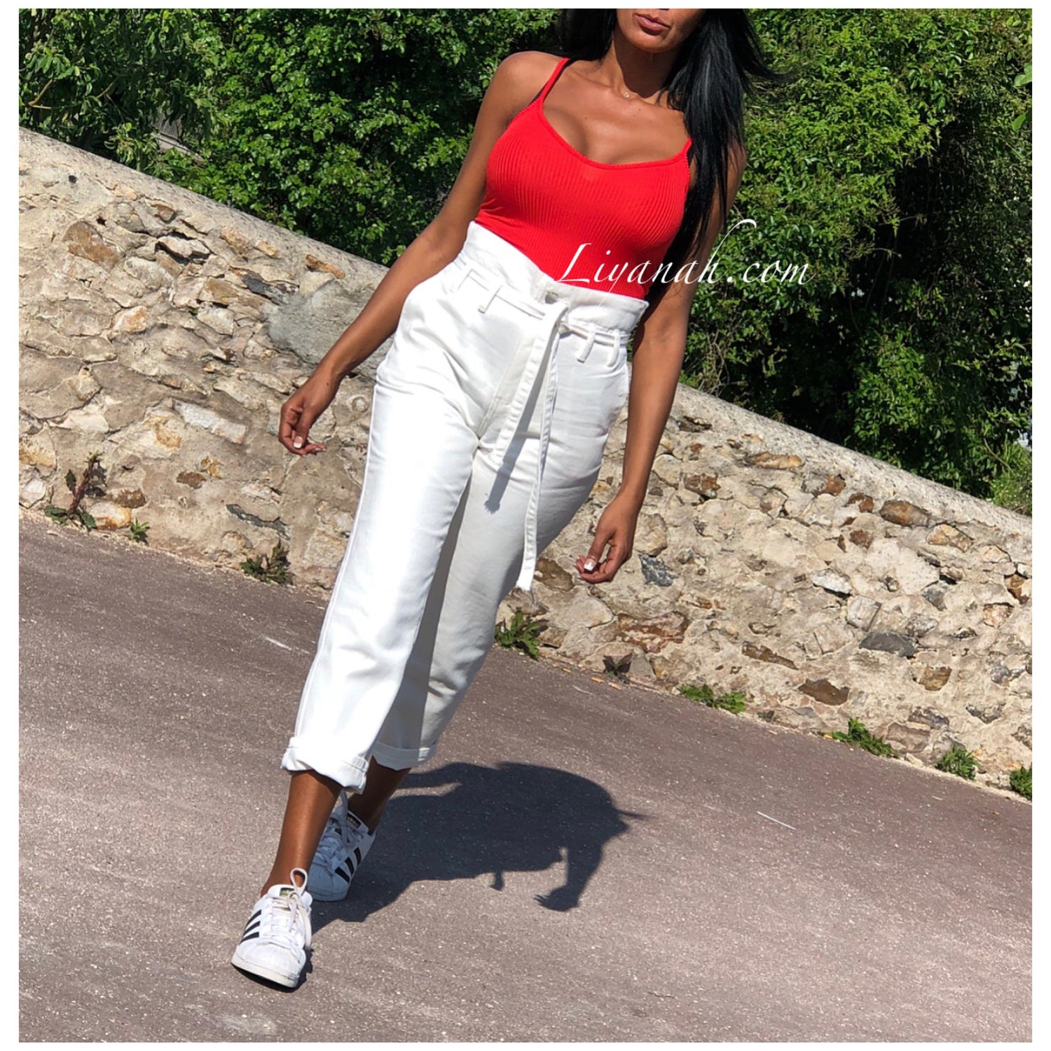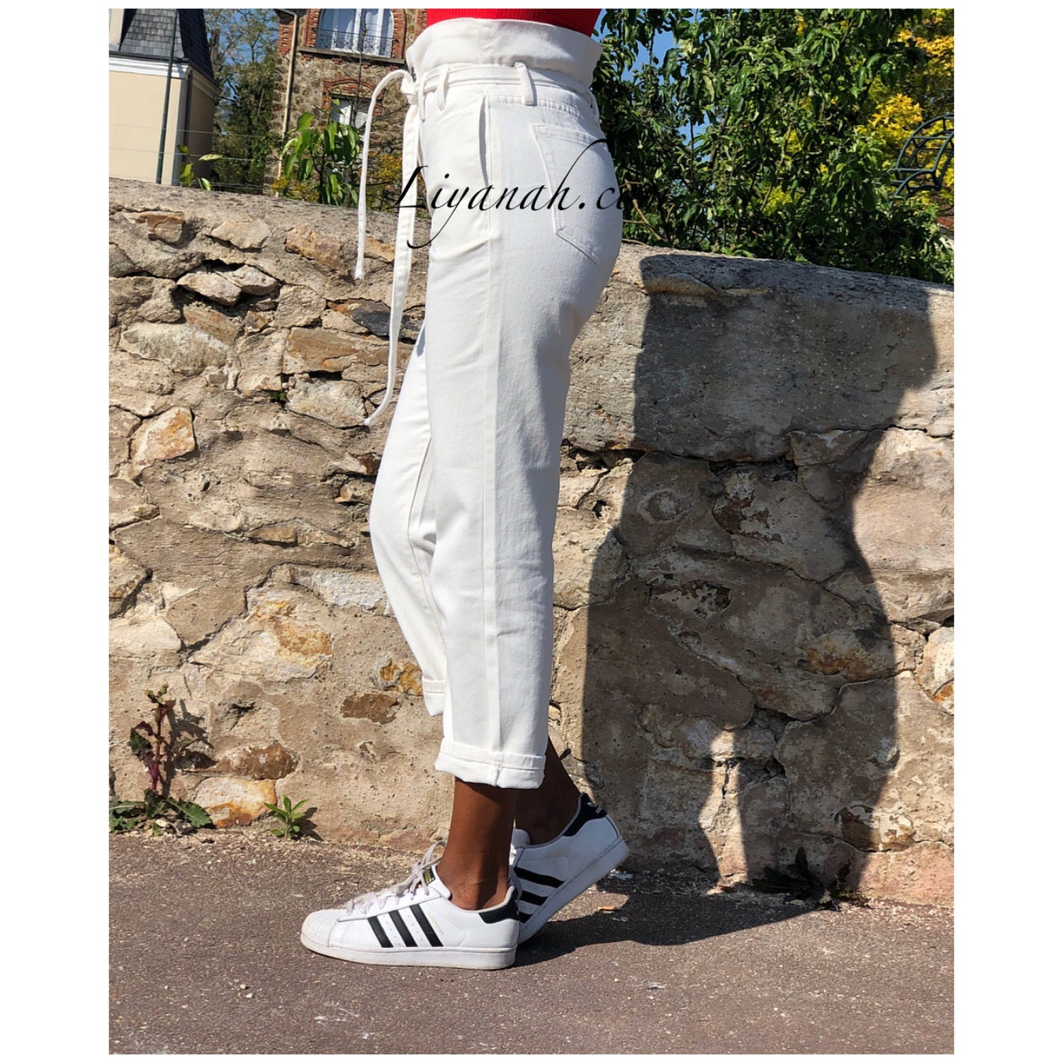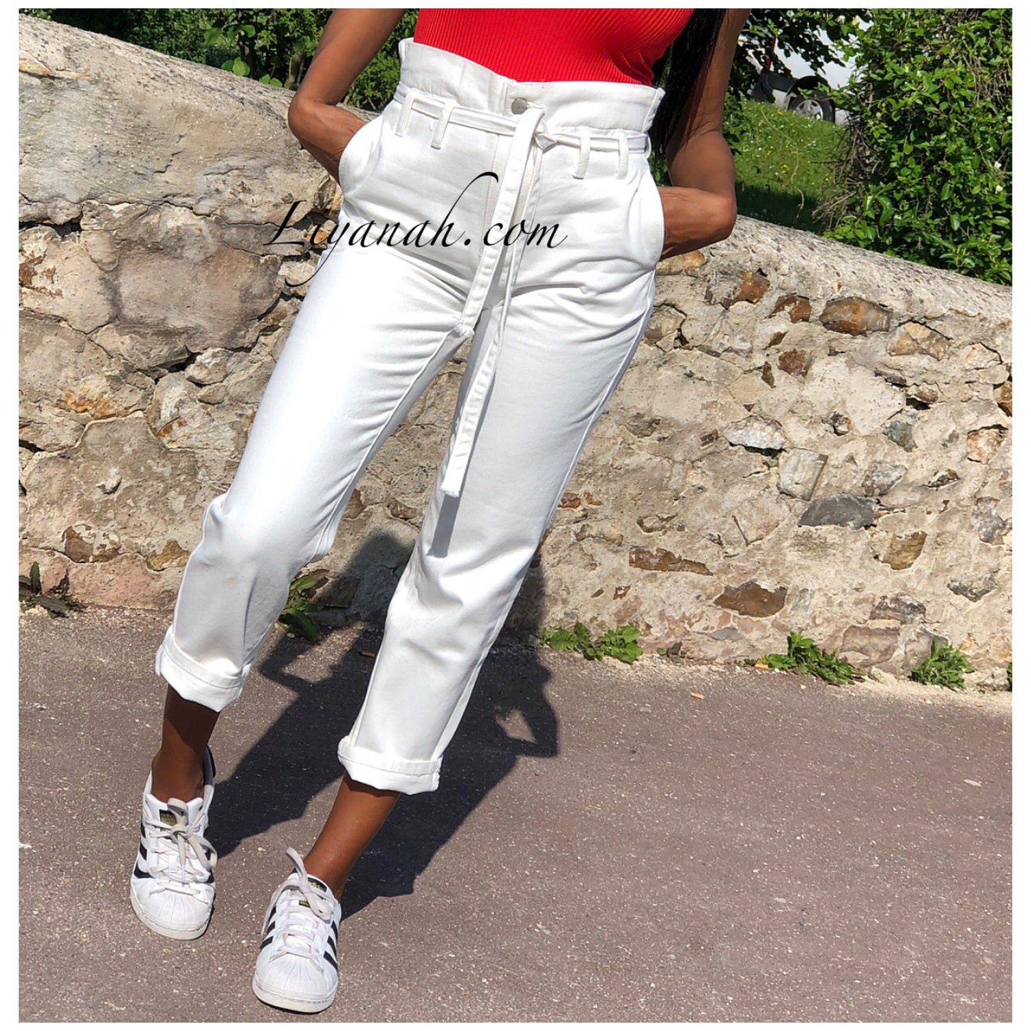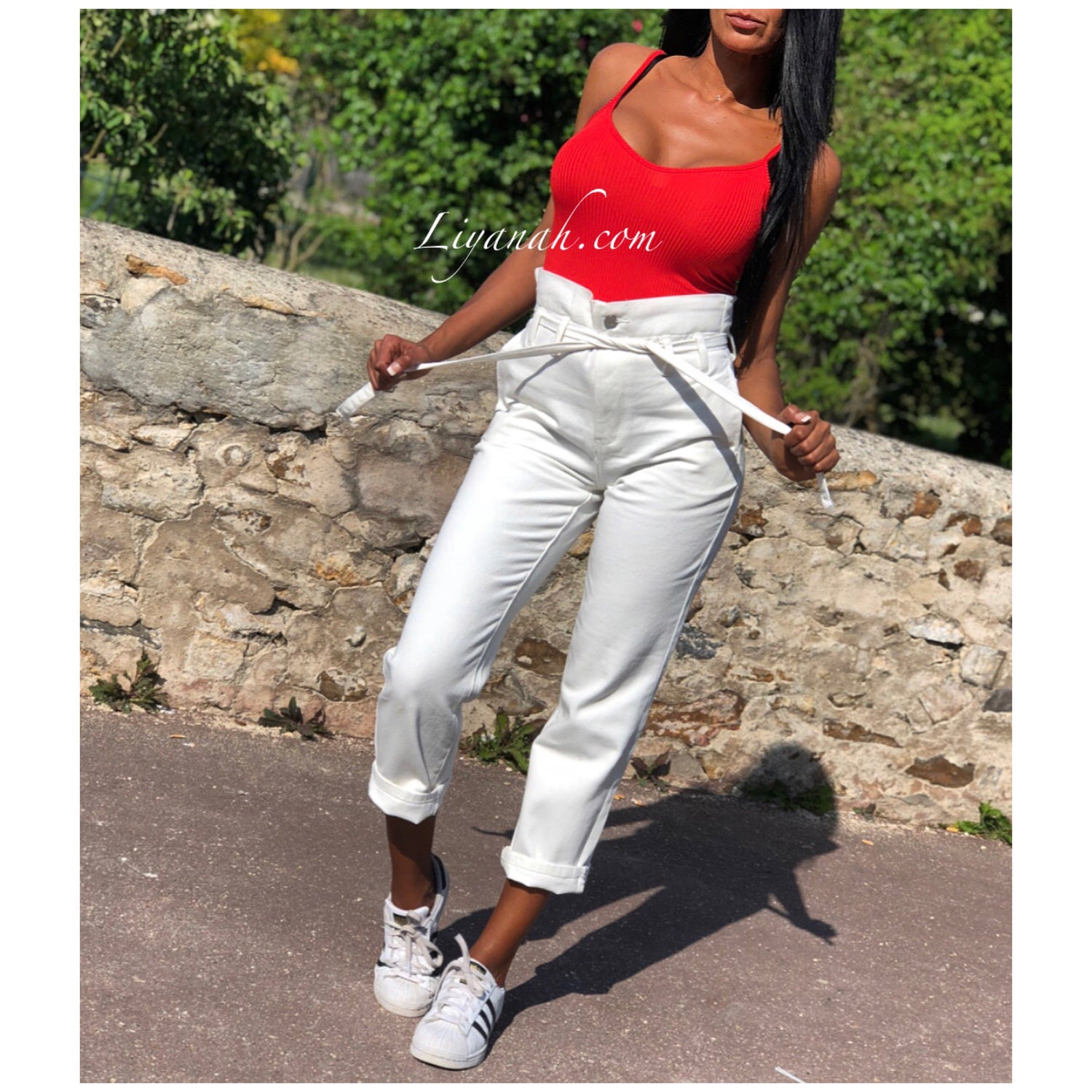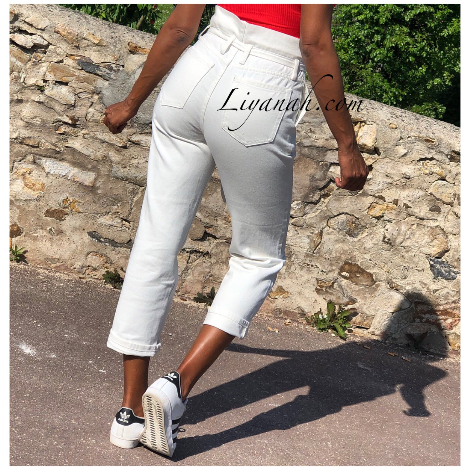 JEAN MOM WHITE Taille Haute À NOEUD Modèle DARYANA