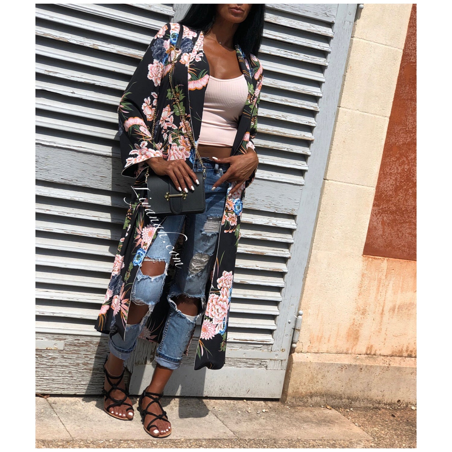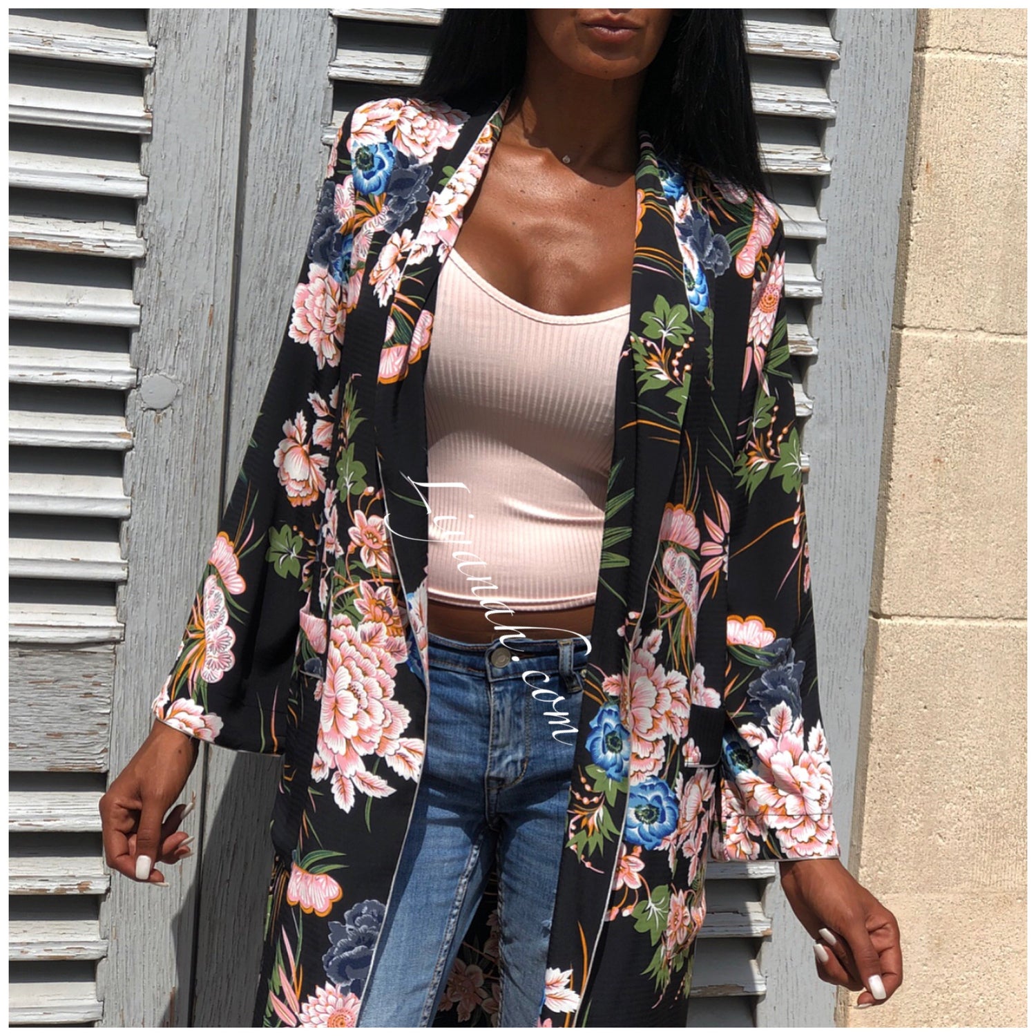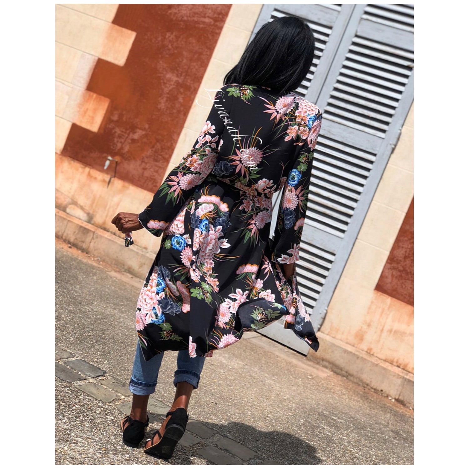 Kimono Mi-Long DYCHANA Fleuri Noir Imprimé floral sur l’ensemble du Kimono, Ceinture à nouer, Col Tailleur, 2 poches sur les côtés. Kimono fluide, et manches mi-longues 🌸 Longueur : 114 cm - 100% Viscose !! Taille S - M ou L) Apportez une touche fleurie à votre look avec ce Kimono totalement CHIC et fleuri 💋 Portez-le avec un jean, Short ou robe pour rehausser vos basiques Ou bien Cet été au dessus d'un maillot de bain sur la plage. (Disponible en Noir ou Beige)