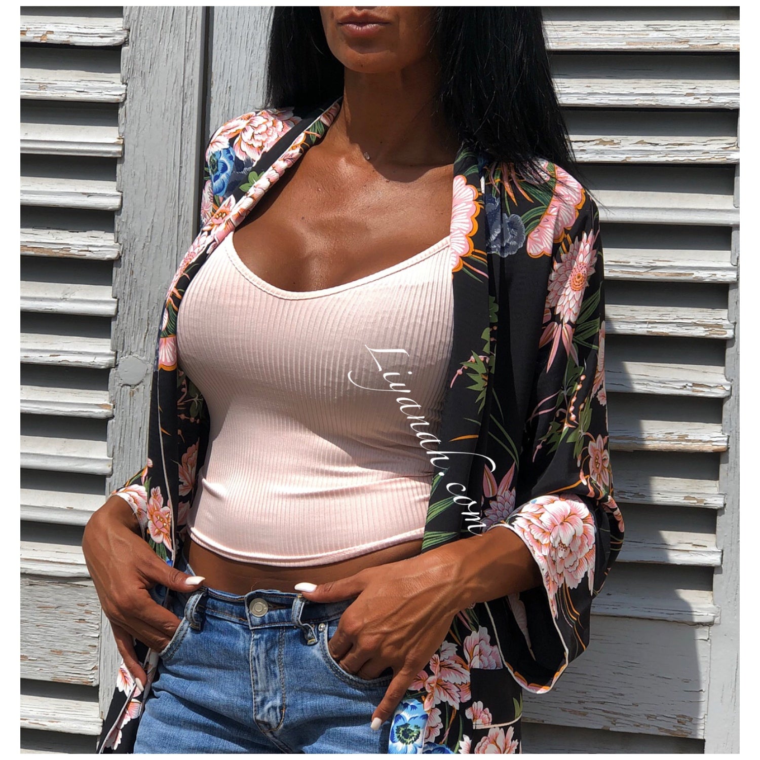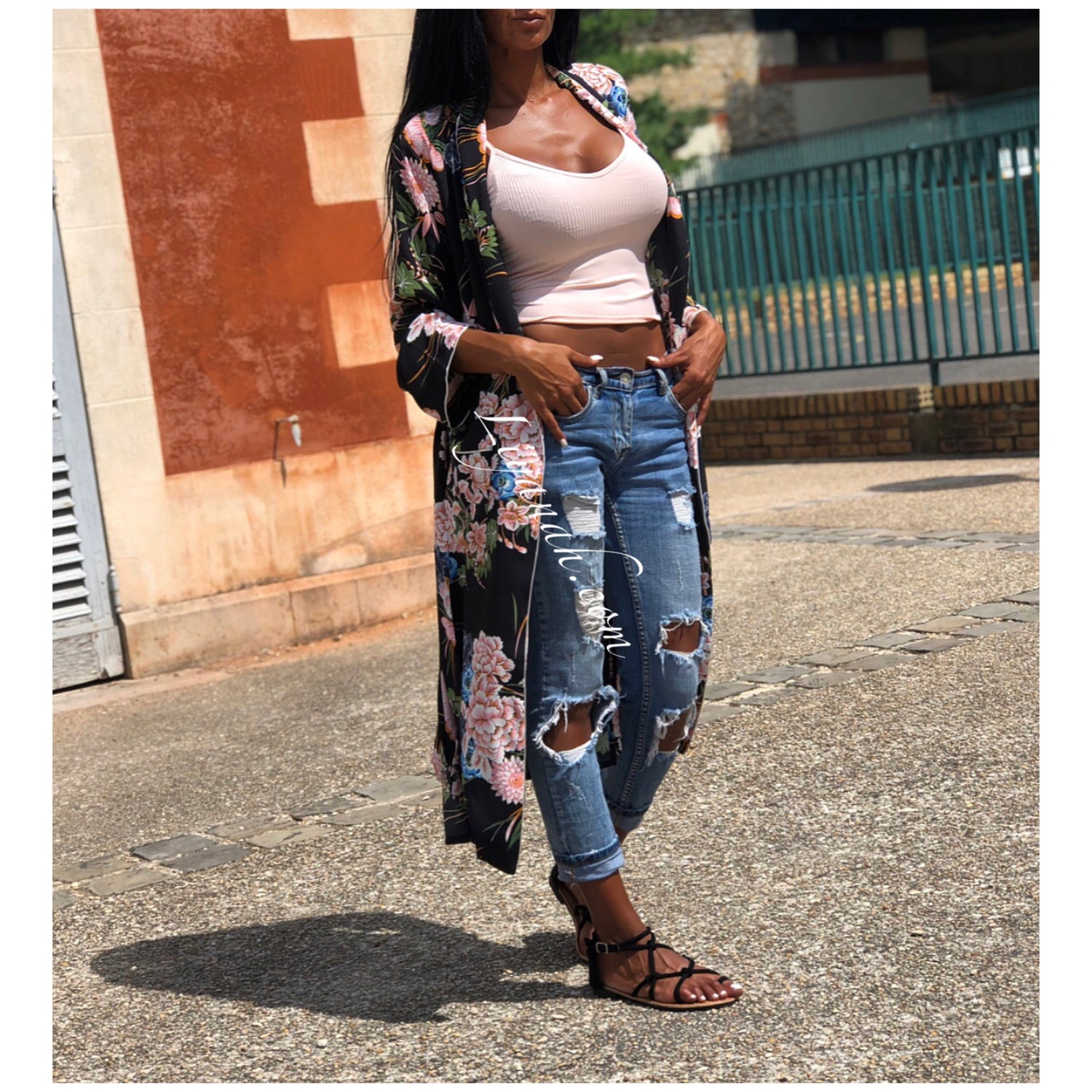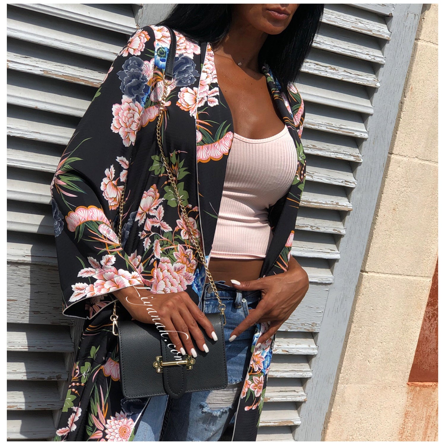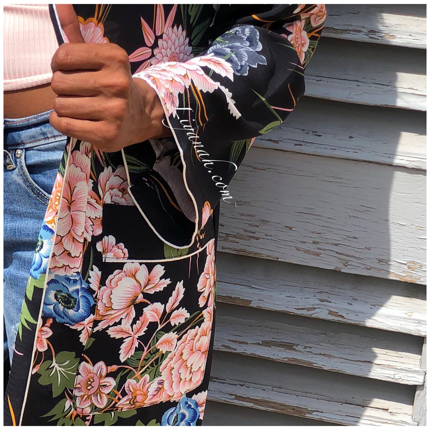 Kimono Mi-Long DYCHANA Fleuri Noir Imprimé floral sur l’ensemble du Kimono, Ceinture à nouer, Col Tailleur, 2 poches sur les côtés. Kimono fluide, et manches mi-longues 🌸 Longueur : 114 cm - 100% Viscose !! Taille S - M ou L) Apportez une touche fleurie à votre look avec ce Kimono totalement CHIC et fleuri 💋 Portez-le avec un jean, Short ou robe pour rehausser vos basiques Ou bien Cet été au dessus d'un maillot de bain sur la plage. (Disponible en Noir ou Beige)