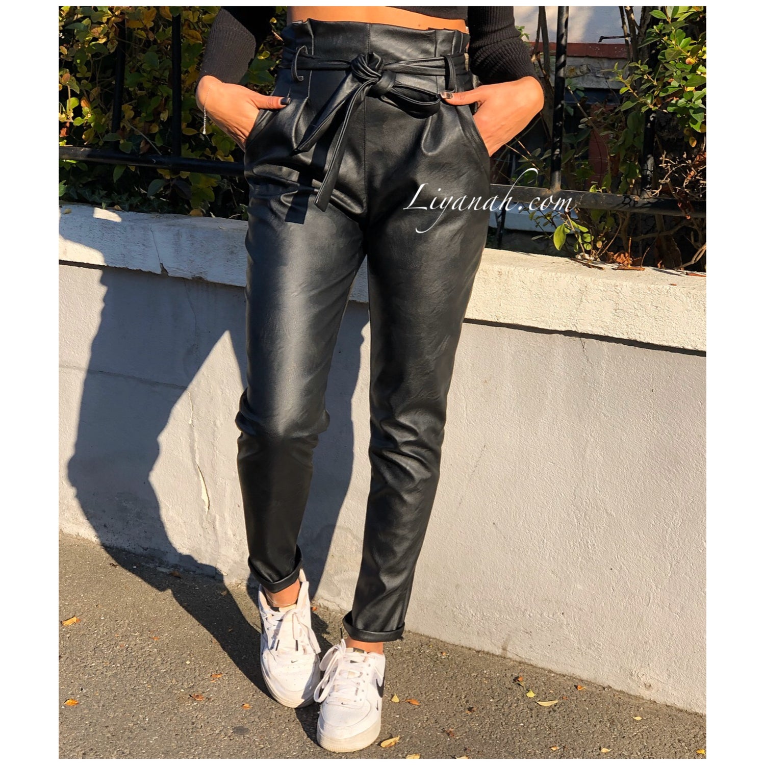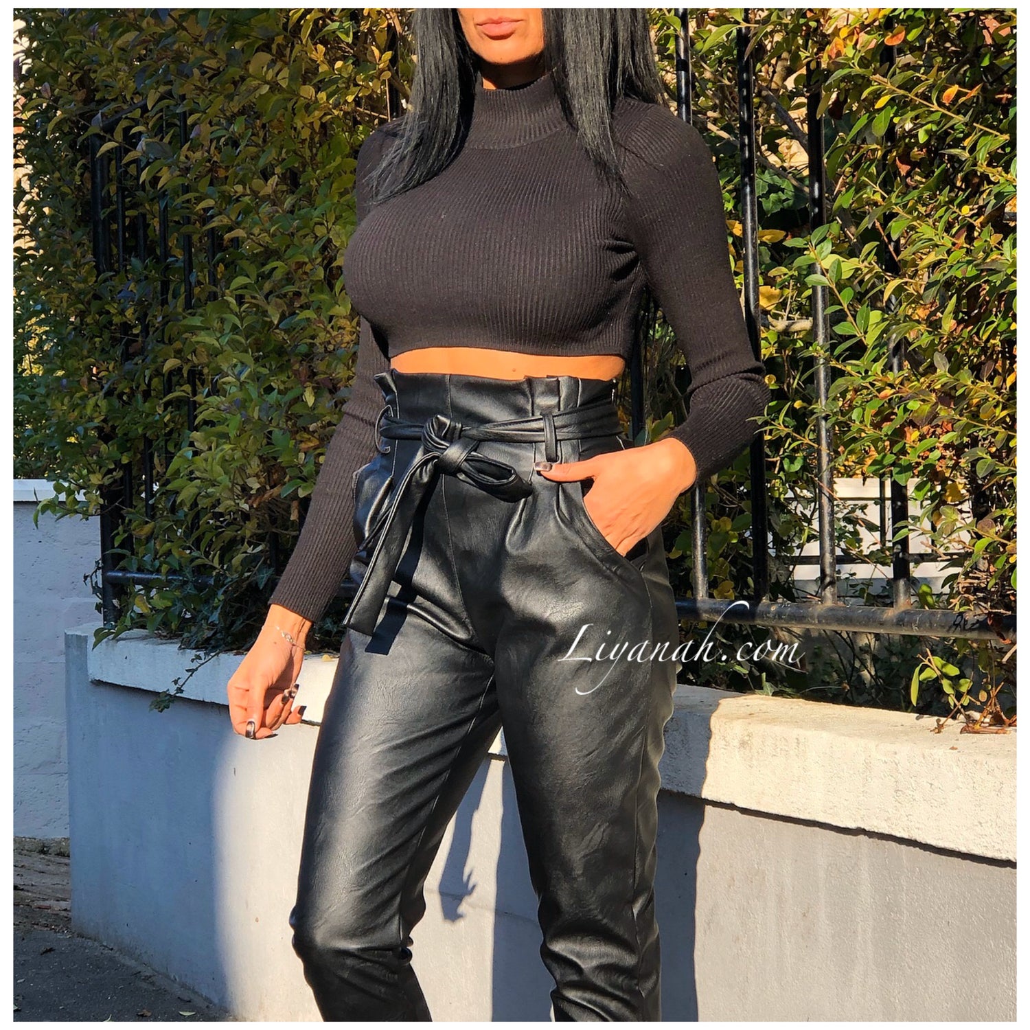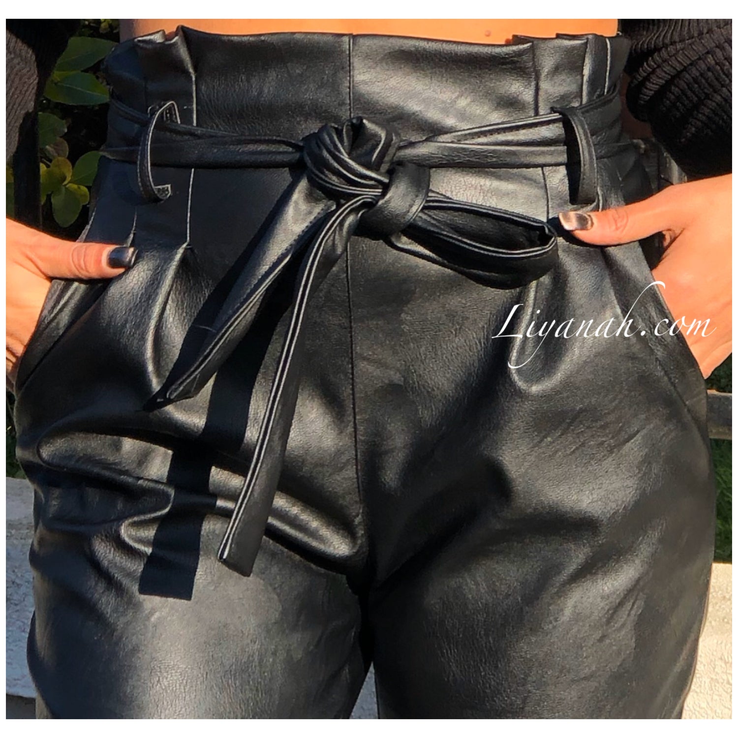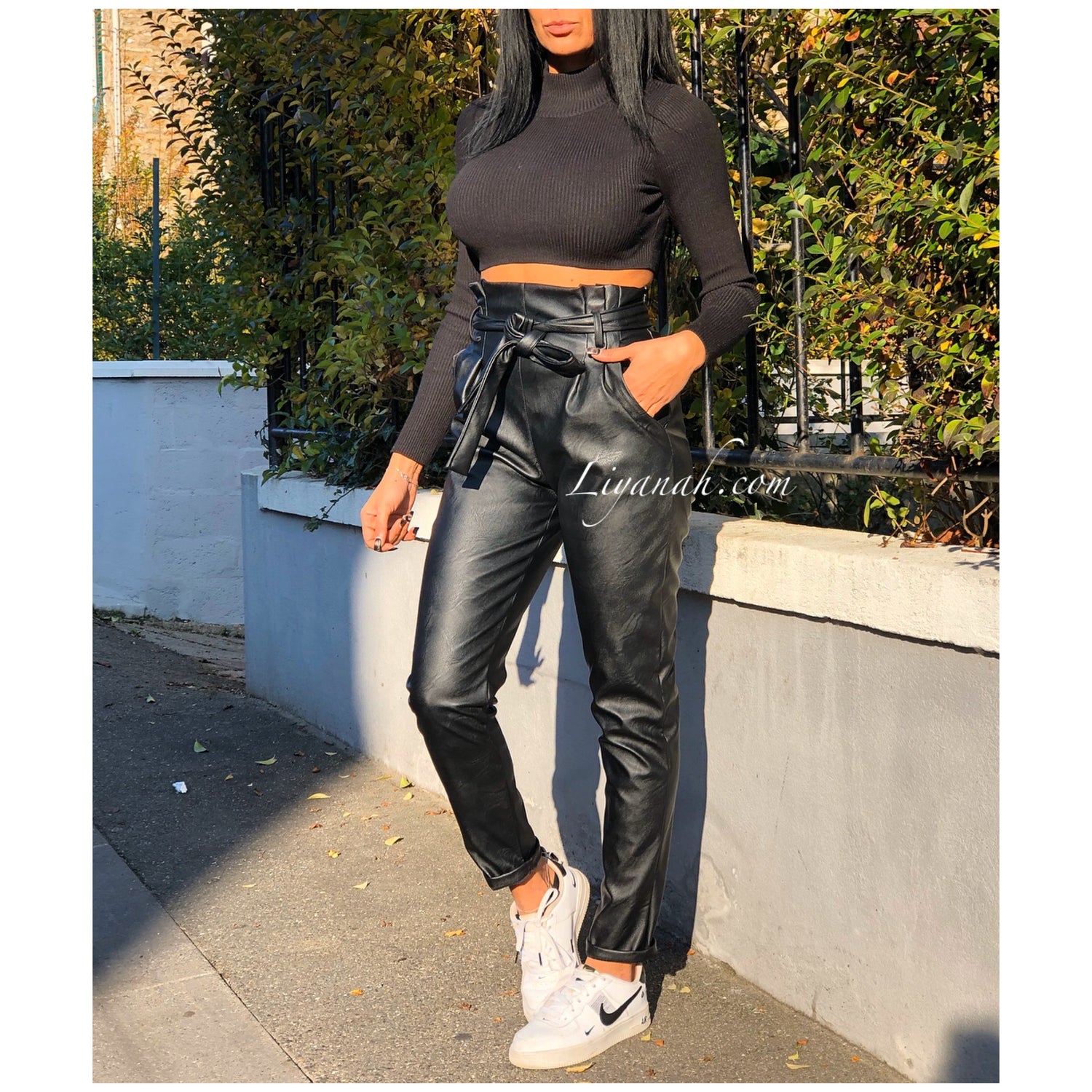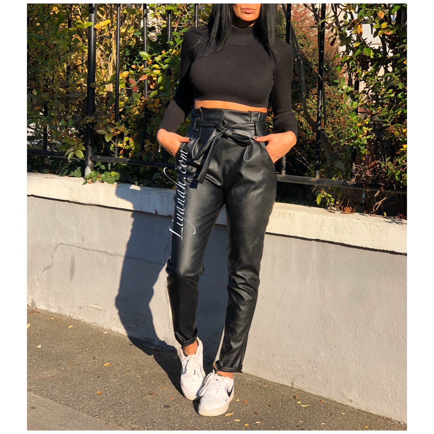 Pantalon Modèle BASSA NOIR - Pantalon taille mi-haute aspect cuir, coupe Droite et légèrement Oversize, noeud à nouer à la taille, fermeture zip sur le côté, deux poches fonctionnelles - 45% PU 55% Polyester - Taille S au L - Notre modèle mesure 1m70, fait une taille 34 et porte une taille S