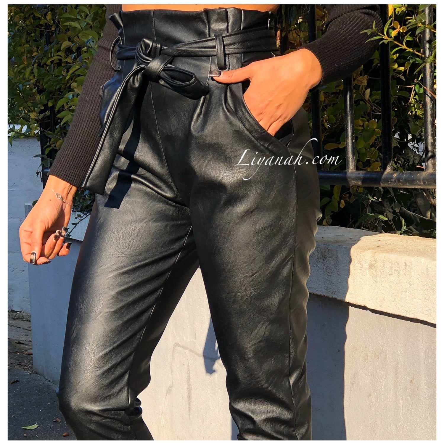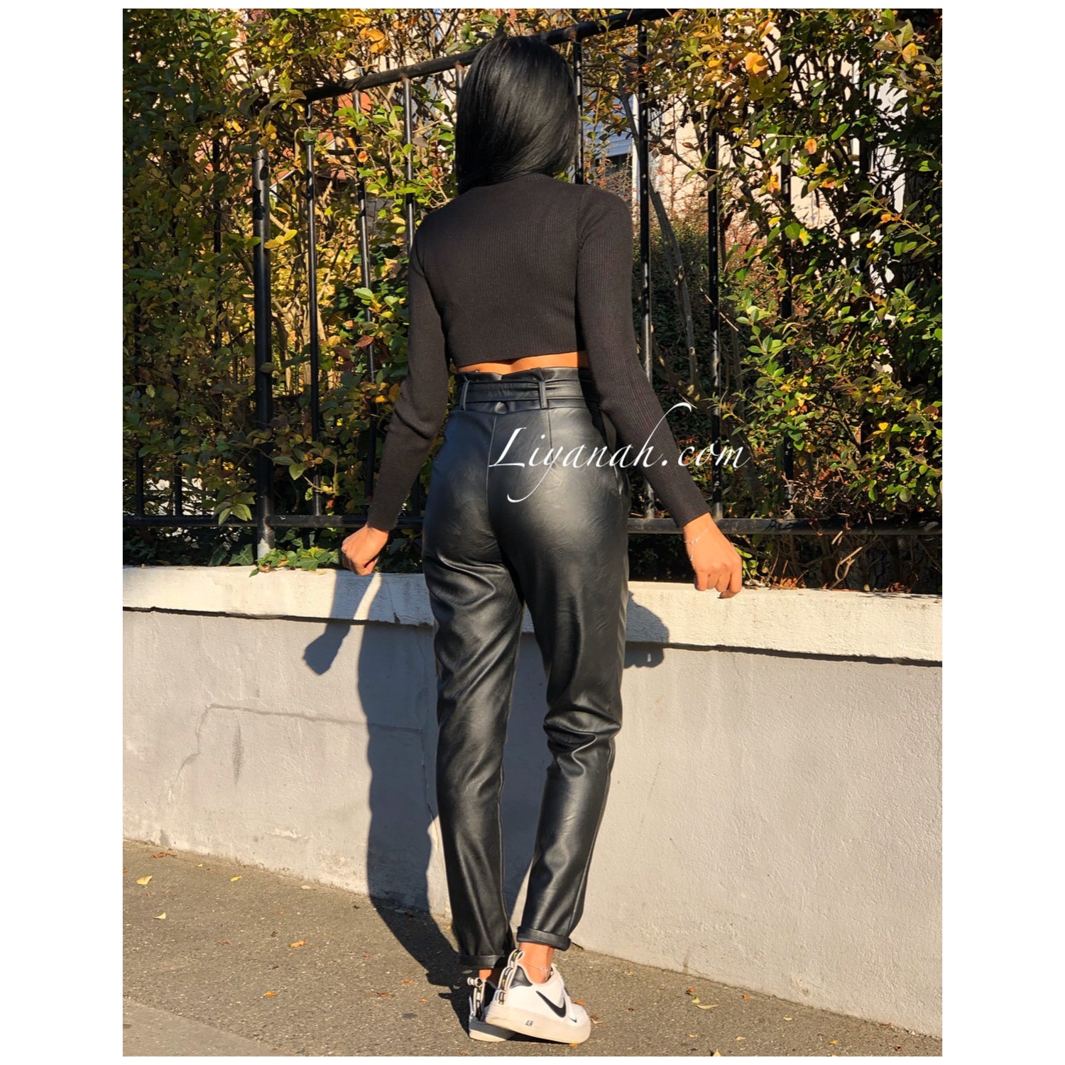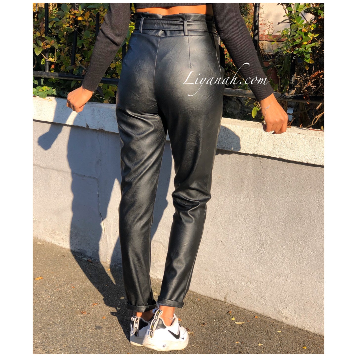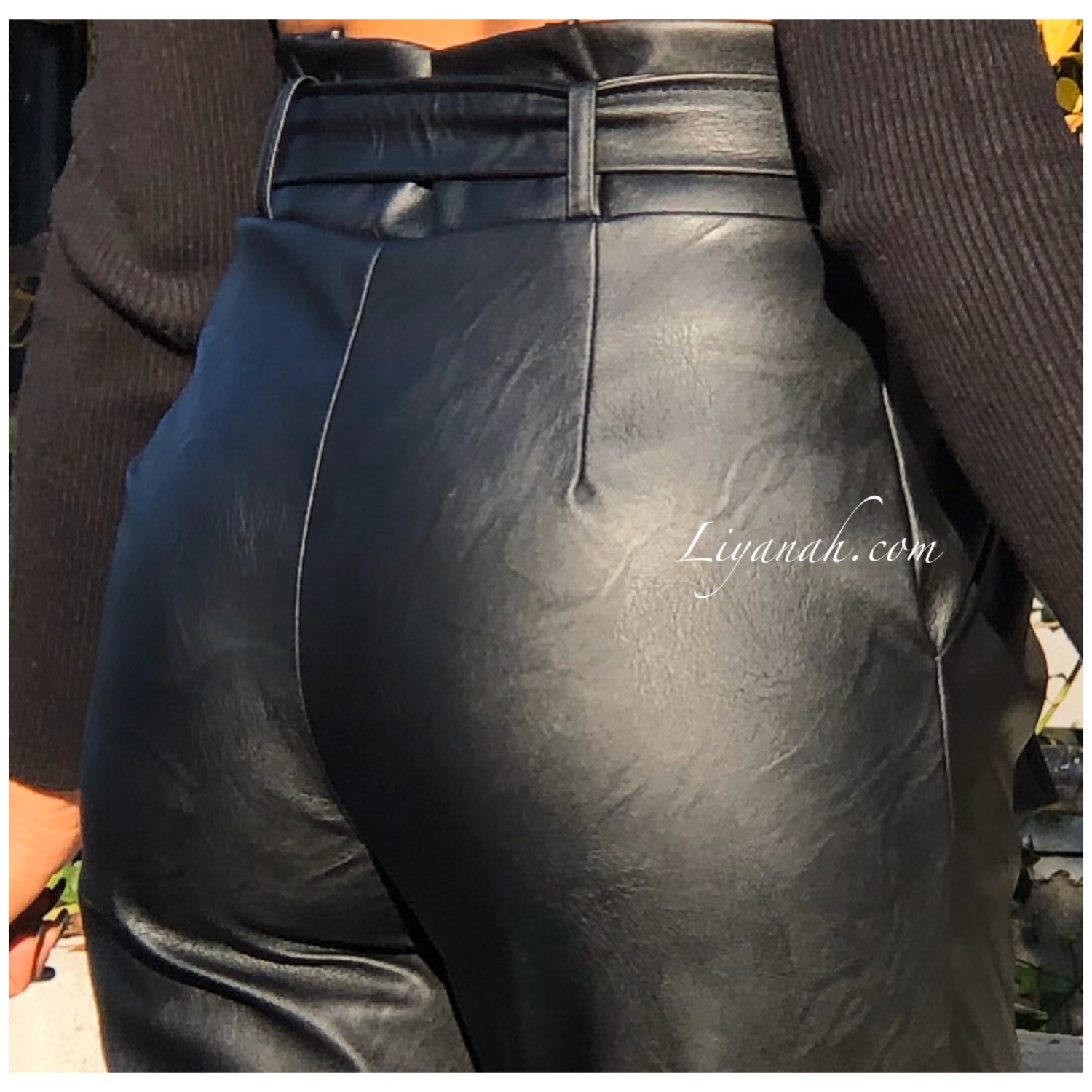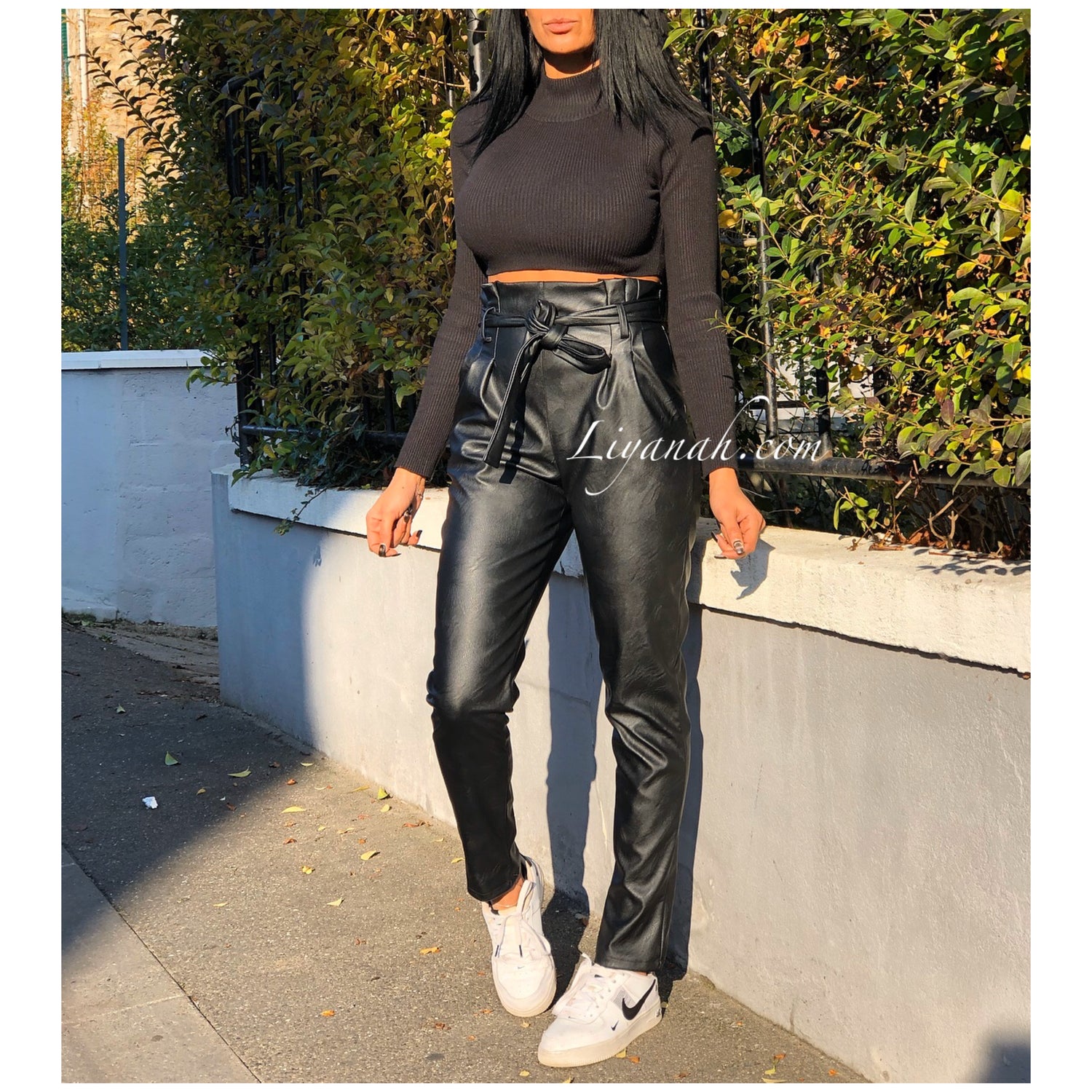 Pantalon Modèle BASSA NOIR - Pantalon taille mi-haute aspect cuir, coupe Droite et légèrement Oversize, noeud à nouer à la taille, fermeture zip sur le côté, deux poches fonctionnelles - 45% PU 55% Polyester - Taille S au L - Notre modèle mesure 1m70, fait une taille 34 et porte une taille S