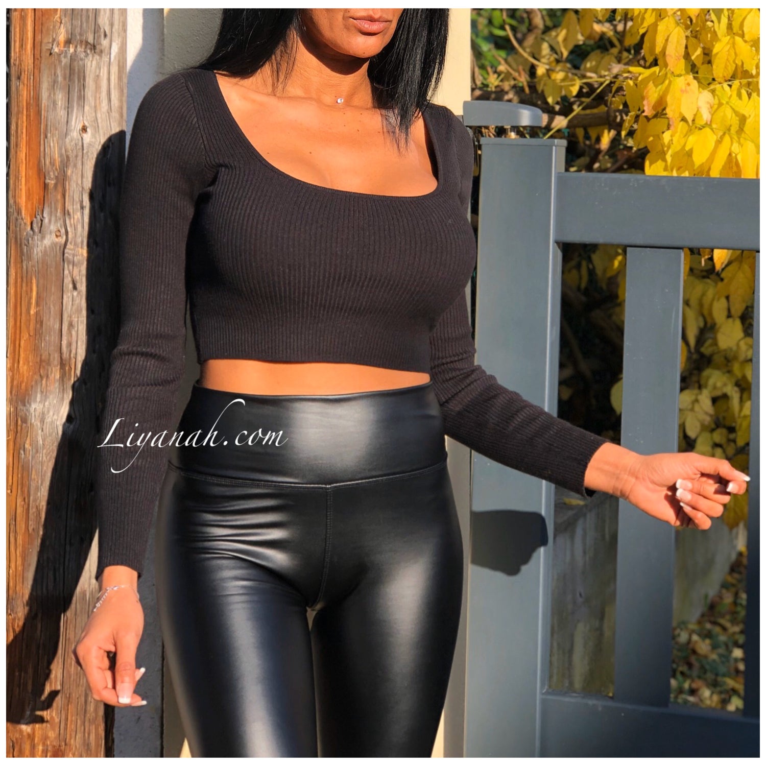 Pull Crop Top Modèle MAVALA NOIR - Pull très court, manches longues, col rond légèrement décolleté et matière côtelé - 85% Viscose 15% Polyester - Taille SM ou ML (Notre modèle porte une taille SM et fait une taille 34)