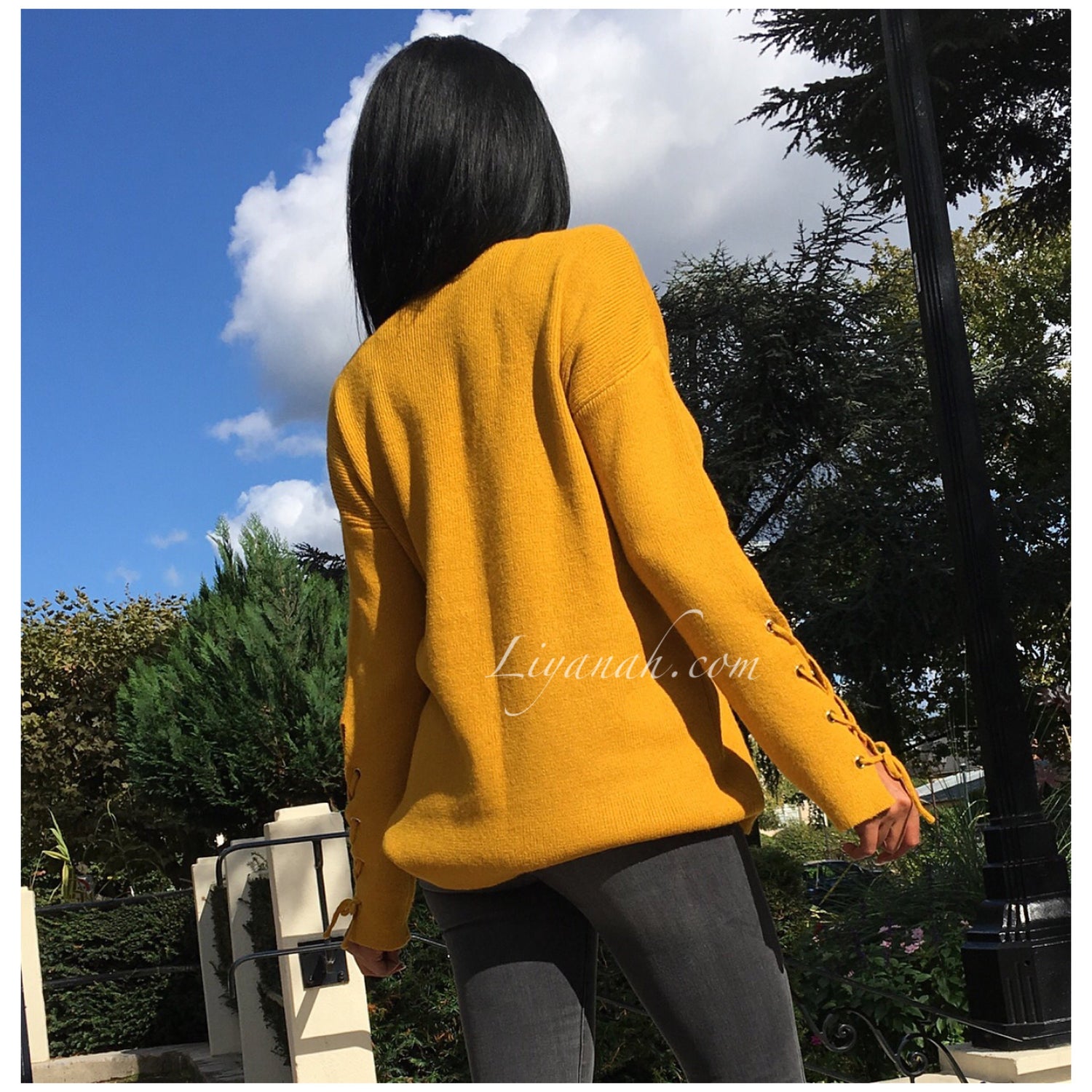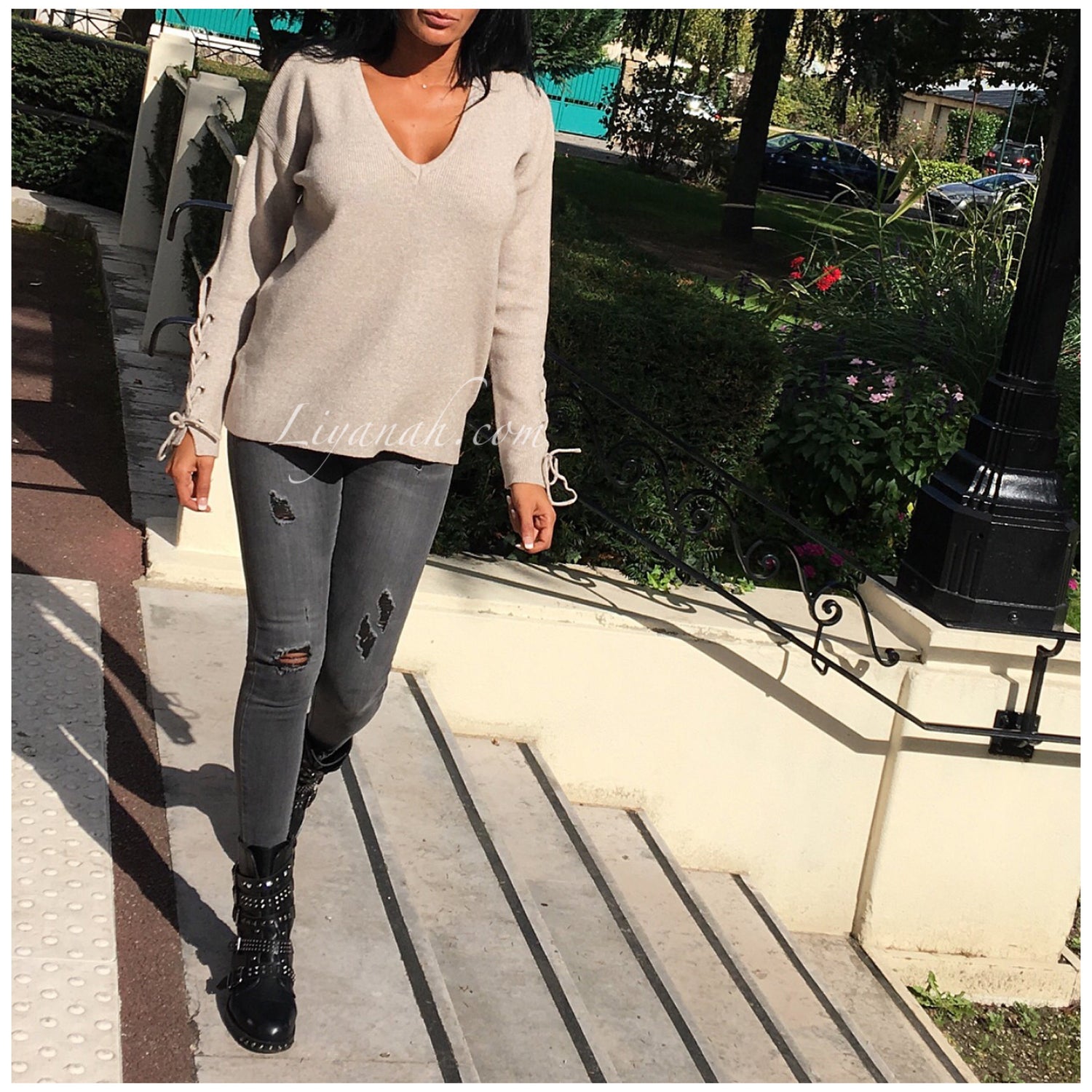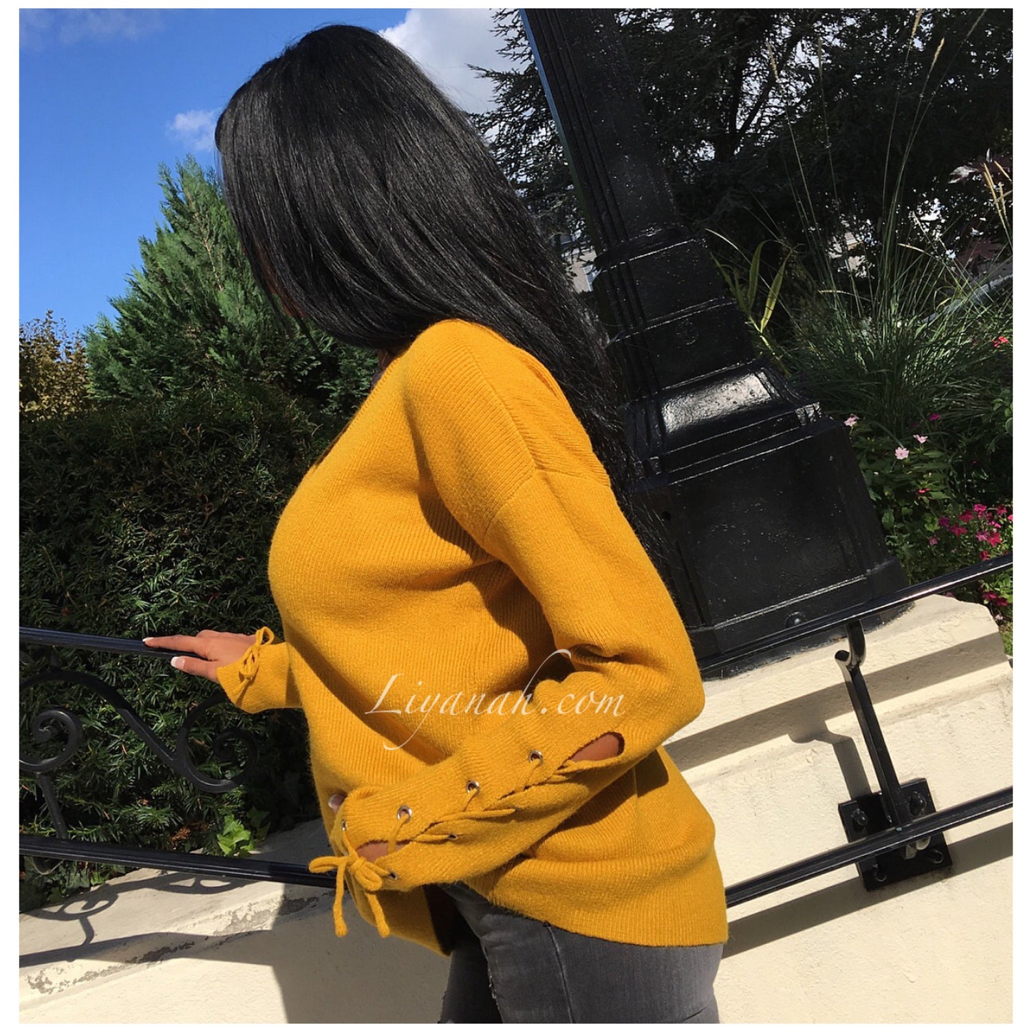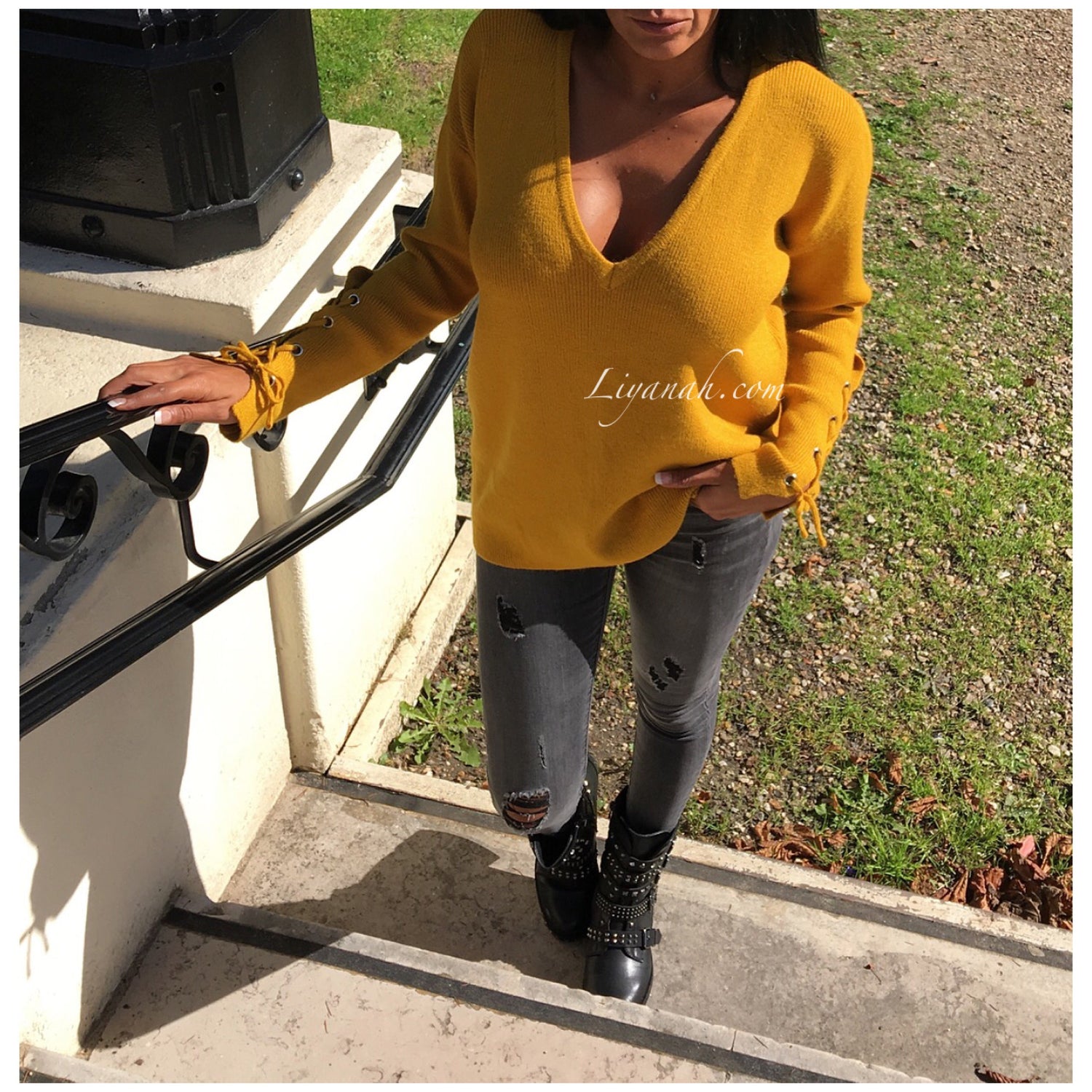 PULL Modèle RAKYL / 6 Couleurs Pull légèrement côtelé mi-long Col V Manches longues Détails : lacets aux manches Couleurs disponibles : Noir, Moutarde, Bordeaux, Kaki, Beige, Gris et Bleu Marine Taille Unique (34 au 40) 56% Viscose 18% Nylon 26% Polyester