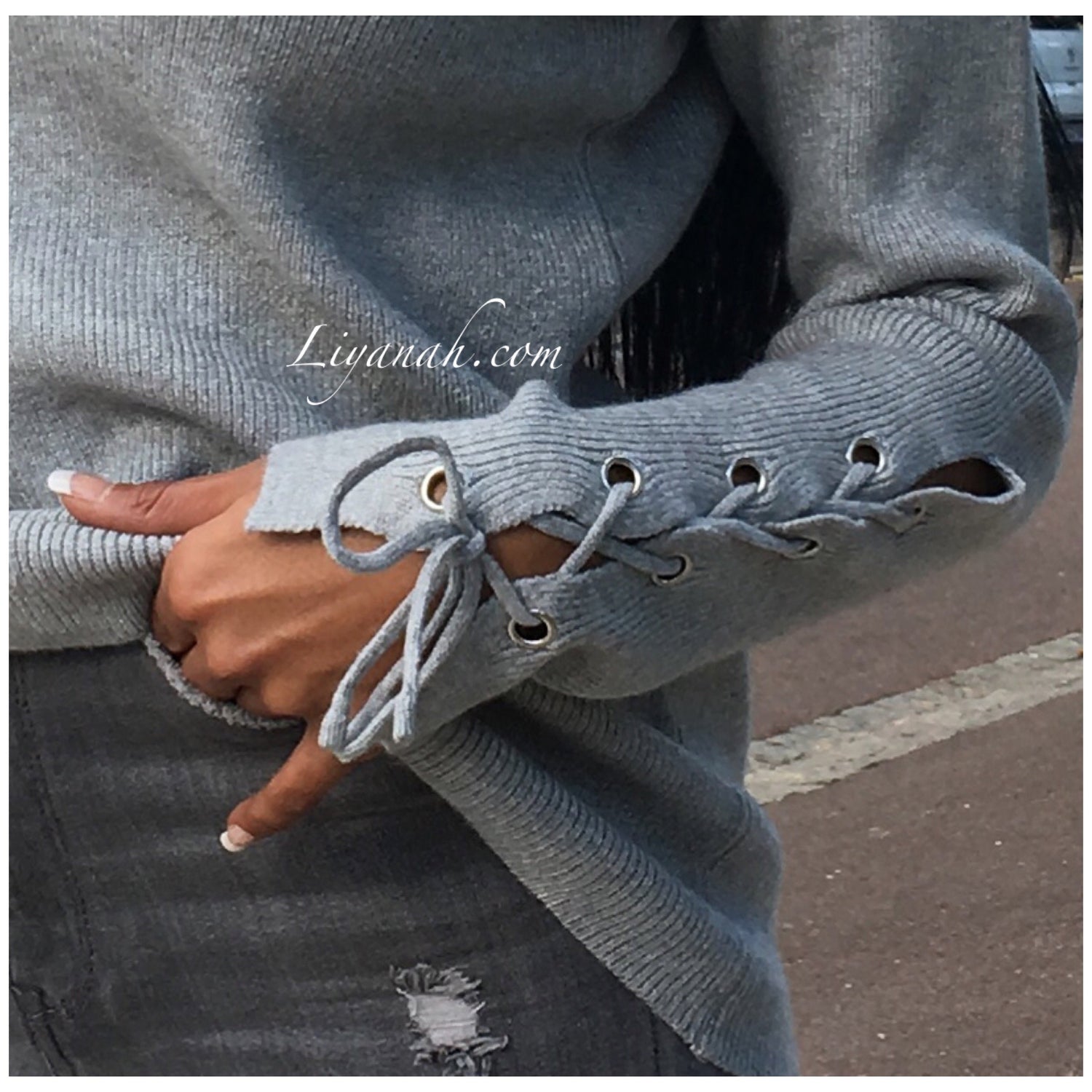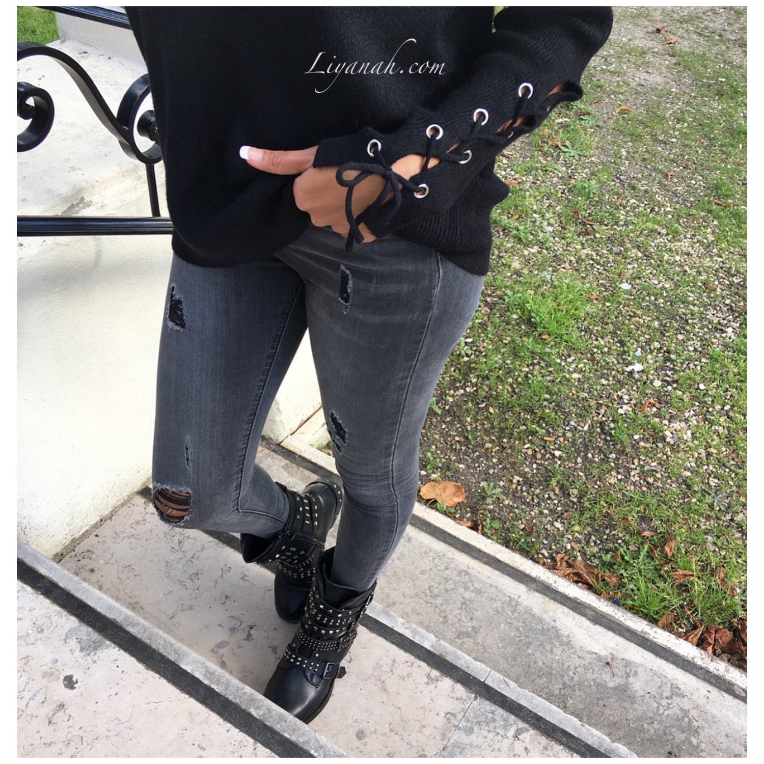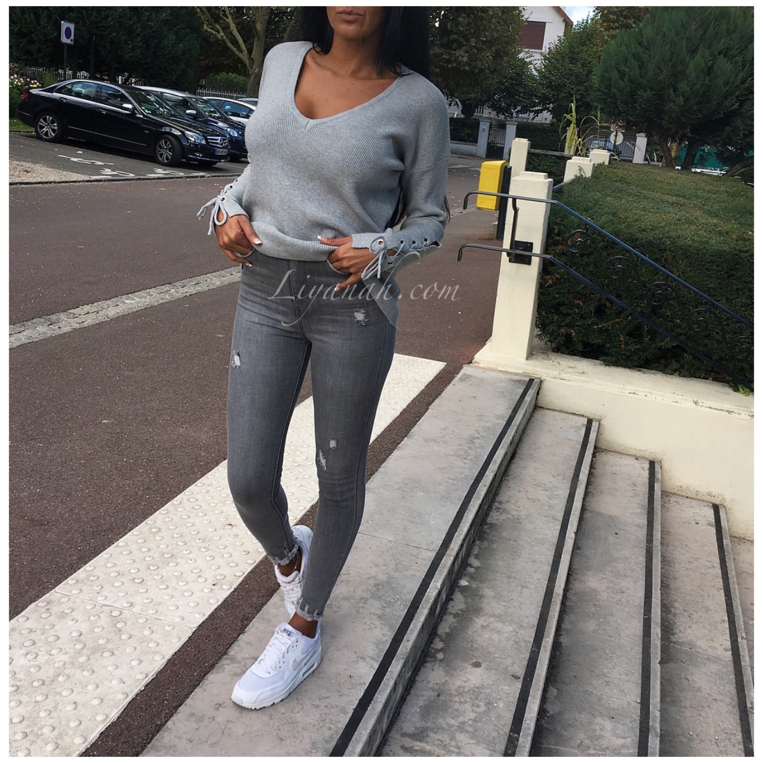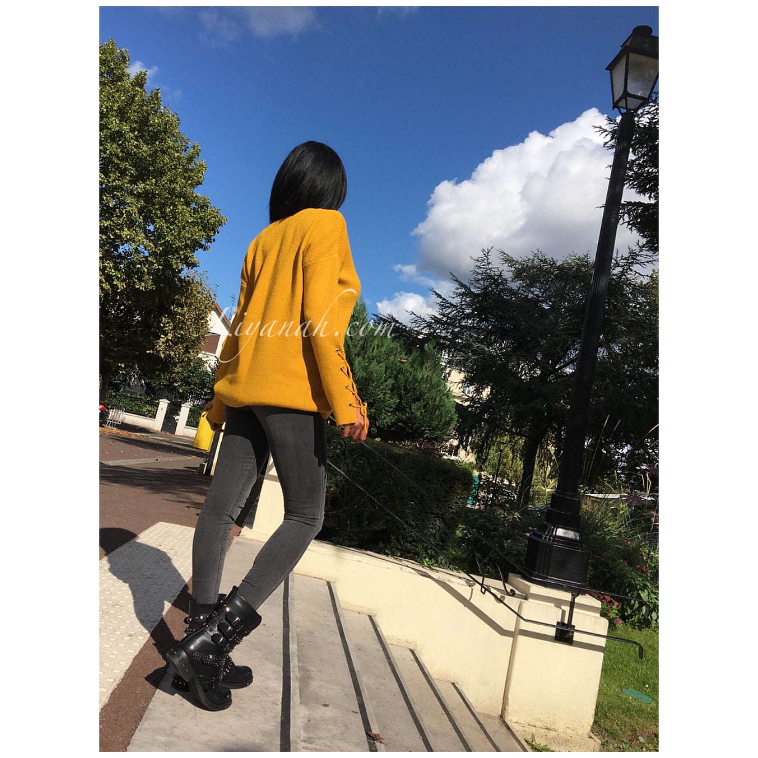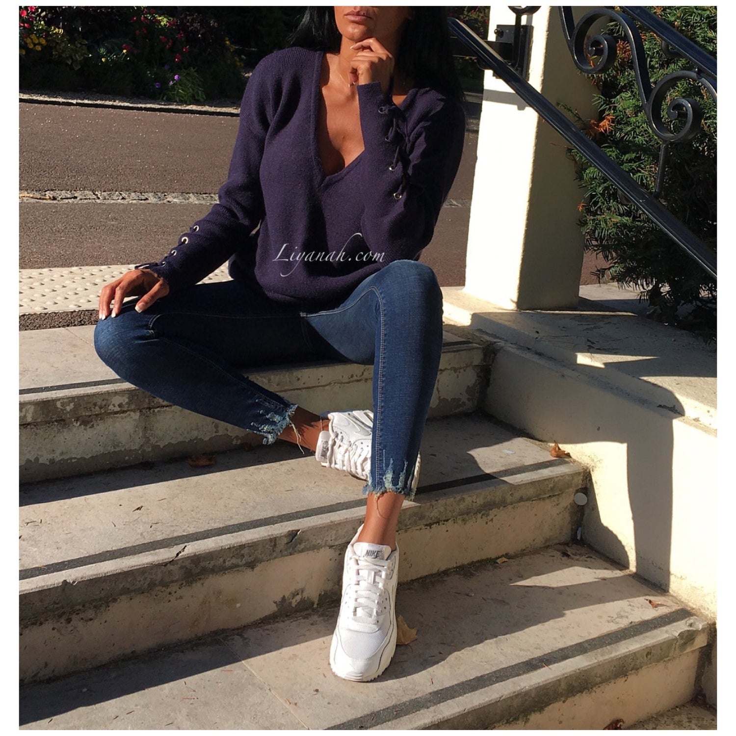 PULL Modèle RAKYL / 6 Couleurs Pull légèrement côtelé mi-long Col V Manches longues Détails : lacets aux manches Couleurs disponibles : Noir, Moutarde, Bordeaux, Kaki, Beige, Gris et Bleu Marine Taille Unique (34 au 40) 56% Viscose 18% Nylon 26% Polyester