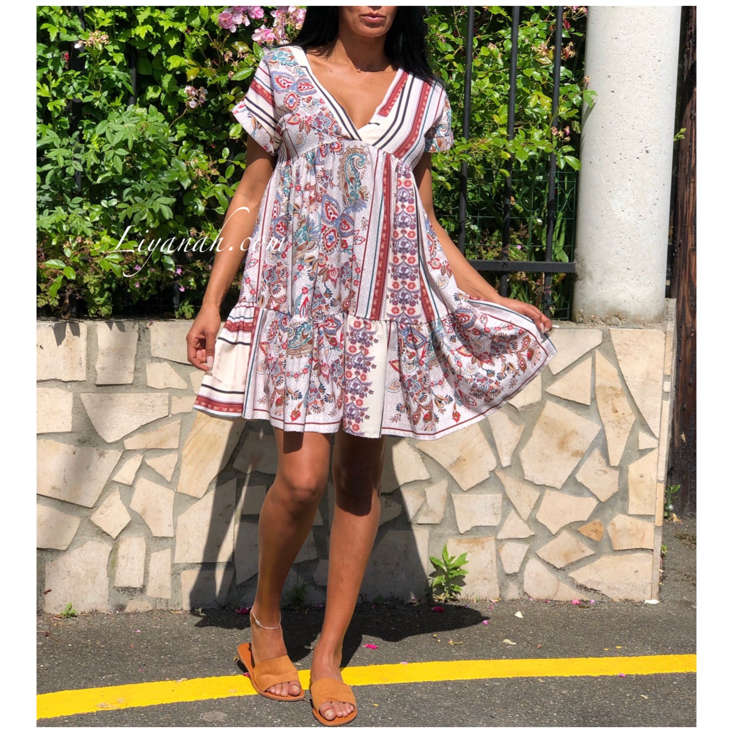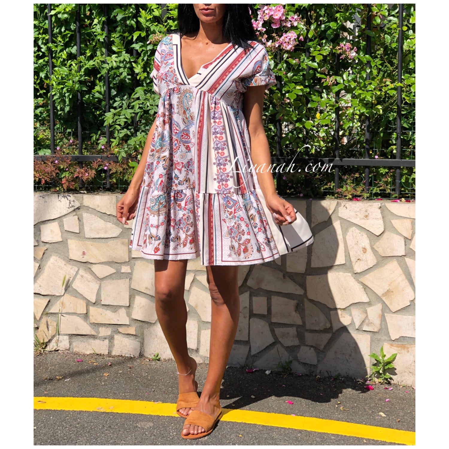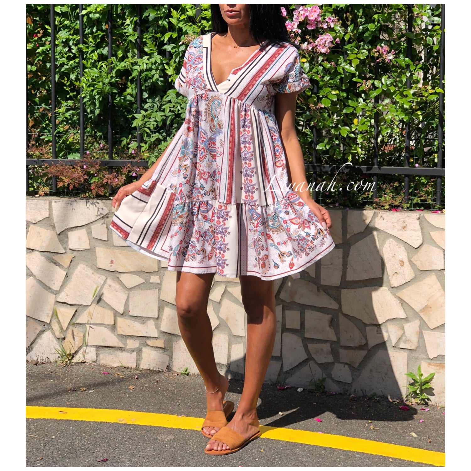 ROBE Courte Style Tunique à enfiler !!! Robe à Imprimée Évasée, fluide et décontractée, Taille Unique pour une taille 34 au 38 - 95% Polyester 5% Elasthanne - Matière légèrement épaisse et Fluide  - AGRÉABLE À PORTER