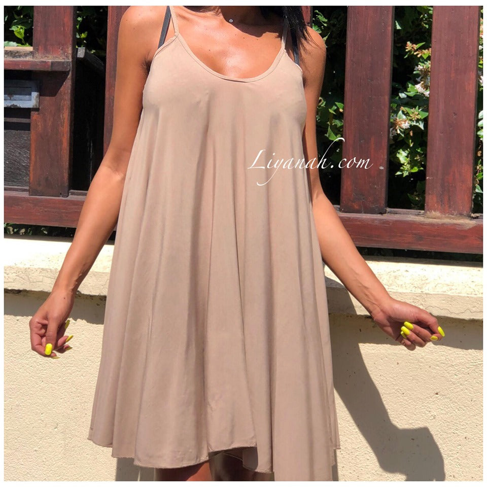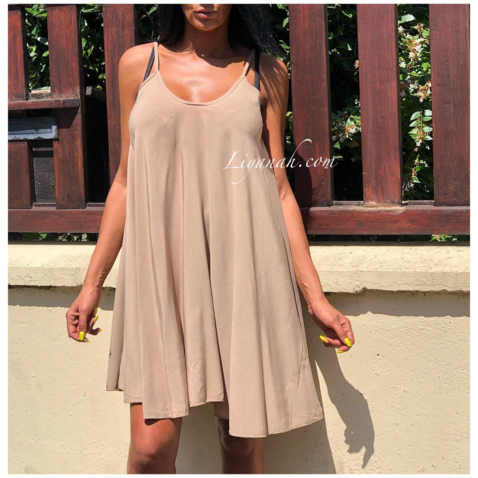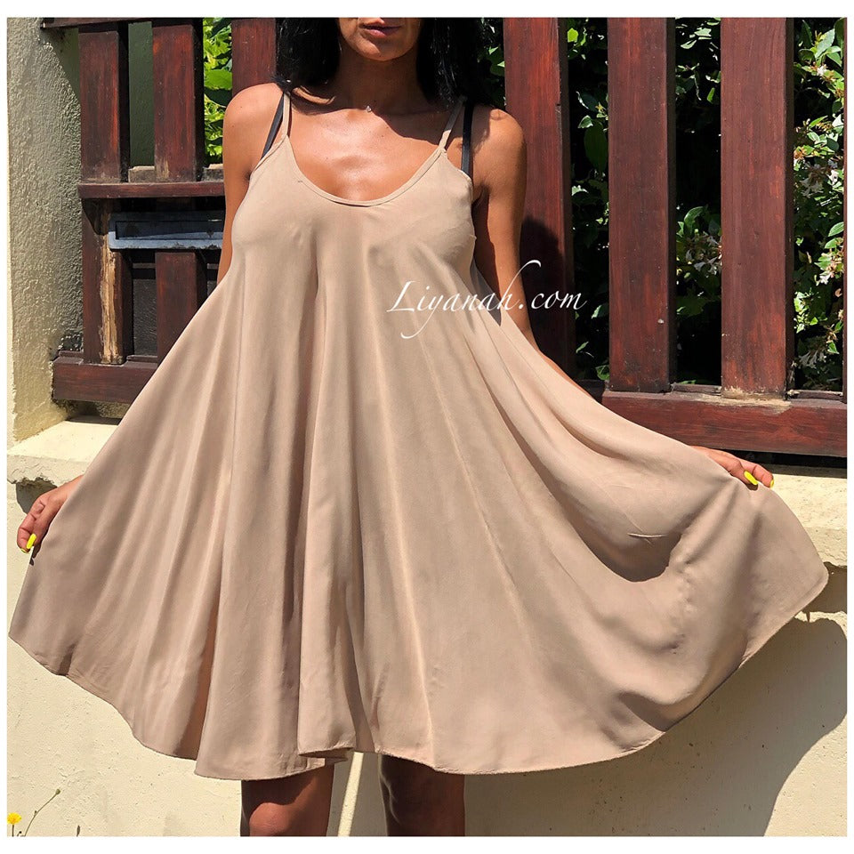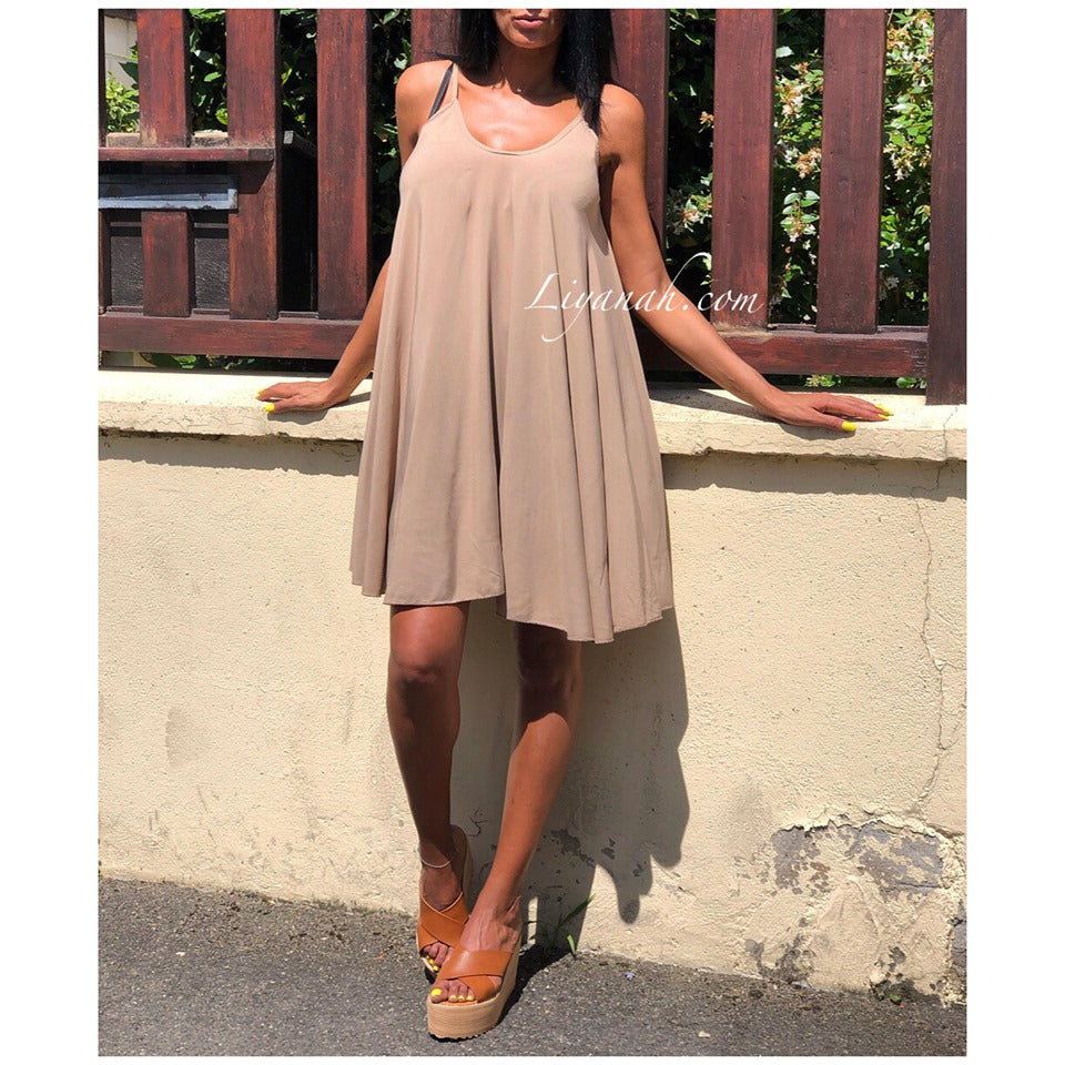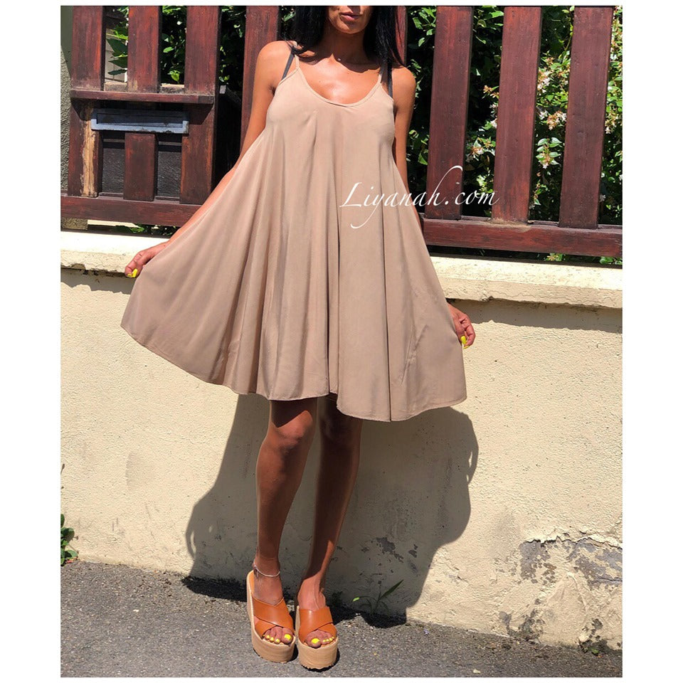 Robe Courte Modèle JENY BEIGE - Robe à enfiler à bretelles fines non réglables - Coupe trapèze et large - Confort et Style, modèle évasé et fluide - Tout en simplicité ❤️100% Viscose - Taille Unique du 34 au 40
