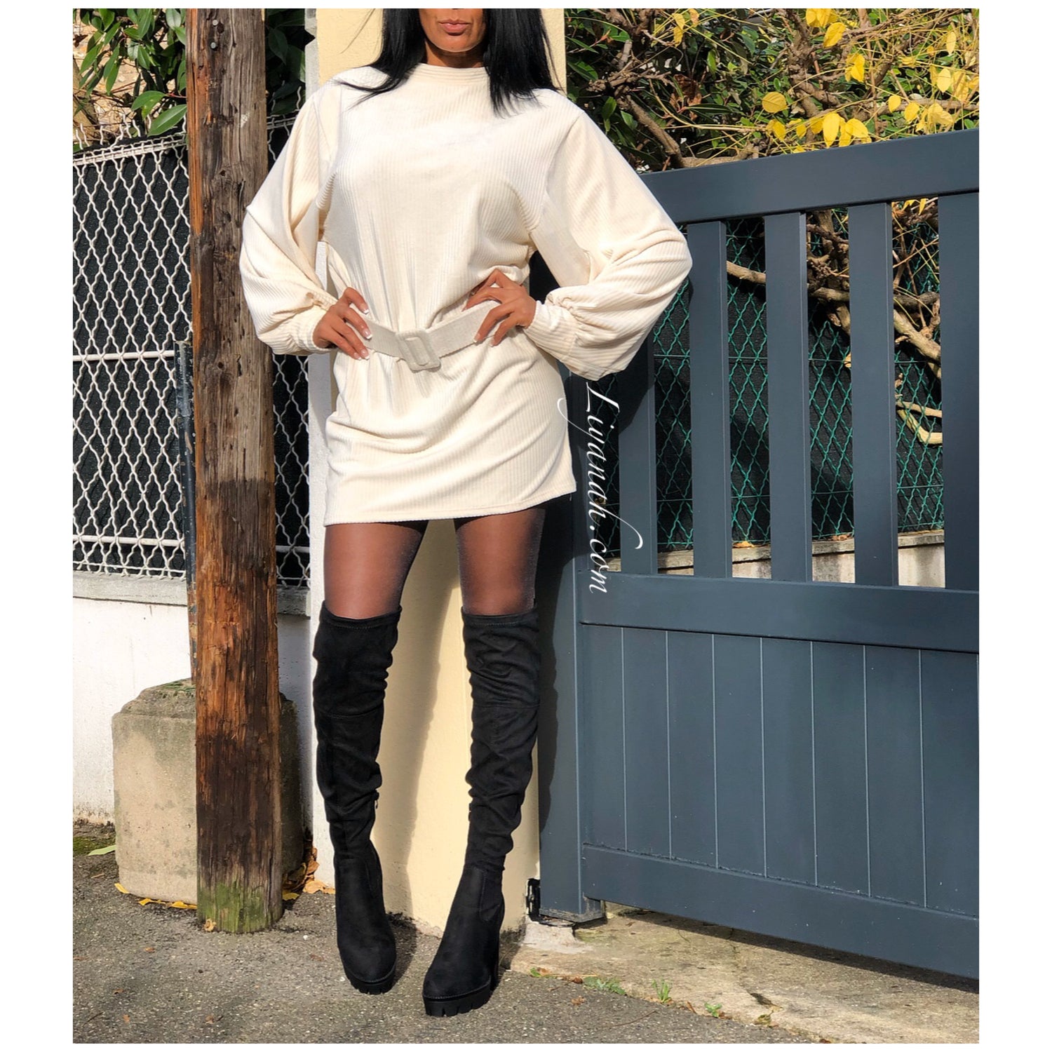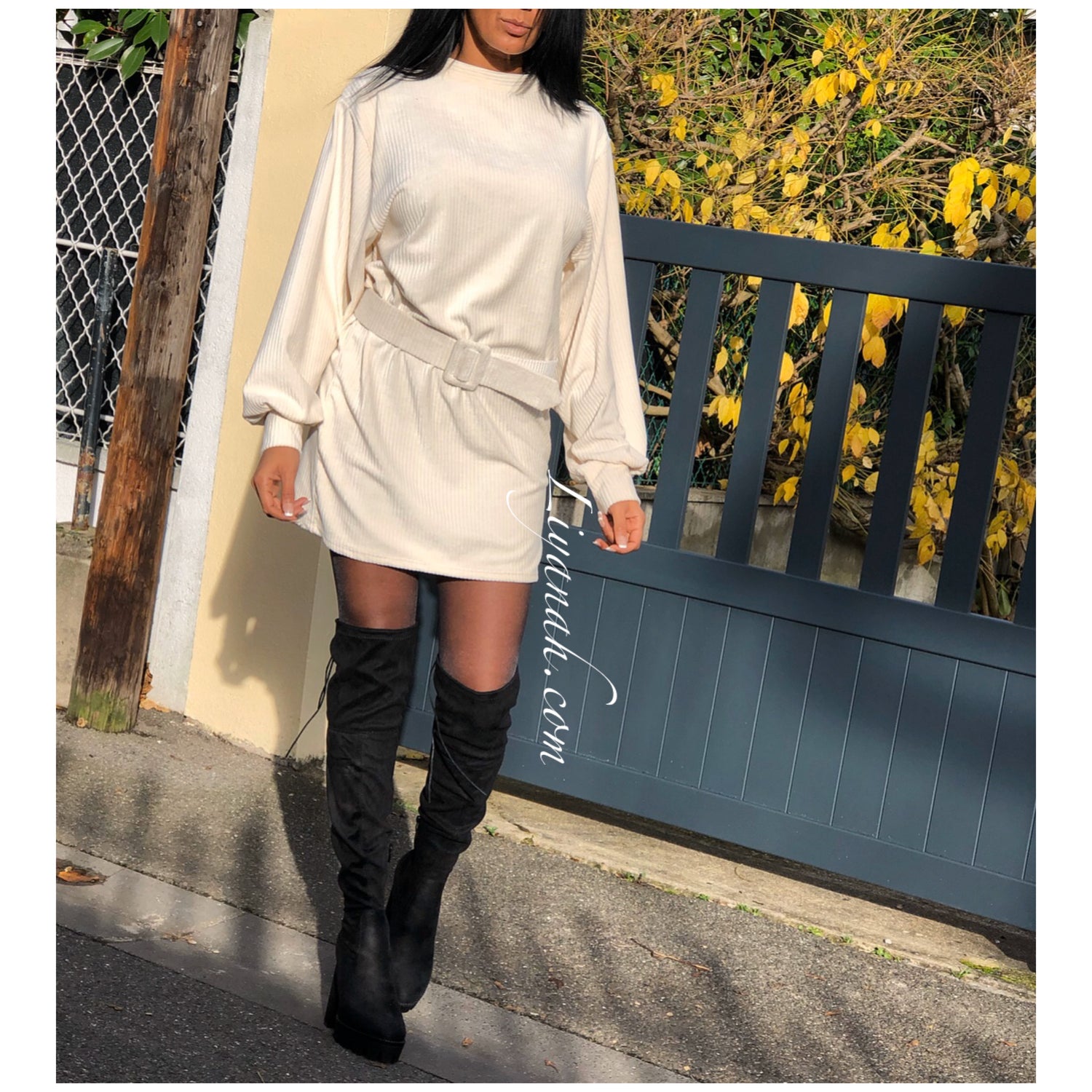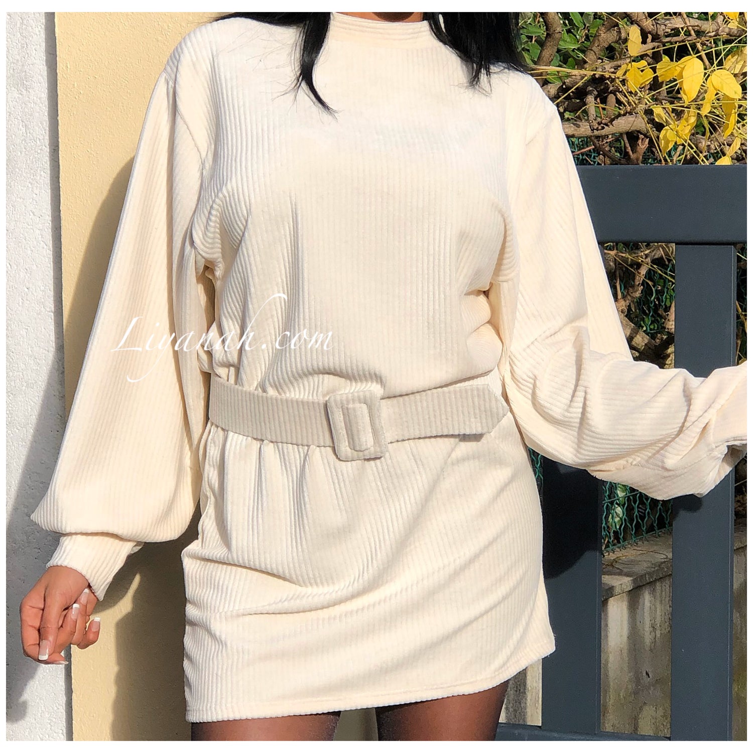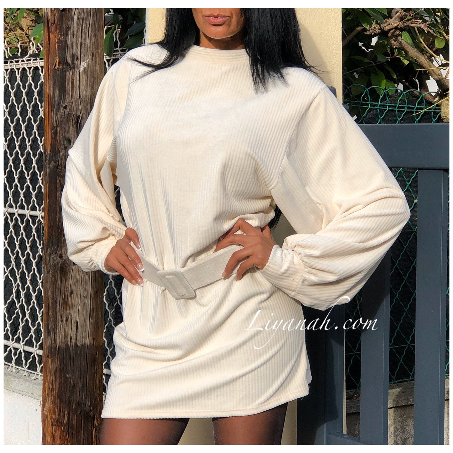 ROBE Courte Modèle RAWEN ÉCRU - Robe courte à enfiler !!! Légèrement cintrée aux hanches, très évasée en haut et manches larges resserrer aux poignets, matière côtelé, douce et agréable à porter - ASPECT VELOURS - modèle muni d’une ceinture à enfiler - Taille Unique pour une taille 34 au 40 - 95% Polyester 5% Elasthanne - Longueur : 85 cm