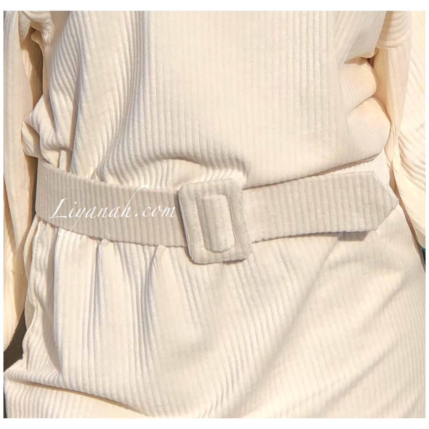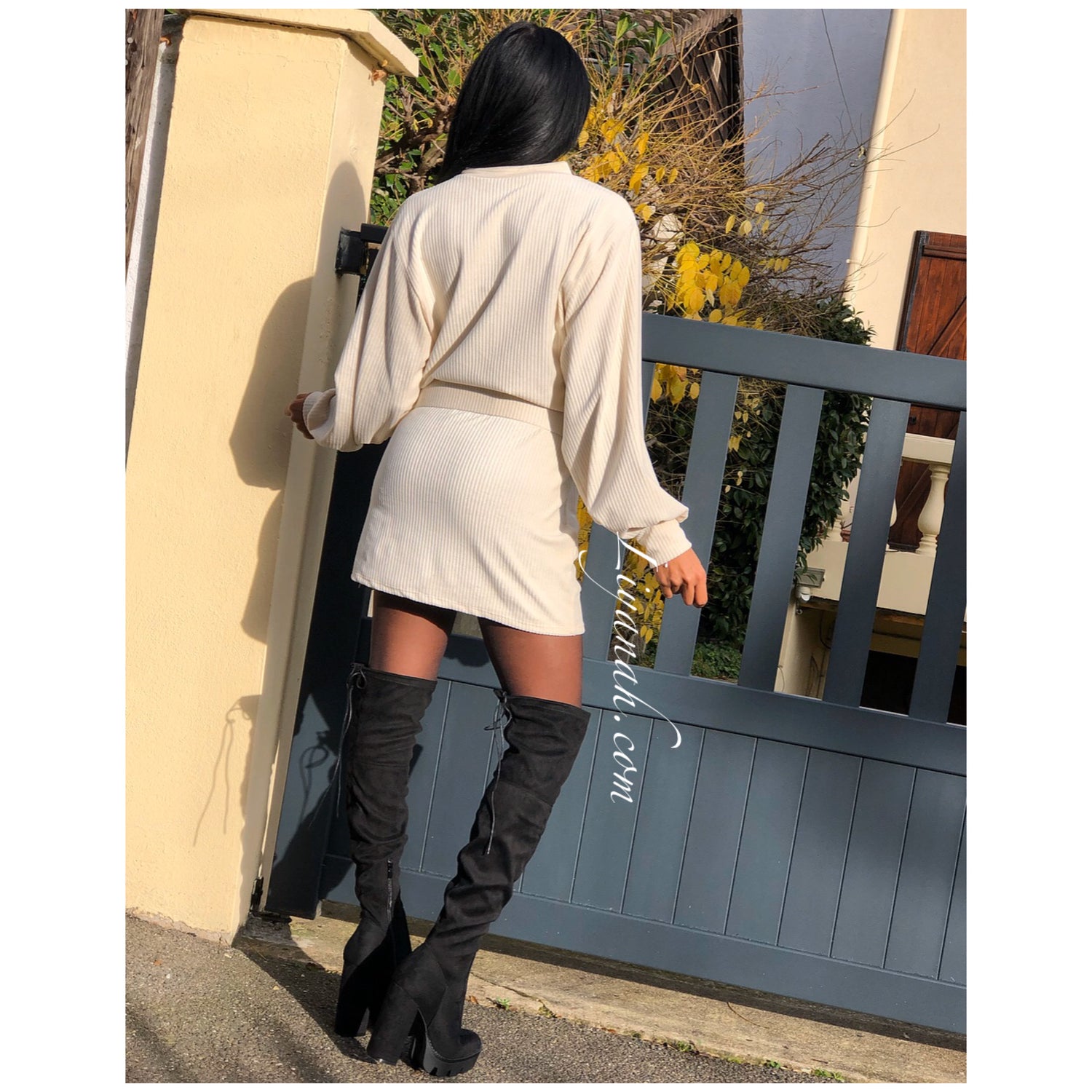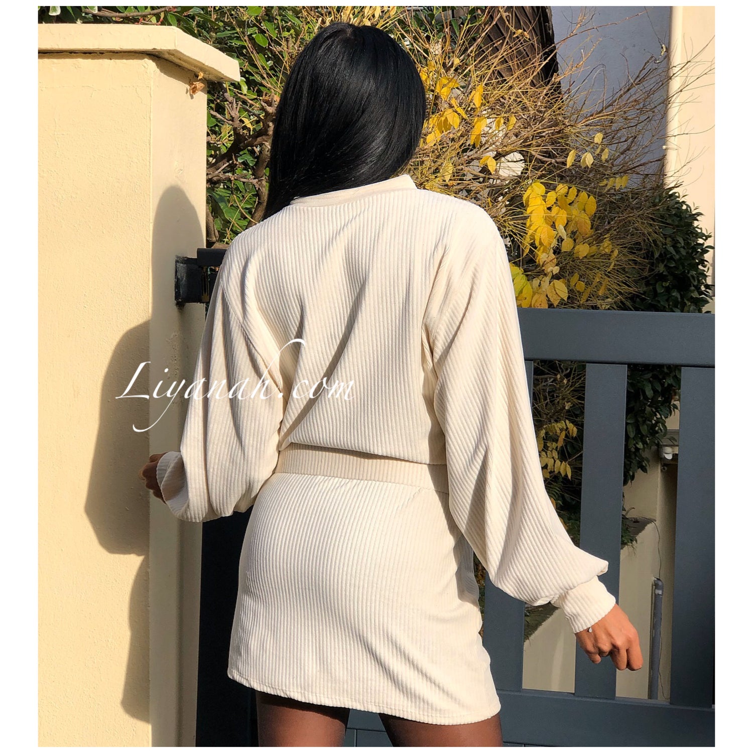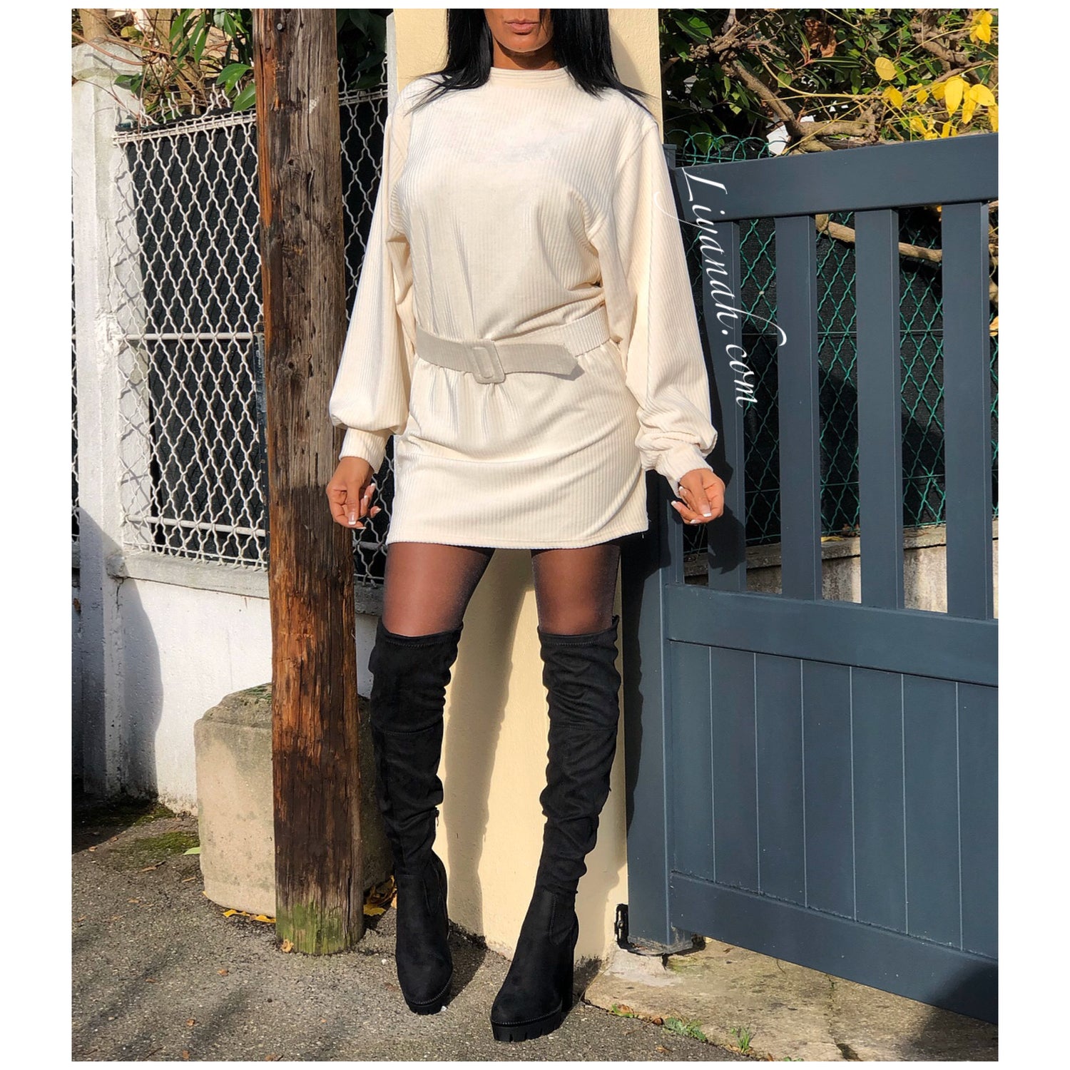 ROBE Courte Modèle RAWEN ÉCRU - Robe courte à enfiler !!! Légèrement cintrée aux hanches, très évasée en haut et manches larges resserrer aux poignets, matière côtelé, douce et agréable à porter - ASPECT VELOURS - modèle muni d’une ceinture à enfiler - Taille Unique pour une taille 34 au 40 - 95% Polyester 5% Elasthanne - Longueur : 85 cm