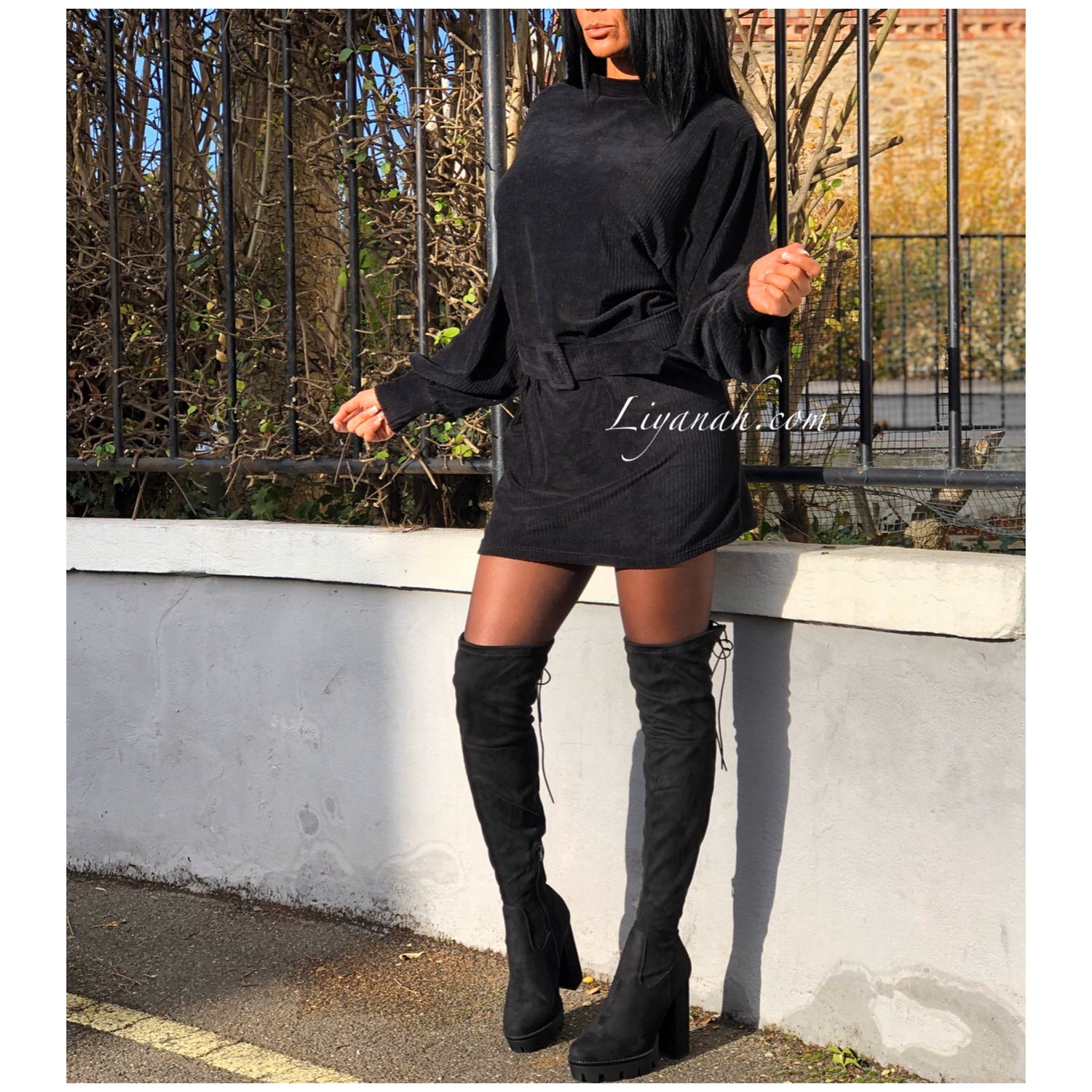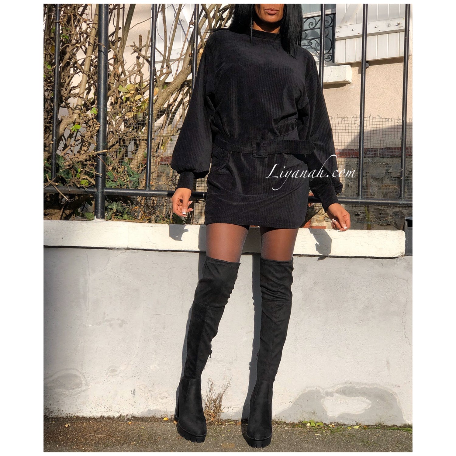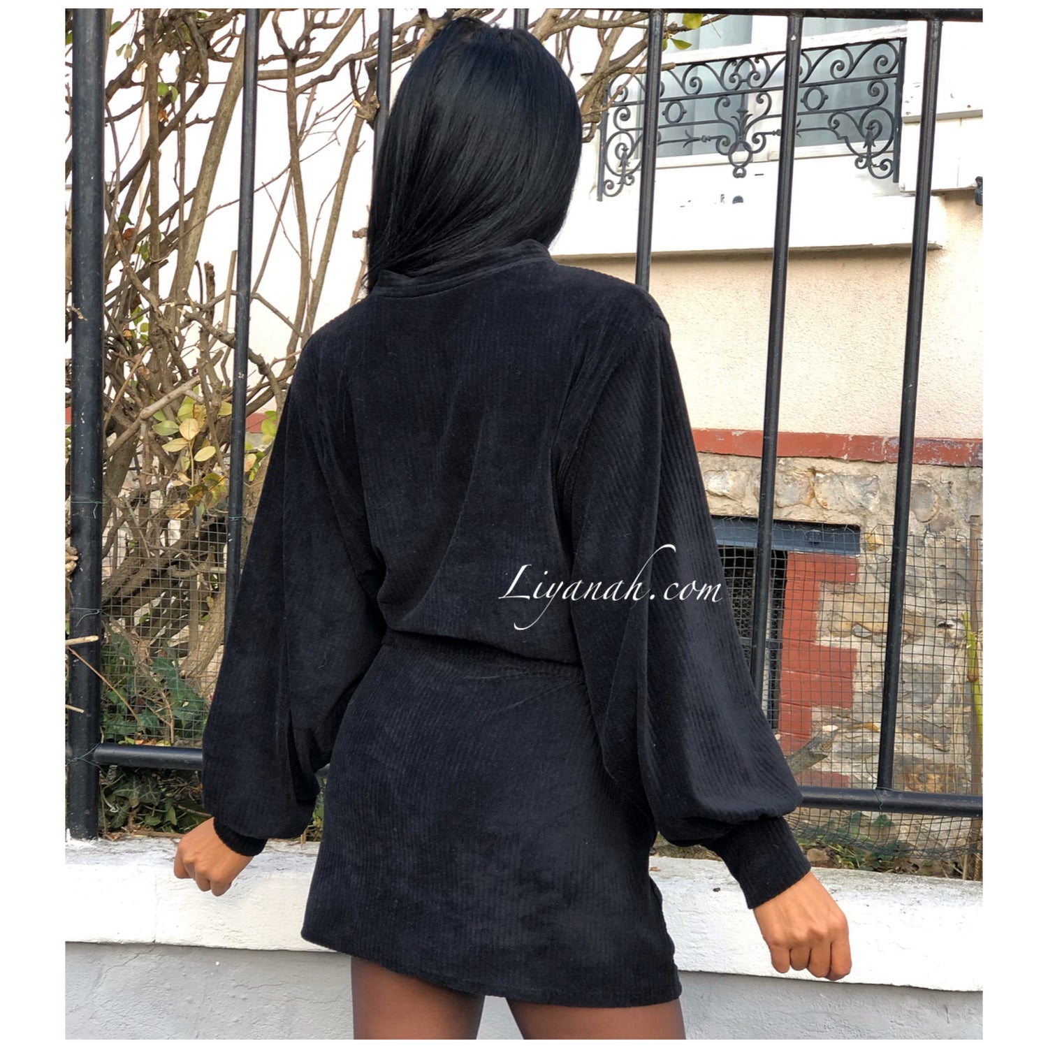 ROBE Courte Modèle RAWEN NOIR - Robe courte à enfiler !!! Légèrement cintrée aux hanches, très évasée en haut et manches larges resserrer aux poignets, matière côtelé, douce et agréable à porter - ASPECT VELOURS - modèle muni d’une ceinture à enfiler - Taille Unique pour une taille 34 au 40 - 95% Polyester 5% Elasthanne - Longueur : 85 cm