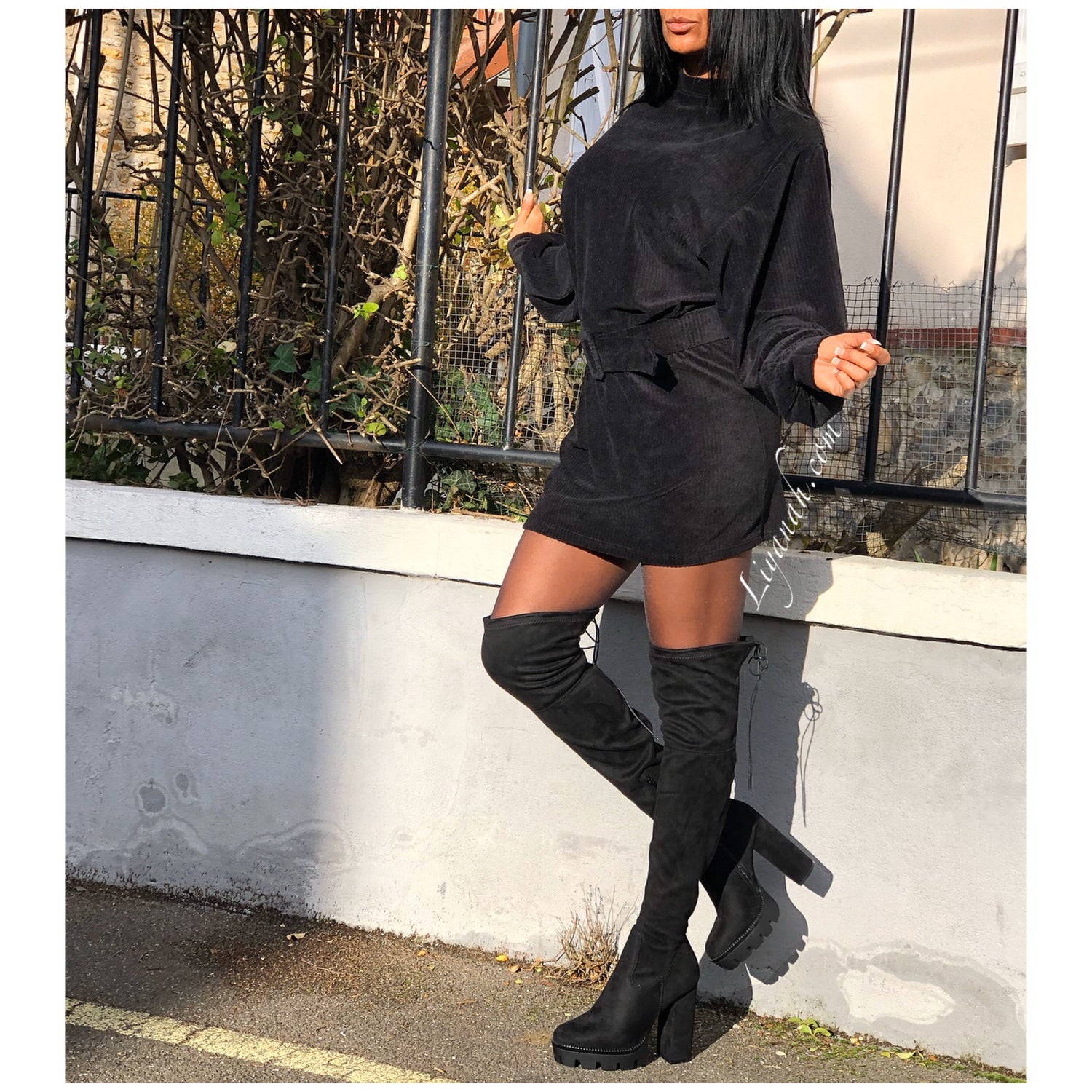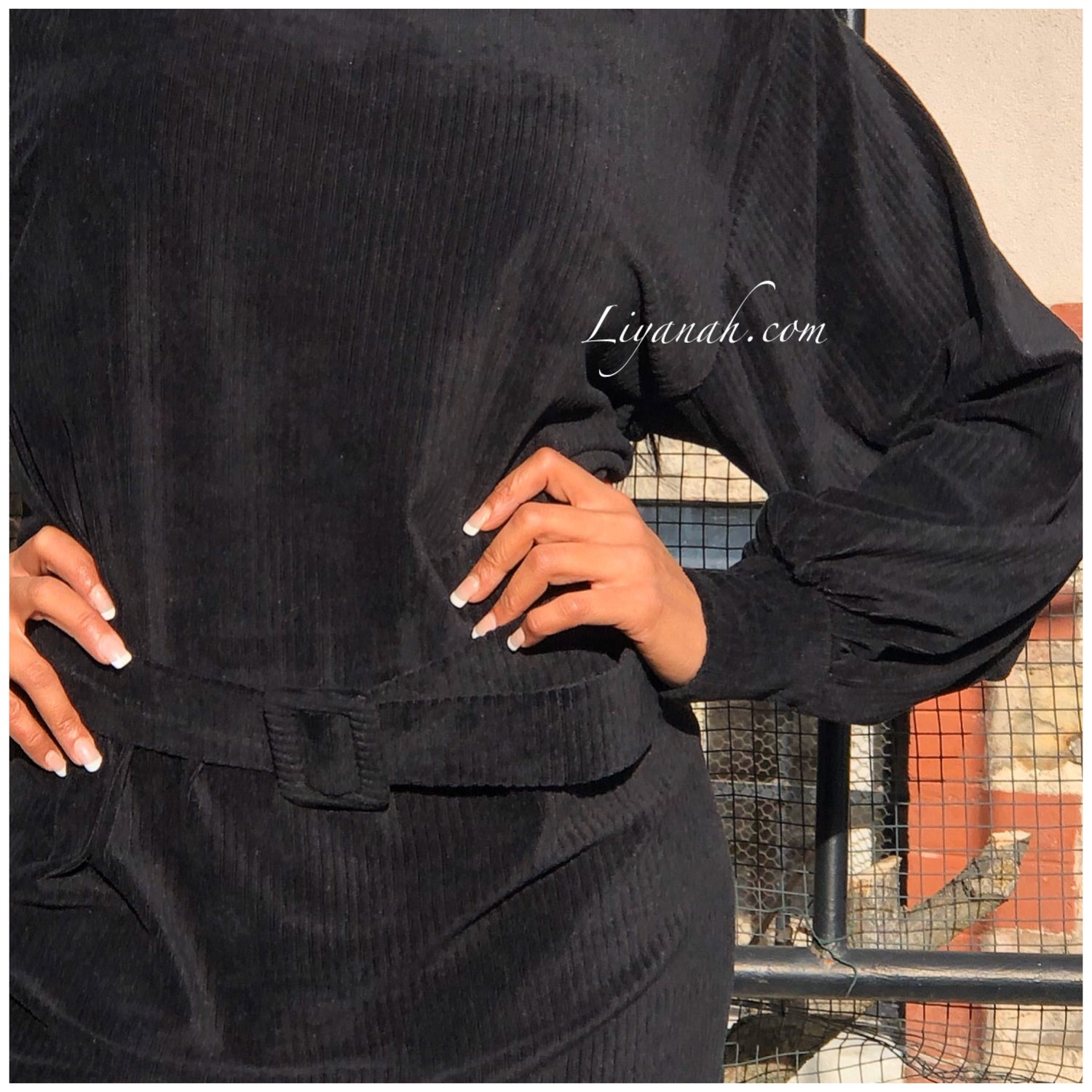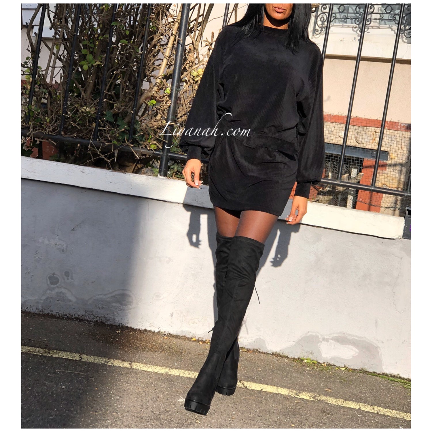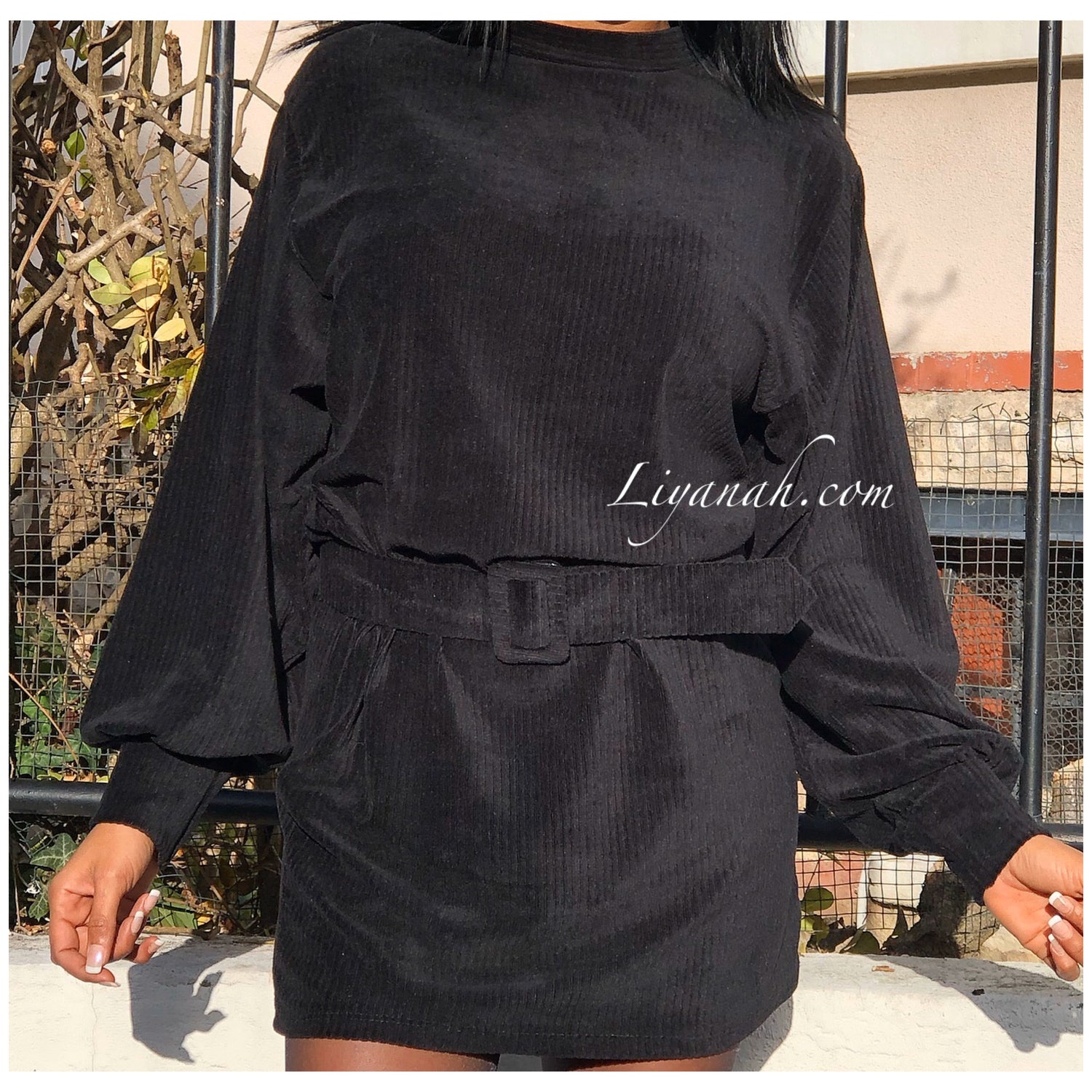 ROBE Courte Modèle RAWEN NOIR - Robe courte à enfiler !!! Légèrement cintrée aux hanches, très évasée en haut et manches larges resserrer aux poignets, matière côtelé, douce et agréable à porter - ASPECT VELOURS - modèle muni d’une ceinture à enfiler - Taille Unique pour une taille 34 au 40 - 95% Polyester 5% Elasthanne - Longueur : 85 cm
