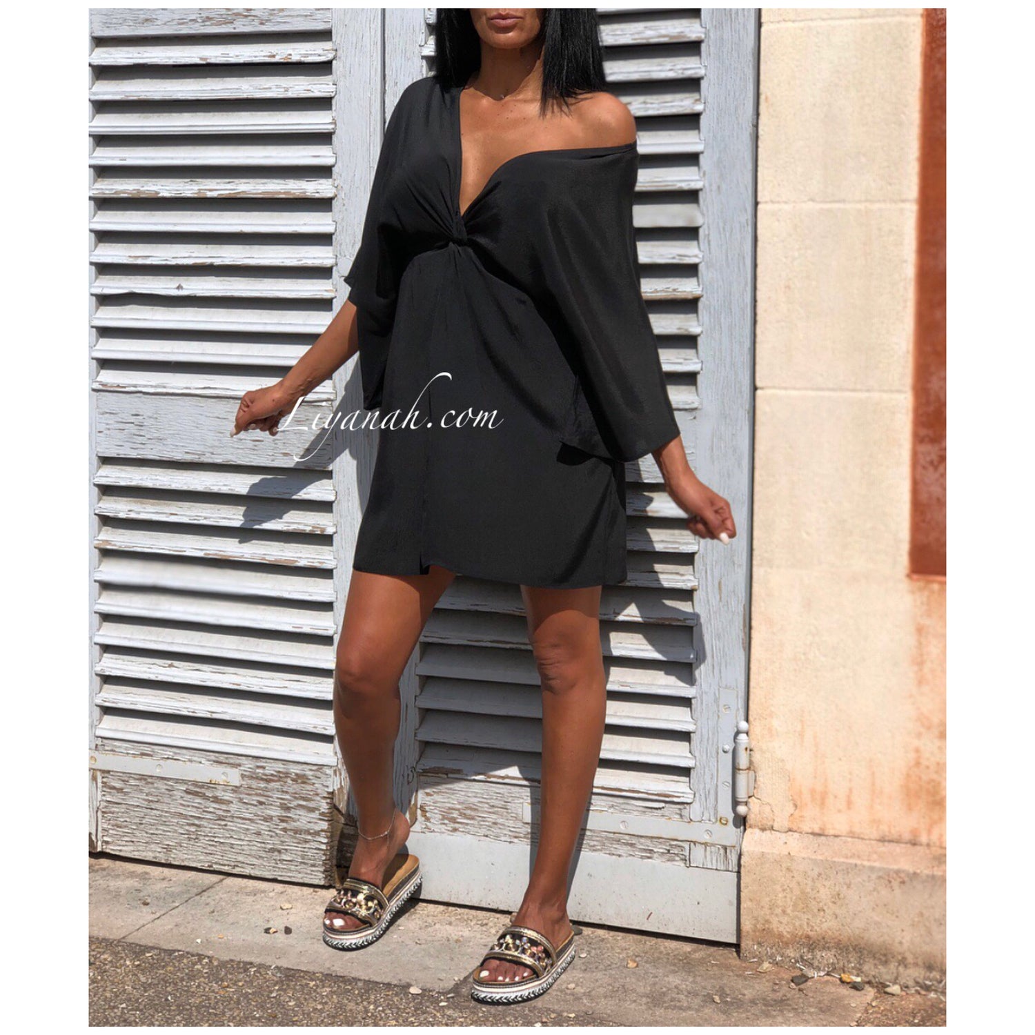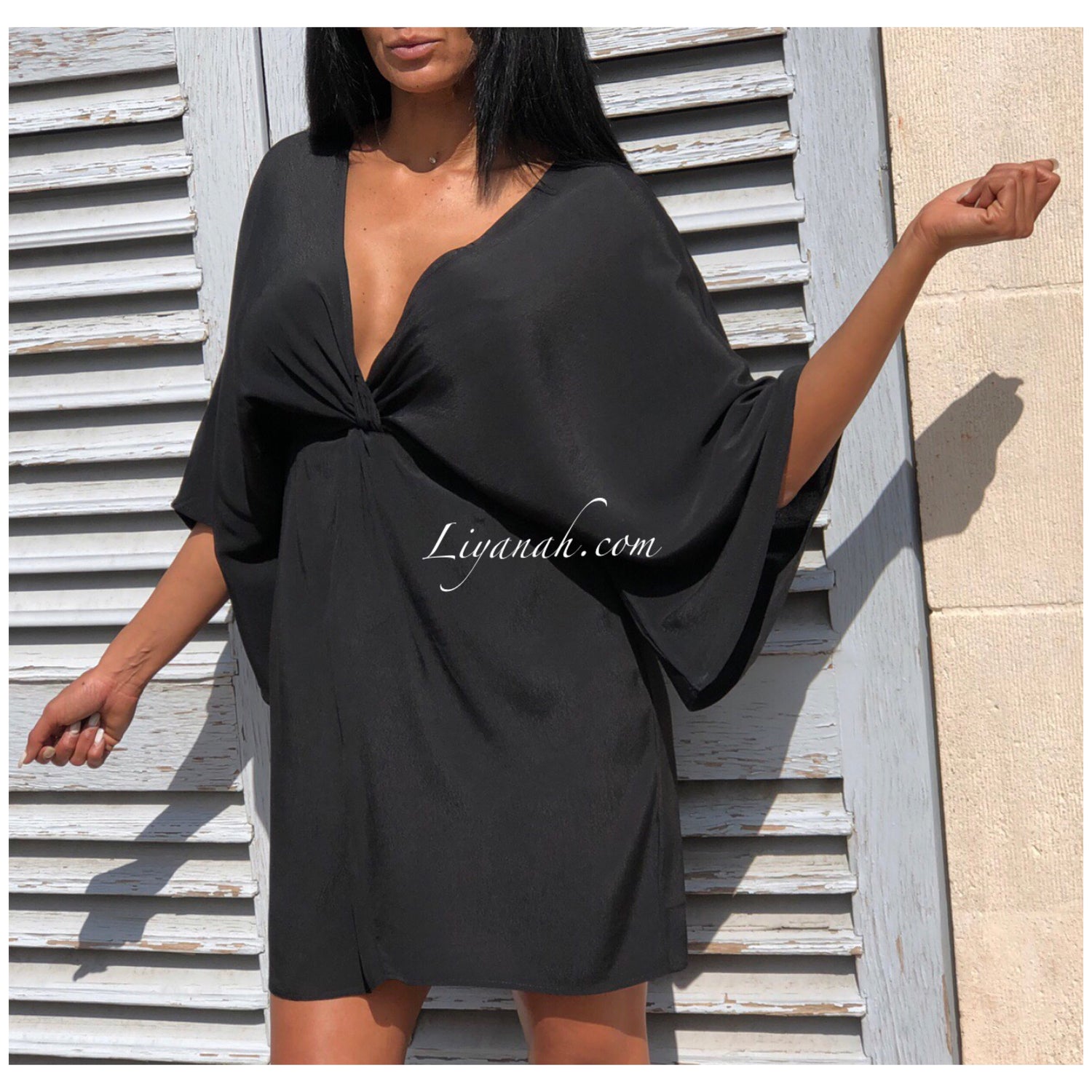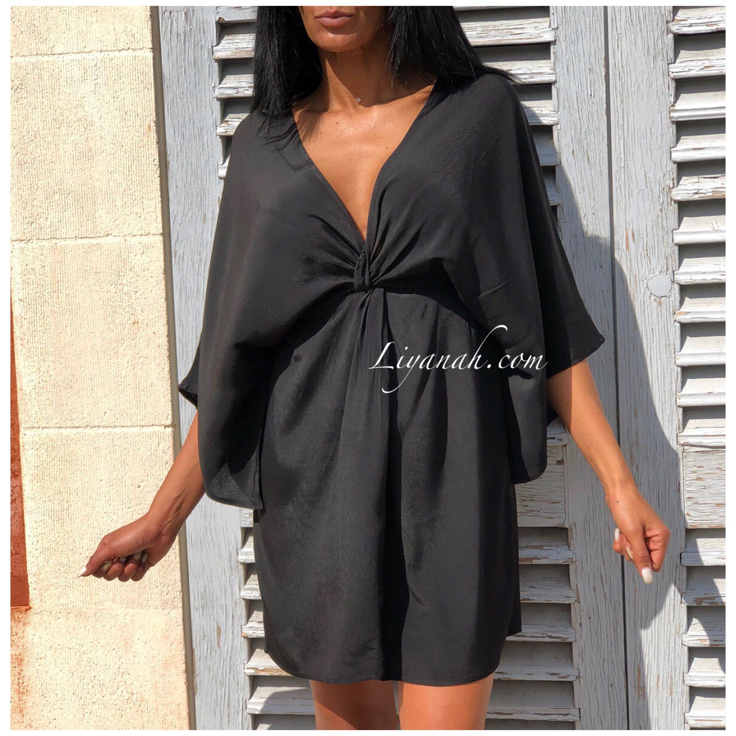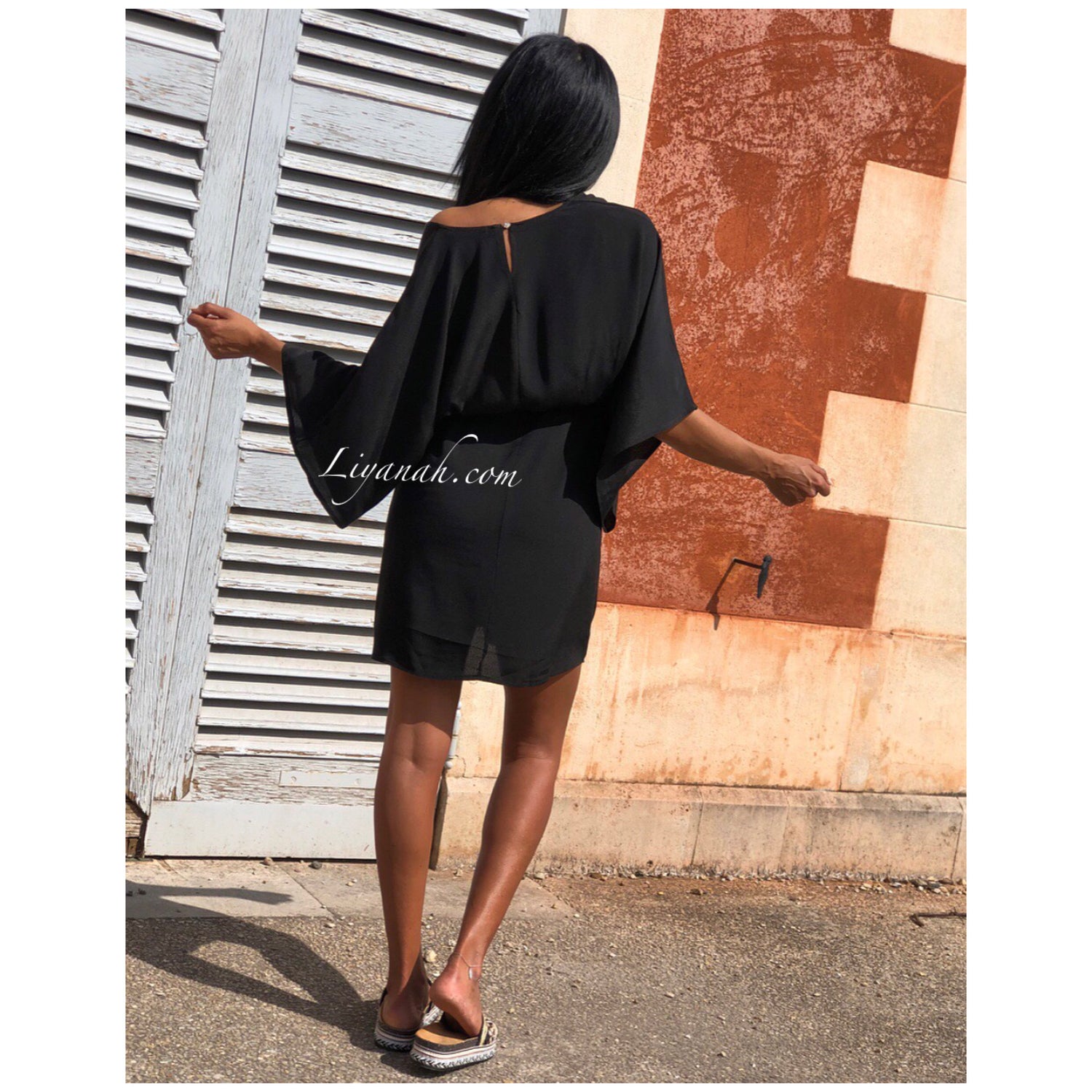 Robe Courte Modèle YELYNA NOIR - Robe courte style robe de plage, couture fixe nouer sous la poitrine pour un jolie décolleté plongeant et manches évasées, fermeture bouton au cou à l’arrière, élastique à la taille, Matière fluide et agréable à porter - Taille 34/36 ou 38/40 - 100% Polyester