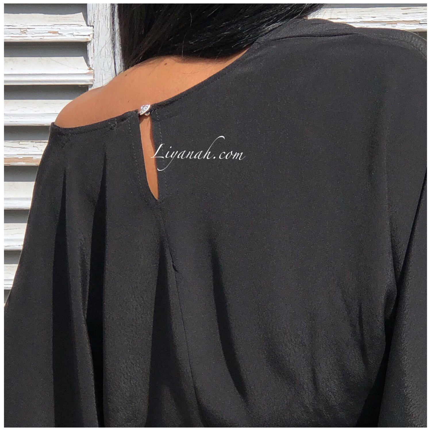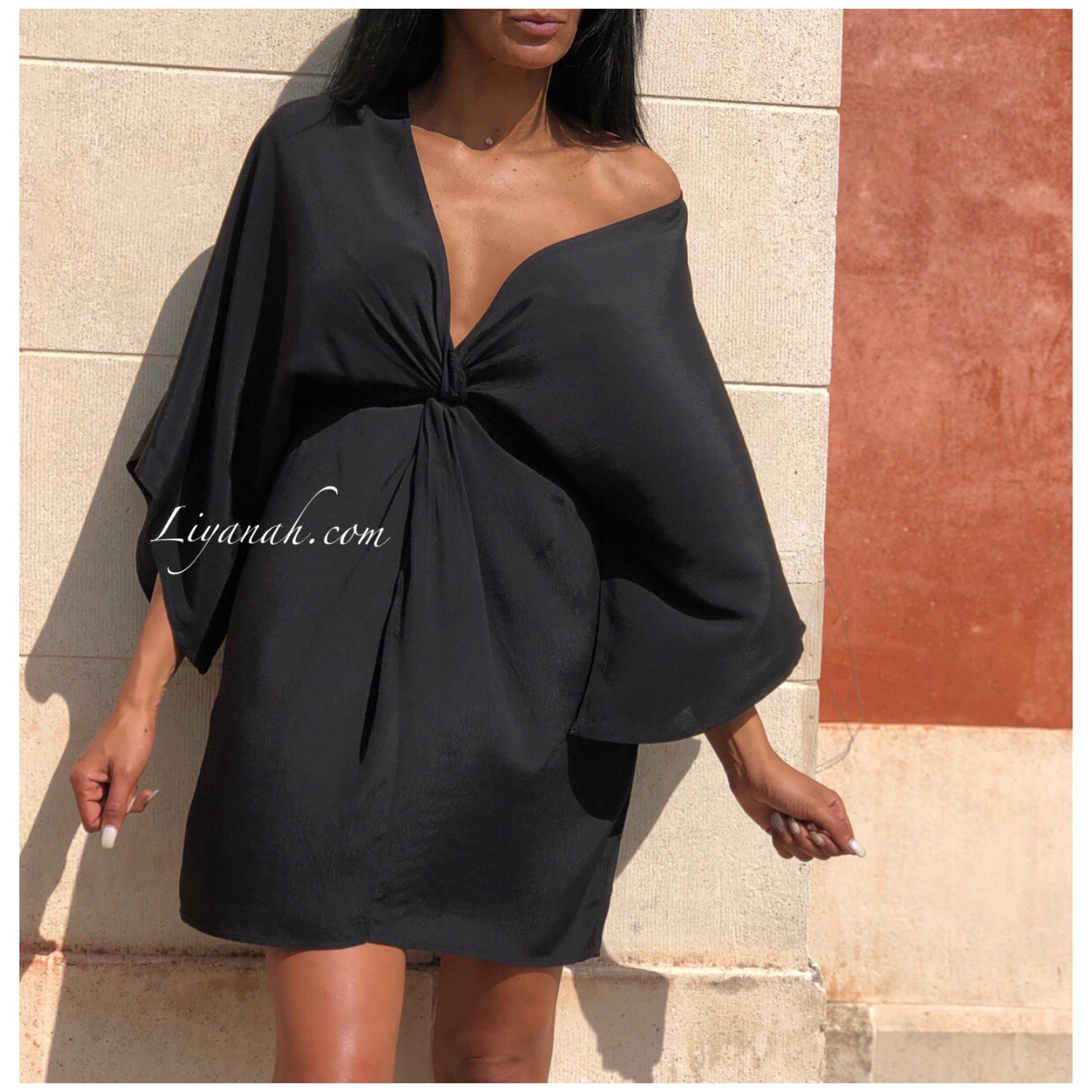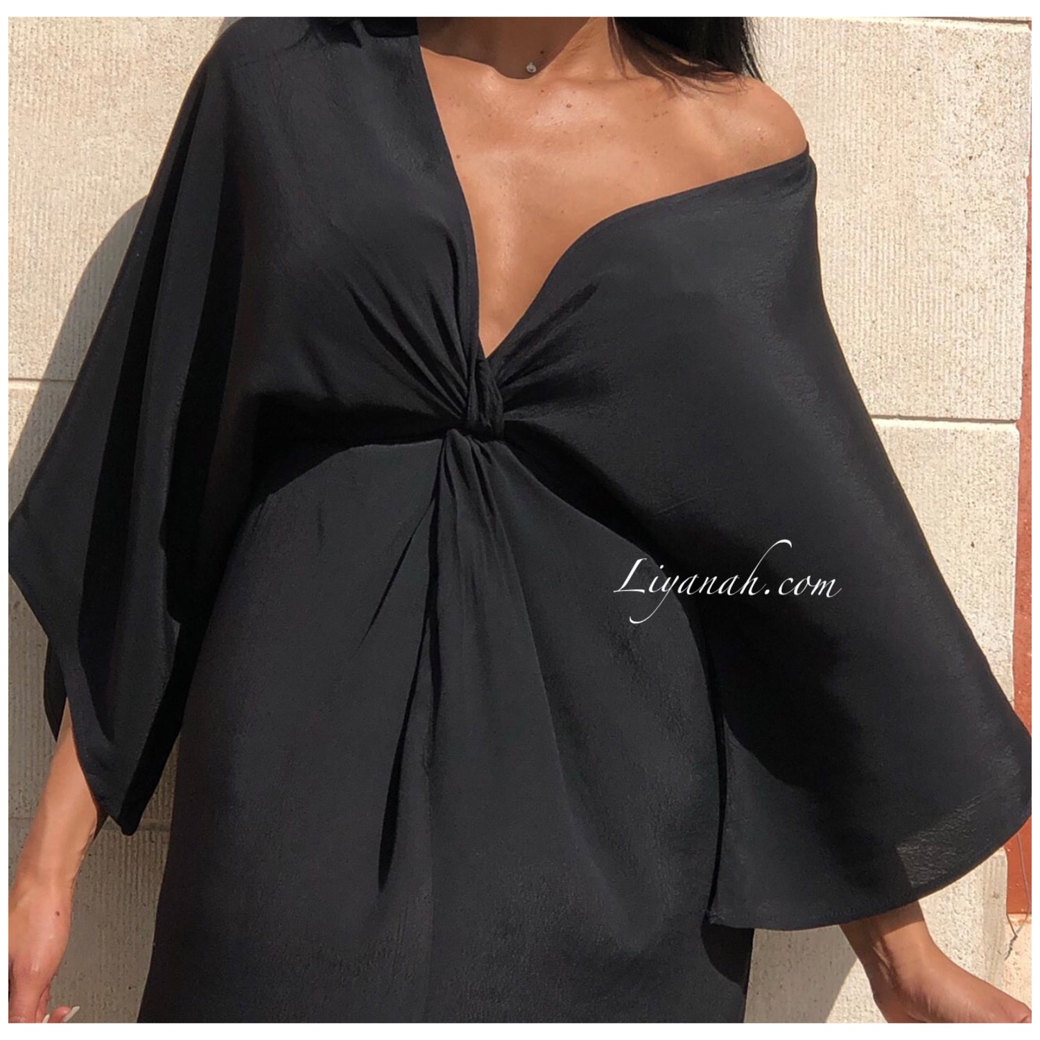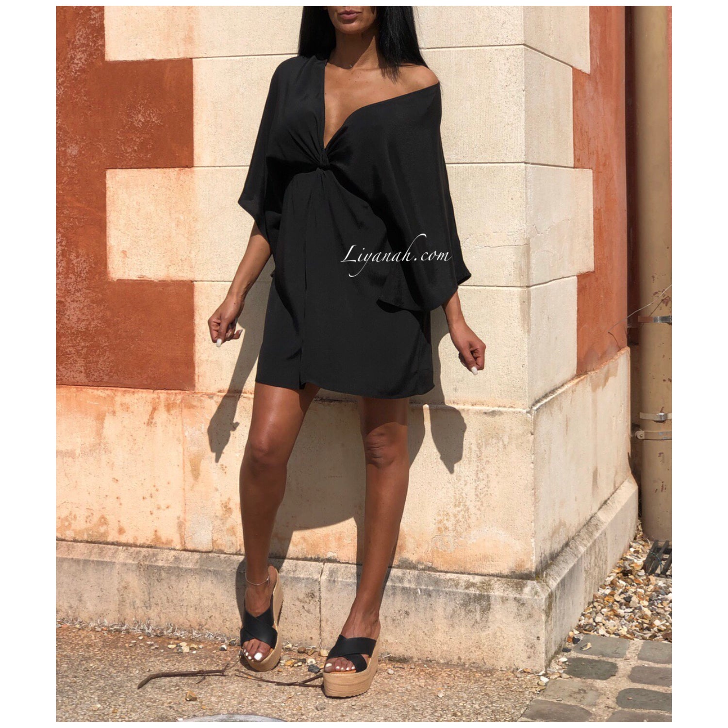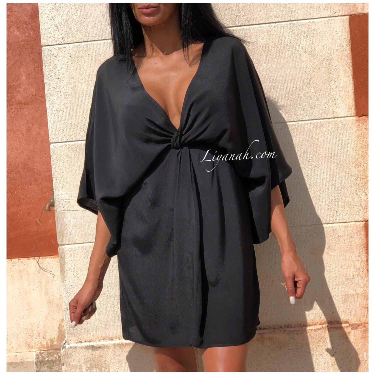 Robe Courte Modèle YELYNA NOIR - Robe courte style robe de plage, couture fixe nouer sous la poitrine pour un jolie décolleté plongeant et manches évasées, fermeture bouton au cou à l’arrière, élastique à la taille, Matière fluide et agréable à porter - Taille 34/36 ou 38/40 - 100% Polyester