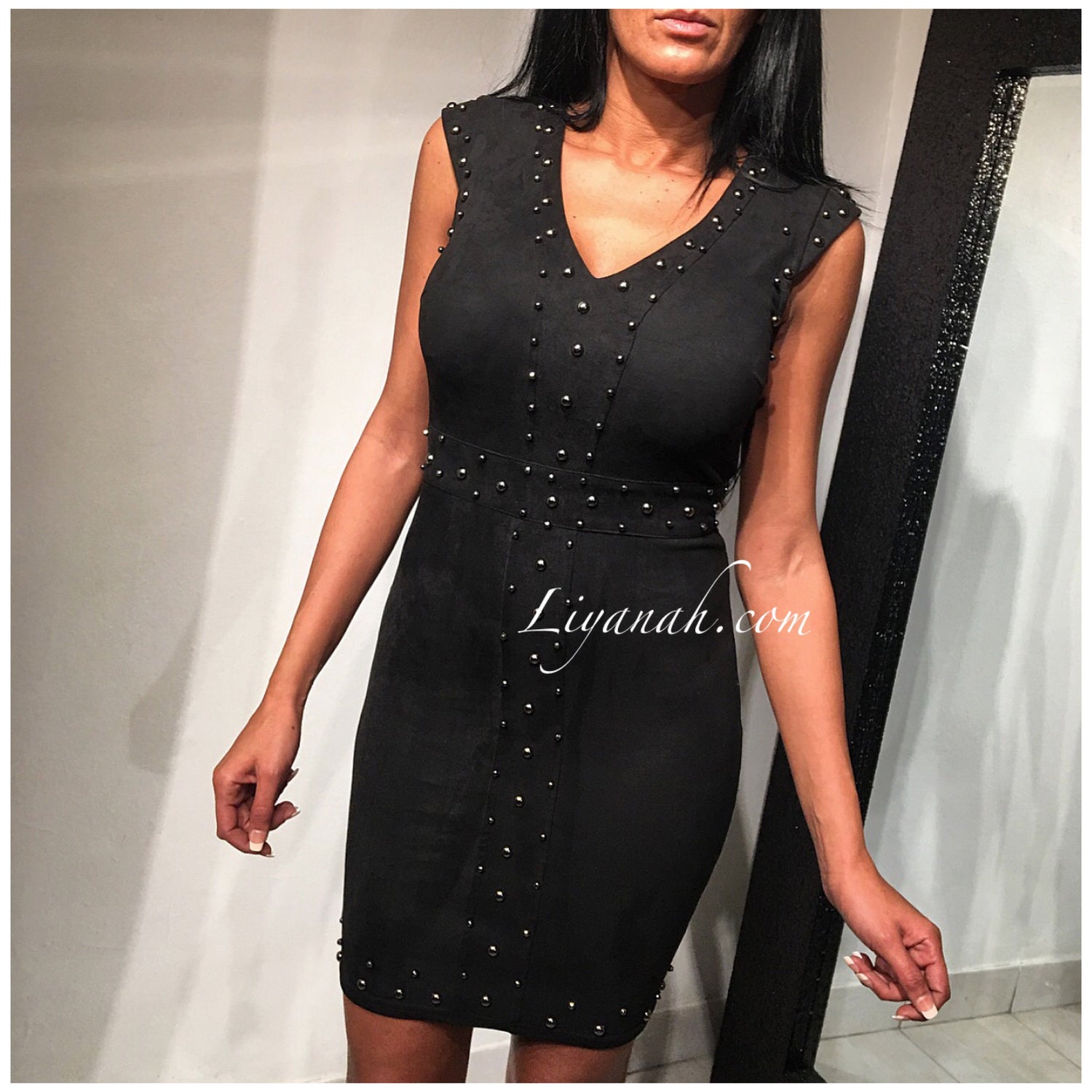 Robe suedine Avec détails cloutés et Fermeture Zip au dos - Robe courte, cintrée Et près du corps 🖤Taille Du S au L ! 95% Polyester 5% Elasthanne (Notre Modèle porte une taille S et mesure 1m70) Longueur : Environ 84 cm