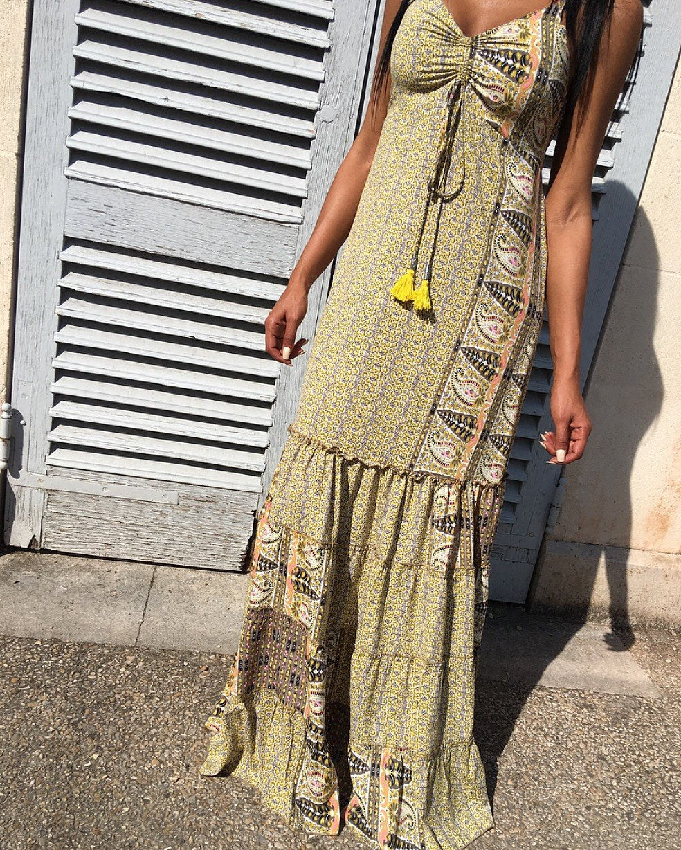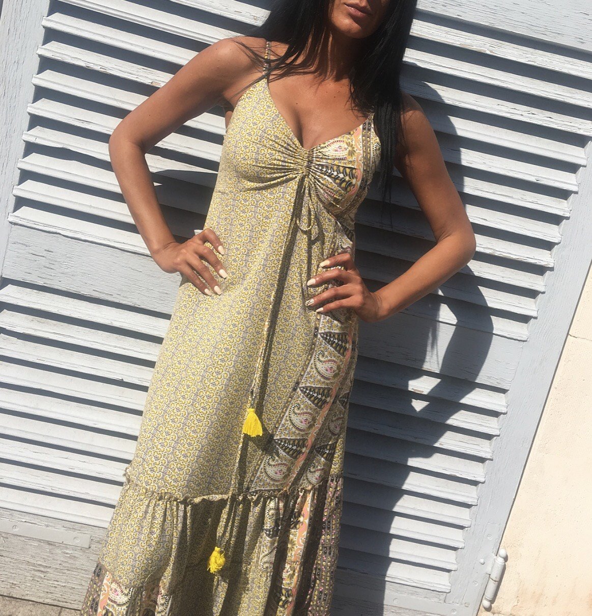 Robe Longue MYSA Imprimé coloré sur l’ensemble de la Robe Décolleté Bretelles et noeuds réglables • Taille disponible Taille 1/36 - Taille 2/38 - Taille 3/40 • 100% Polyester Longueur : 123 cm • Le modele mesure 1m70 et porte une taille 1/36