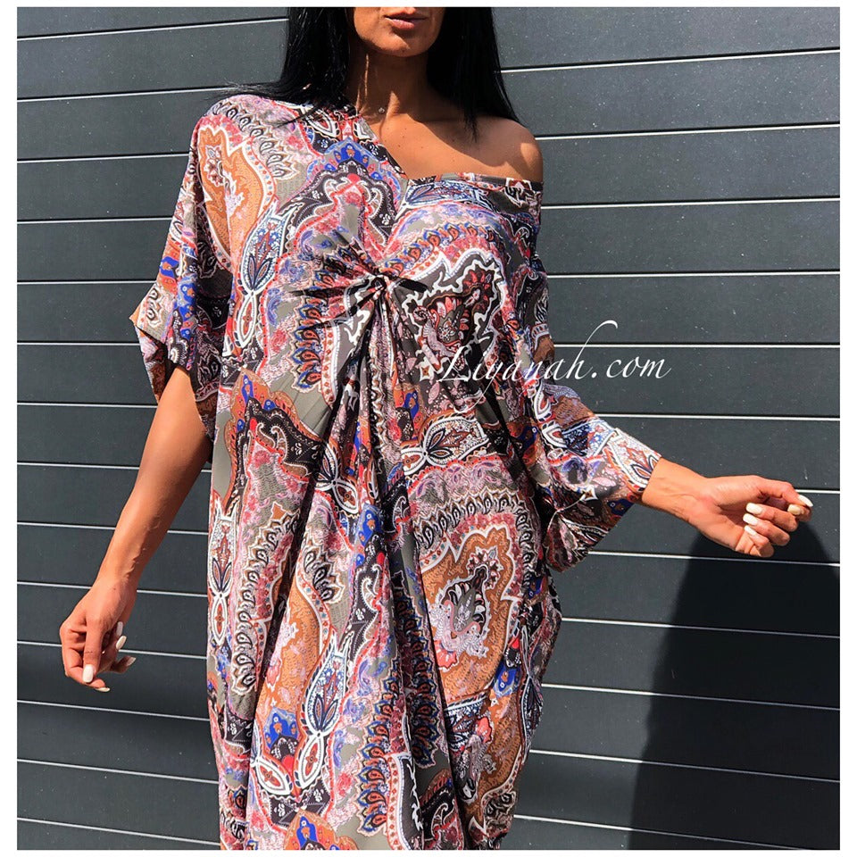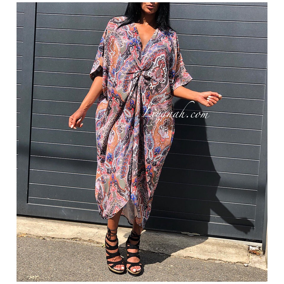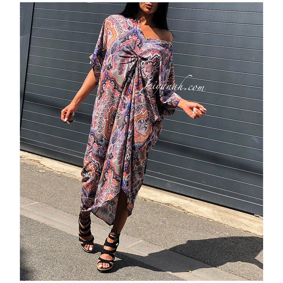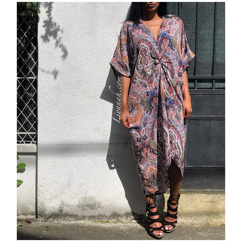 Robe Mi-longue Modèle DJELYA Kaki - Robe à imprimé, modèle à enfiler décolleté en V avec aspect noeud nouer fixe à l’avant et légèrement échancrée sur le bas - Coupe évasée et large, Matière fluide - 100% Polyester - Taille Unique du 34 au 44 !! Notre modèle mesure 1m70 et fait une taille 32/34