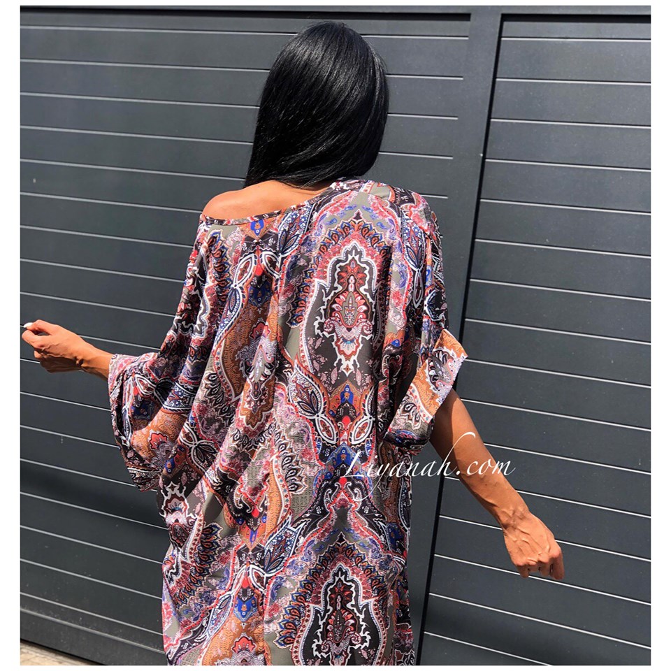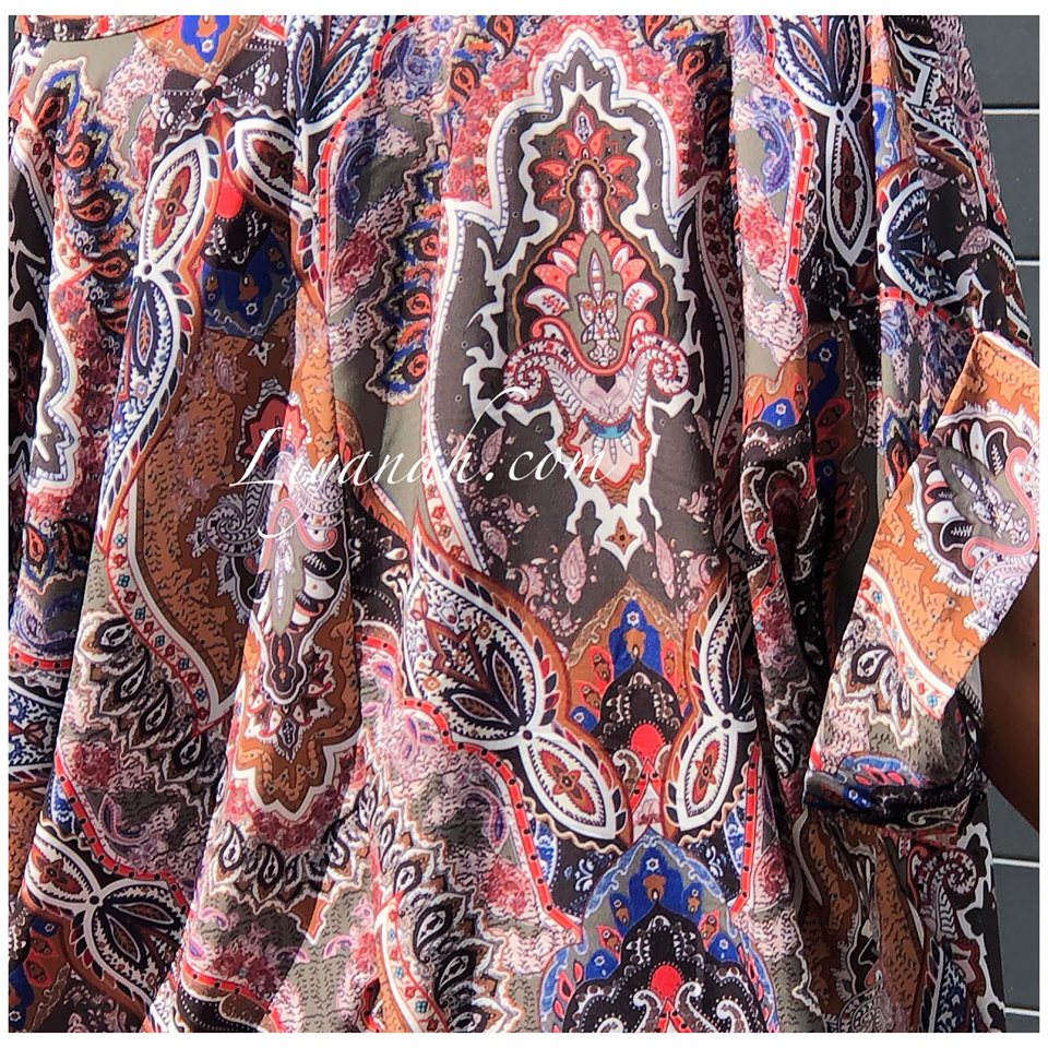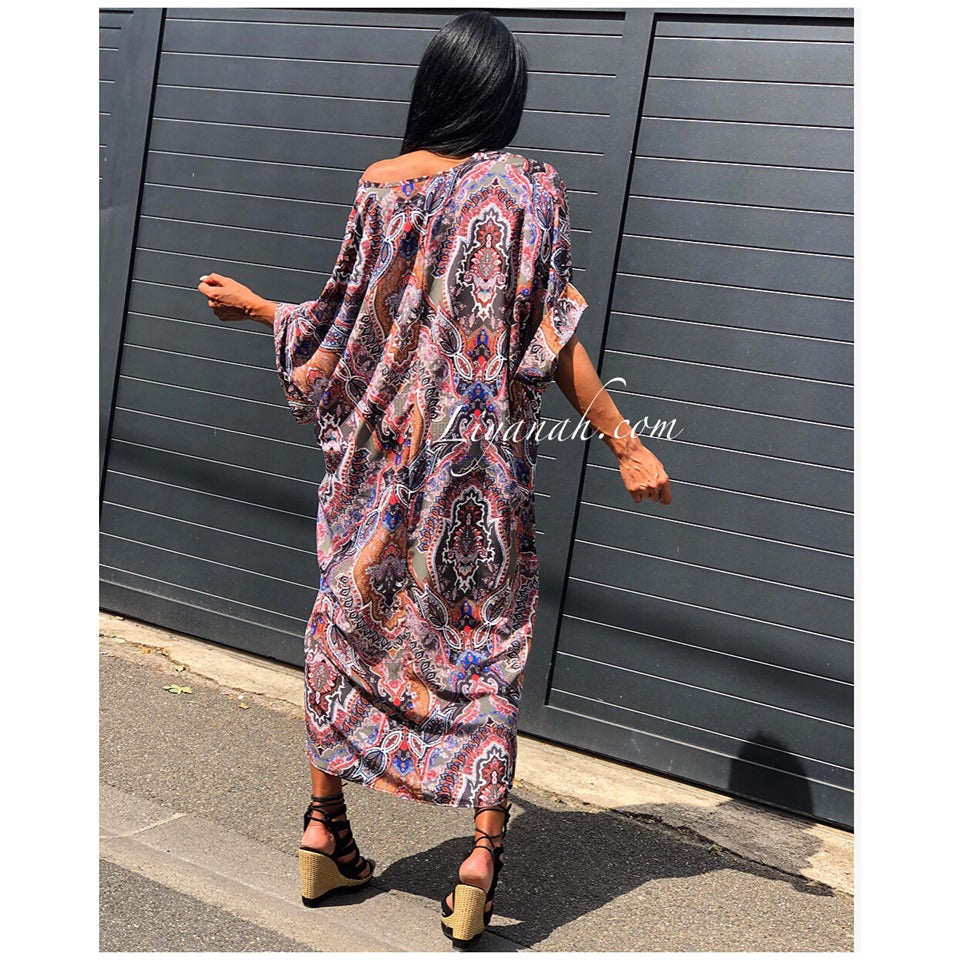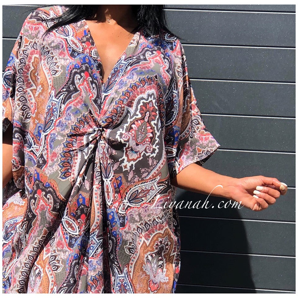 Robe Mi-longue Modèle DJELYA Kaki - Robe à imprimé, modèle à enfiler décolleté en V avec aspect noeud nouer fixe à l’avant et légèrement échancrée sur le bas - Coupe évasée et large, Matière fluide - 100% Polyester - Taille Unique du 34 au 44 !! Notre modèle mesure 1m70 et fait une taille 32/34