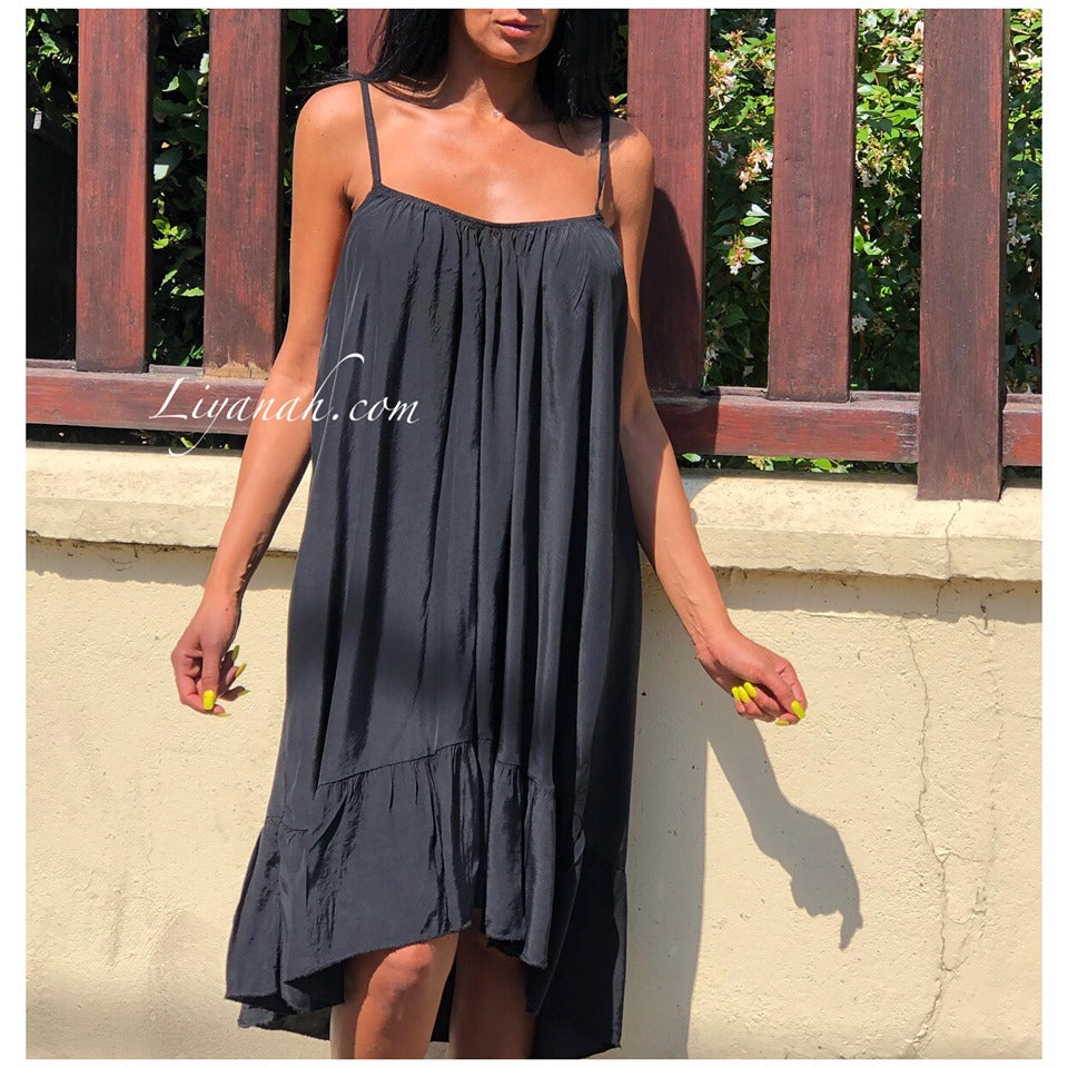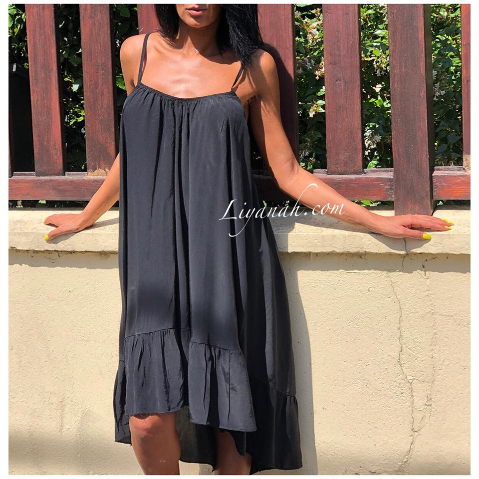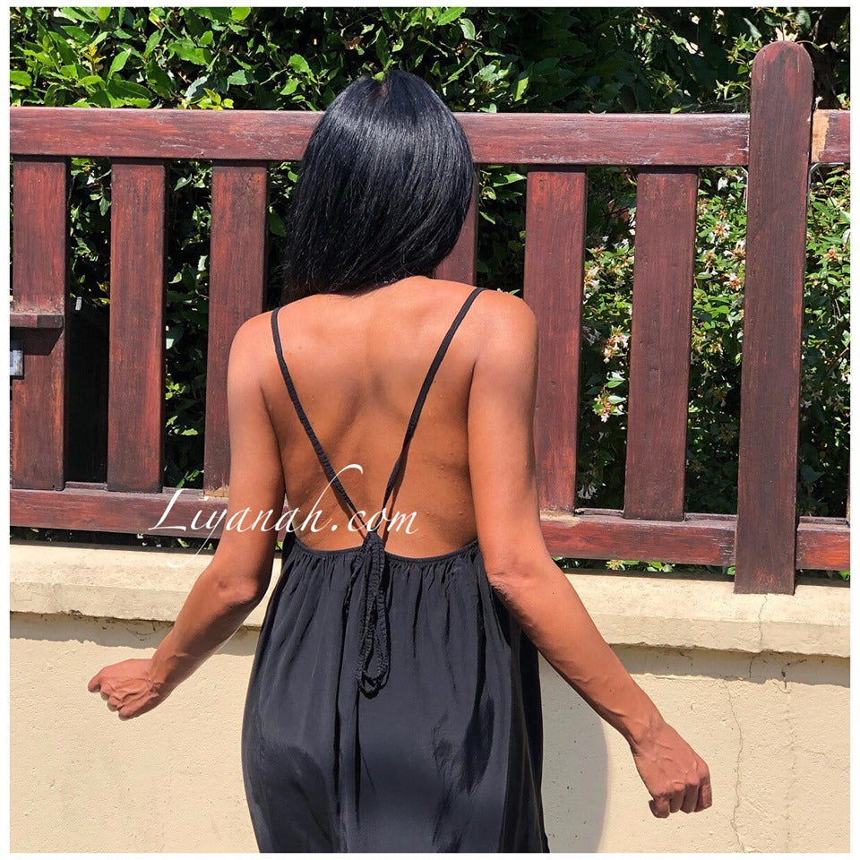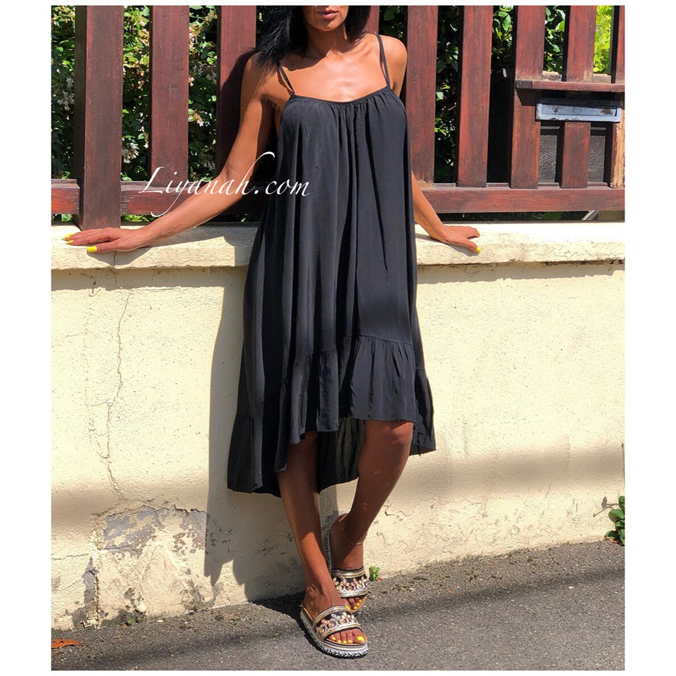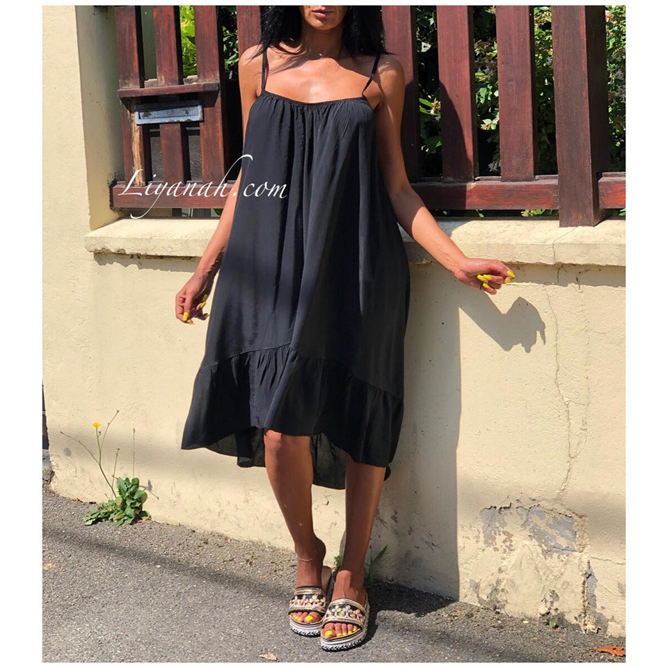 Robe Modèle HERMIONE NOIR - Robe à enfiler avec bretelles fines à resserrer dans le dos de la manière que vous le souhaitez pour choisir le dos nu - Coupe large et col rond - légèrement plus courte à l’avant qu’à l’arrière - 100% VISCOSE - Taille Unique du 34 au 44
