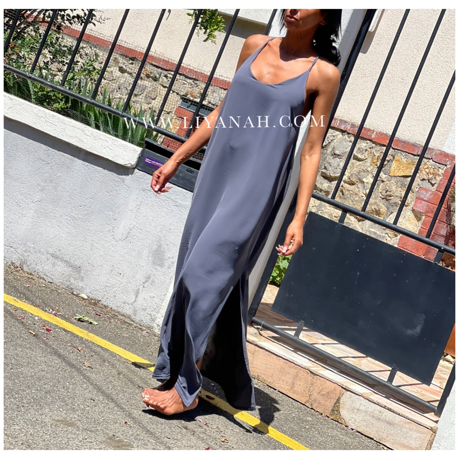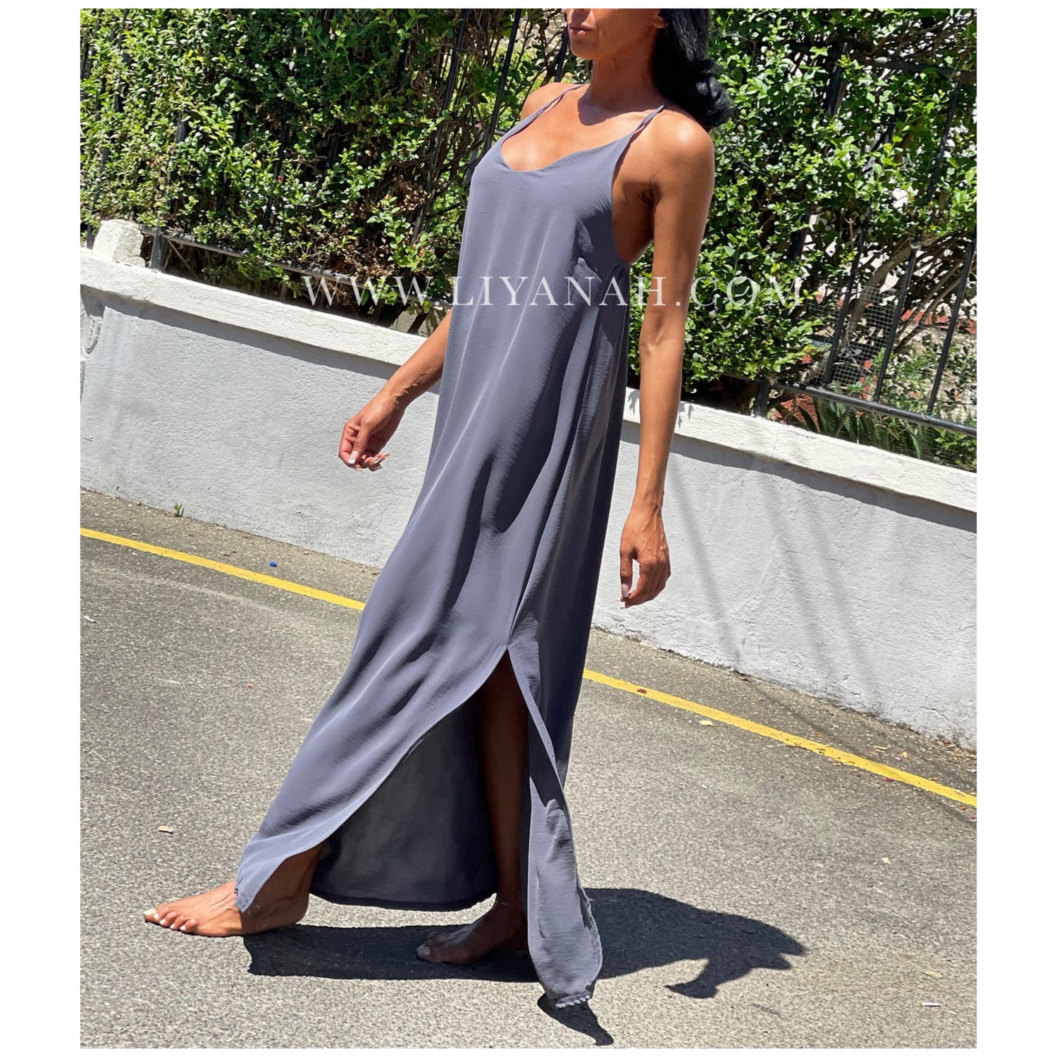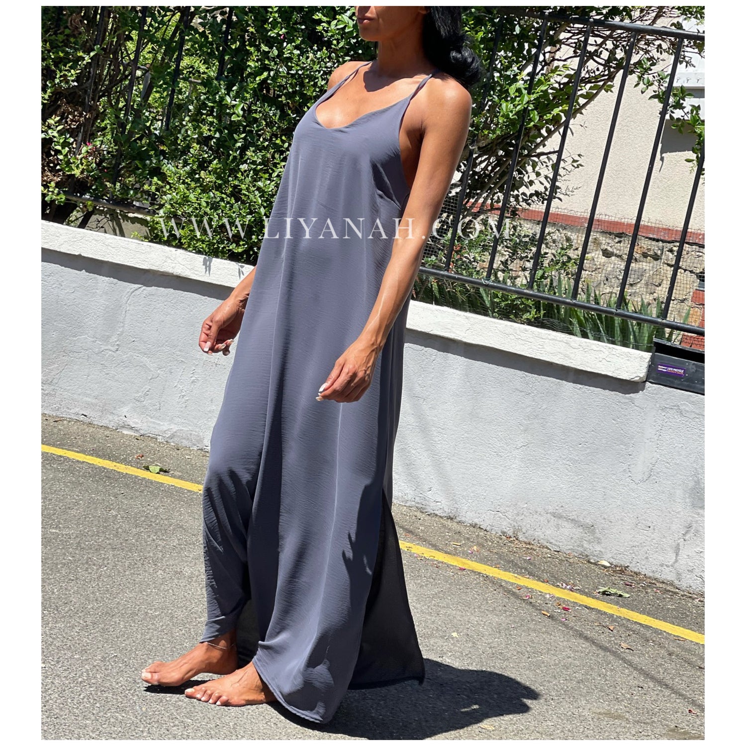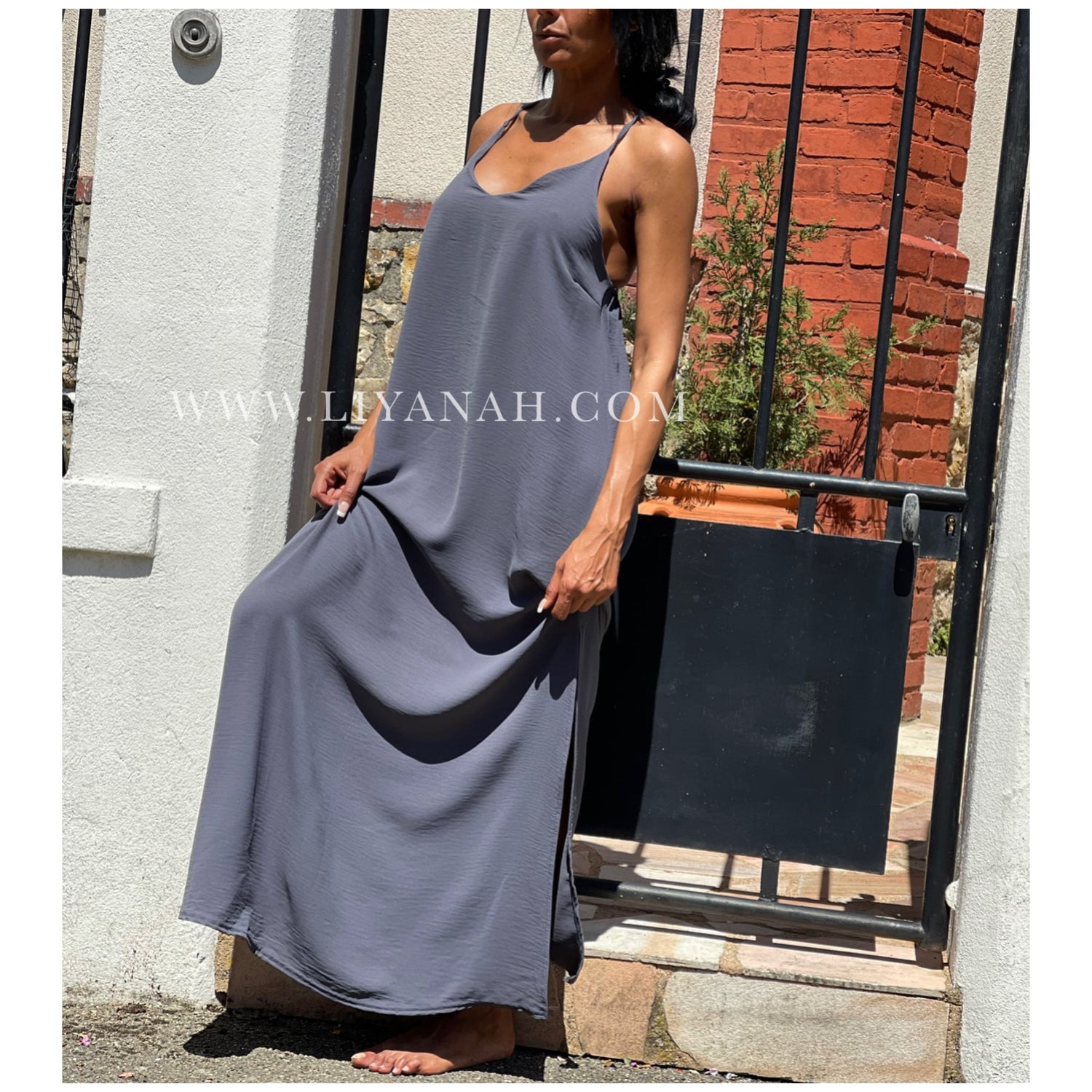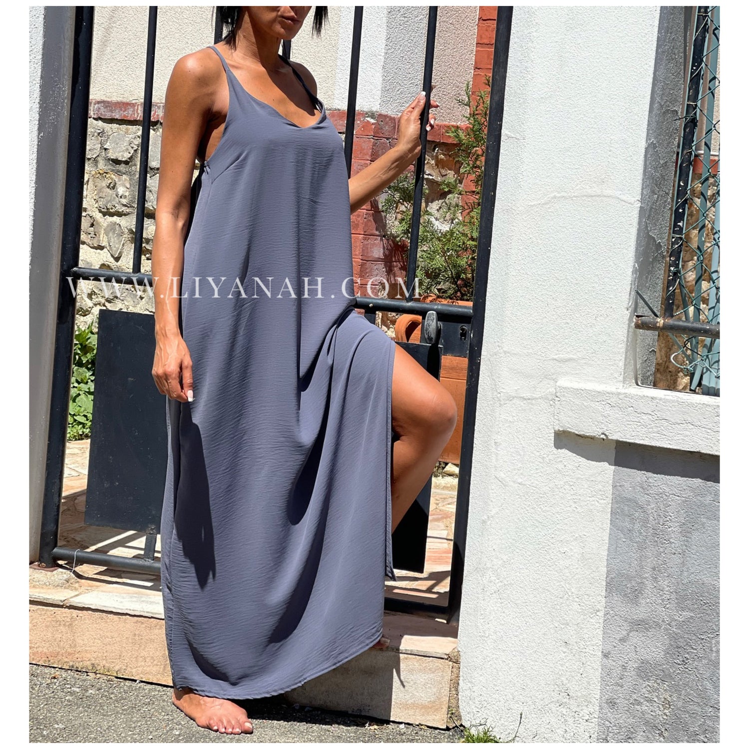 Robe longue avec ouverture sur le côté, bretelle croisée dans le dos non réglable - 92% Polyester 8% Elasthanne - Taille unique que 34 au 40