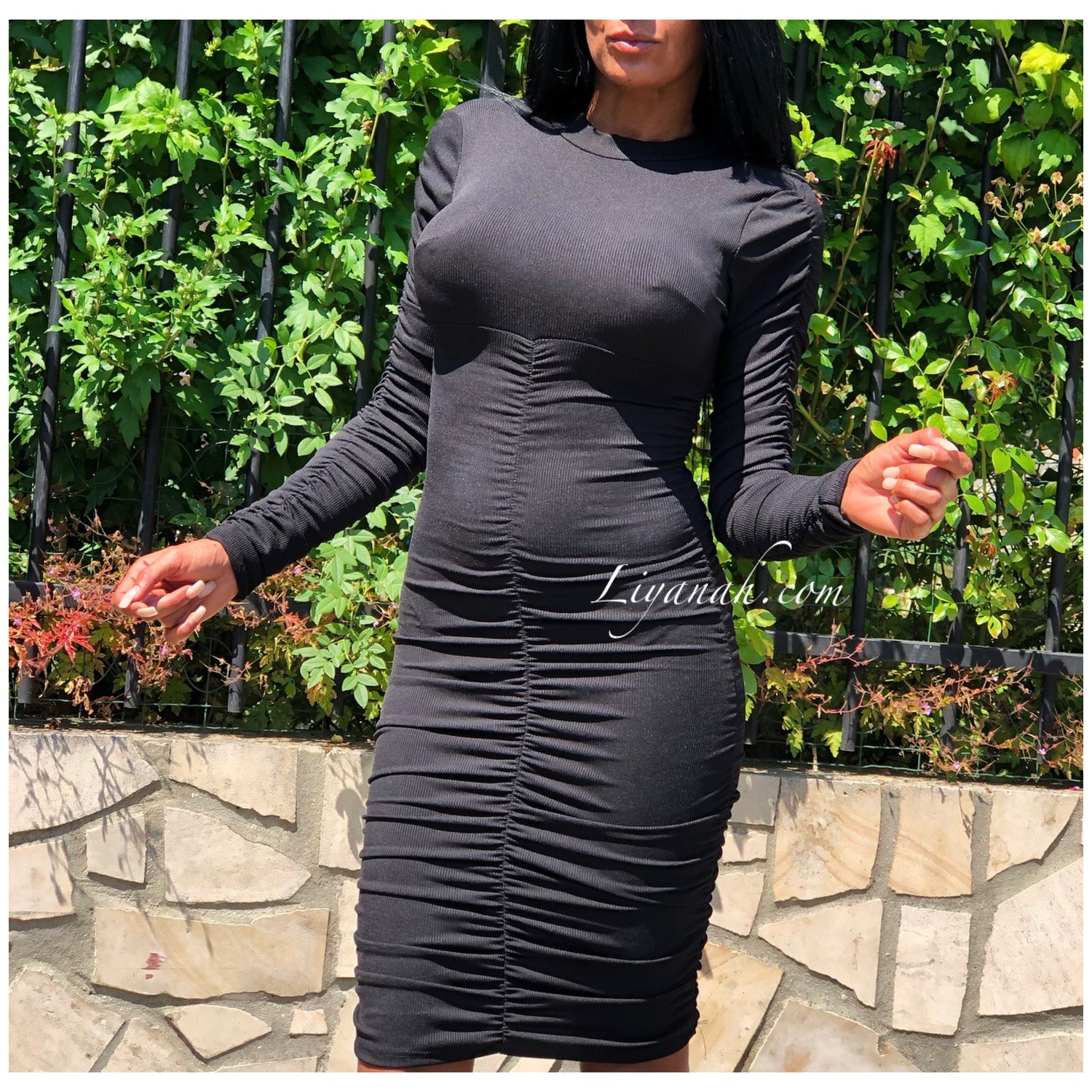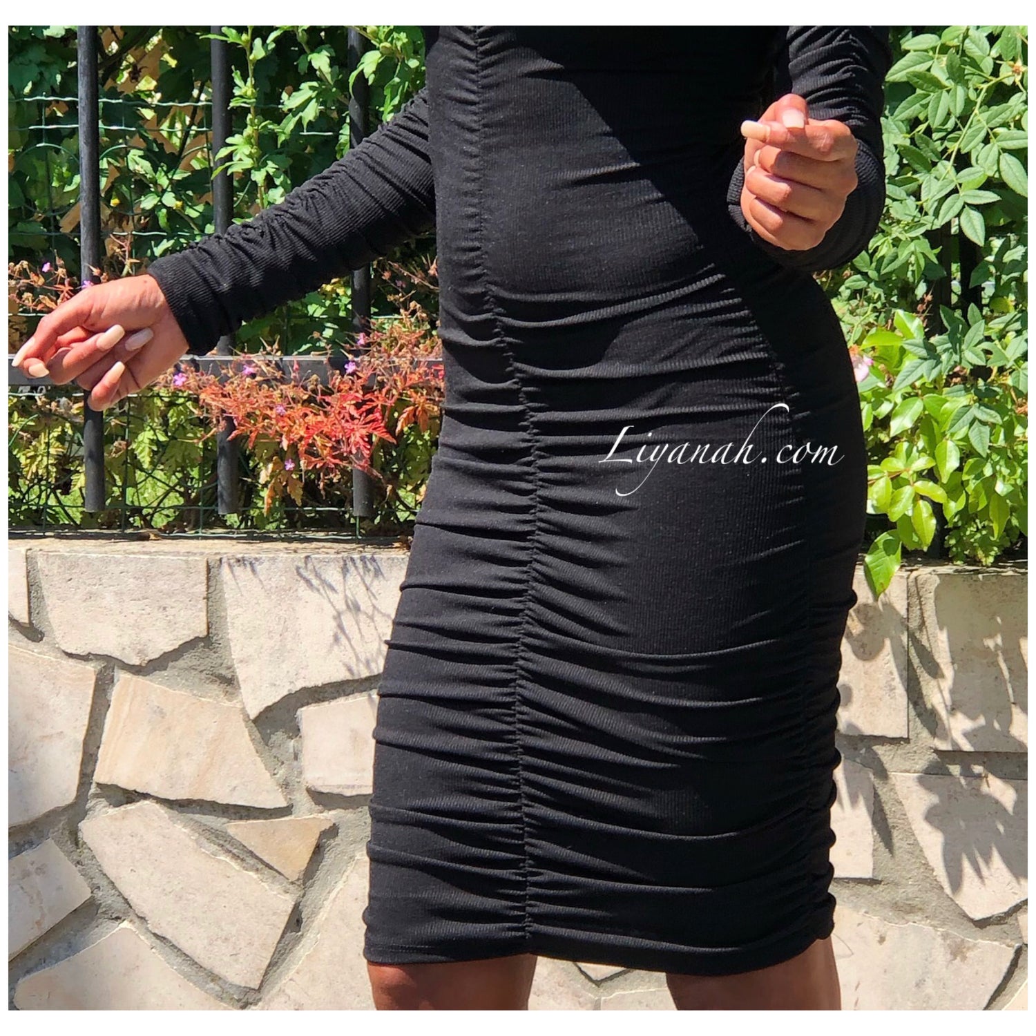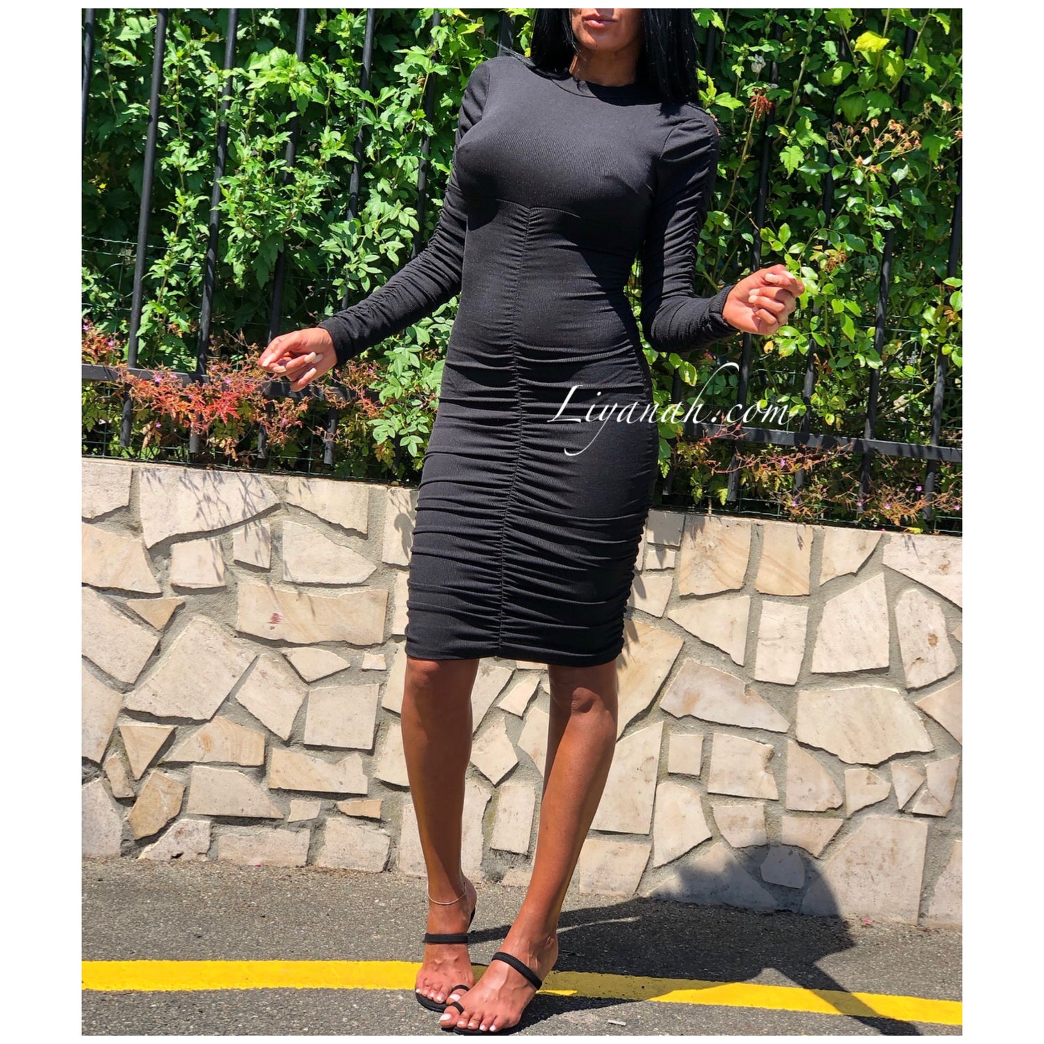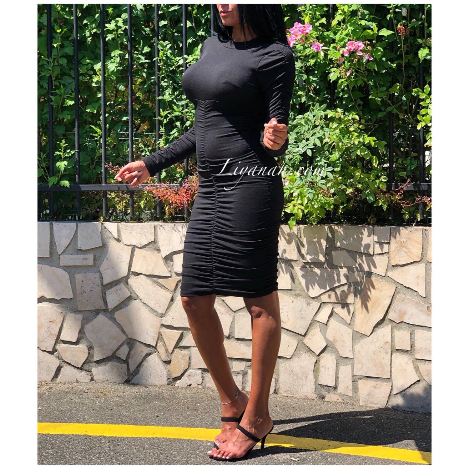 Robe Modèle MANON NOIR - Robe manches longues près du corps à enfiler, plissée et col haut, coupe près du corps, matière douce et agréable à porter 95% Polyester 5% Elasthanne - Taille Unique du 34 au 36
