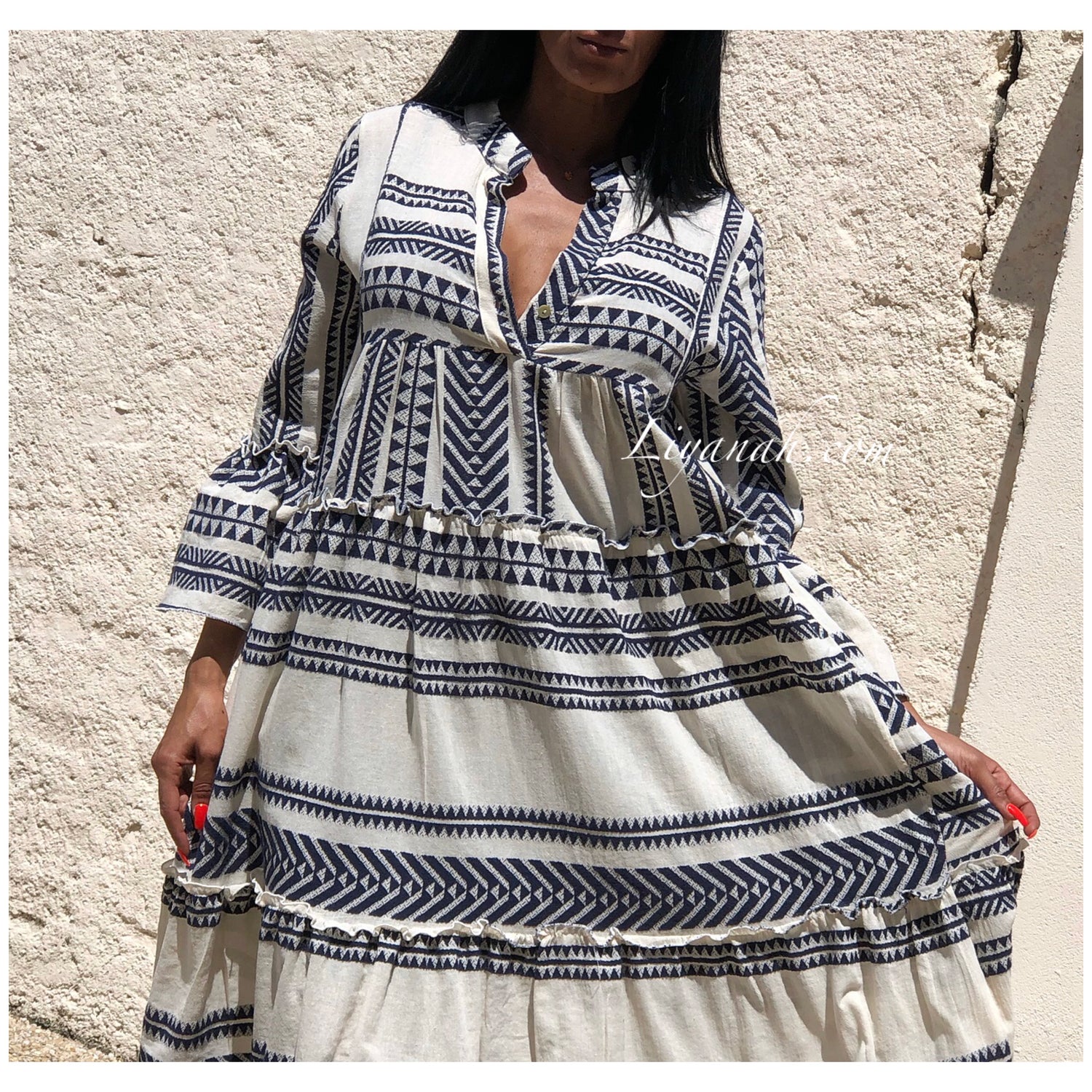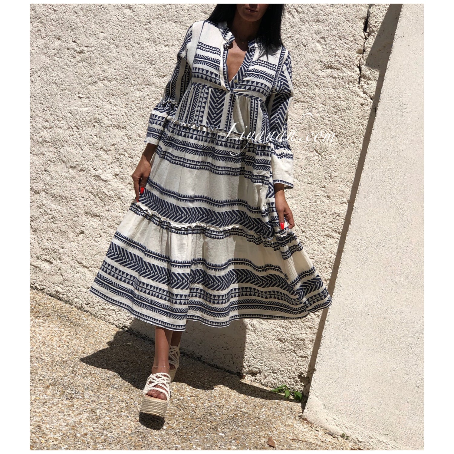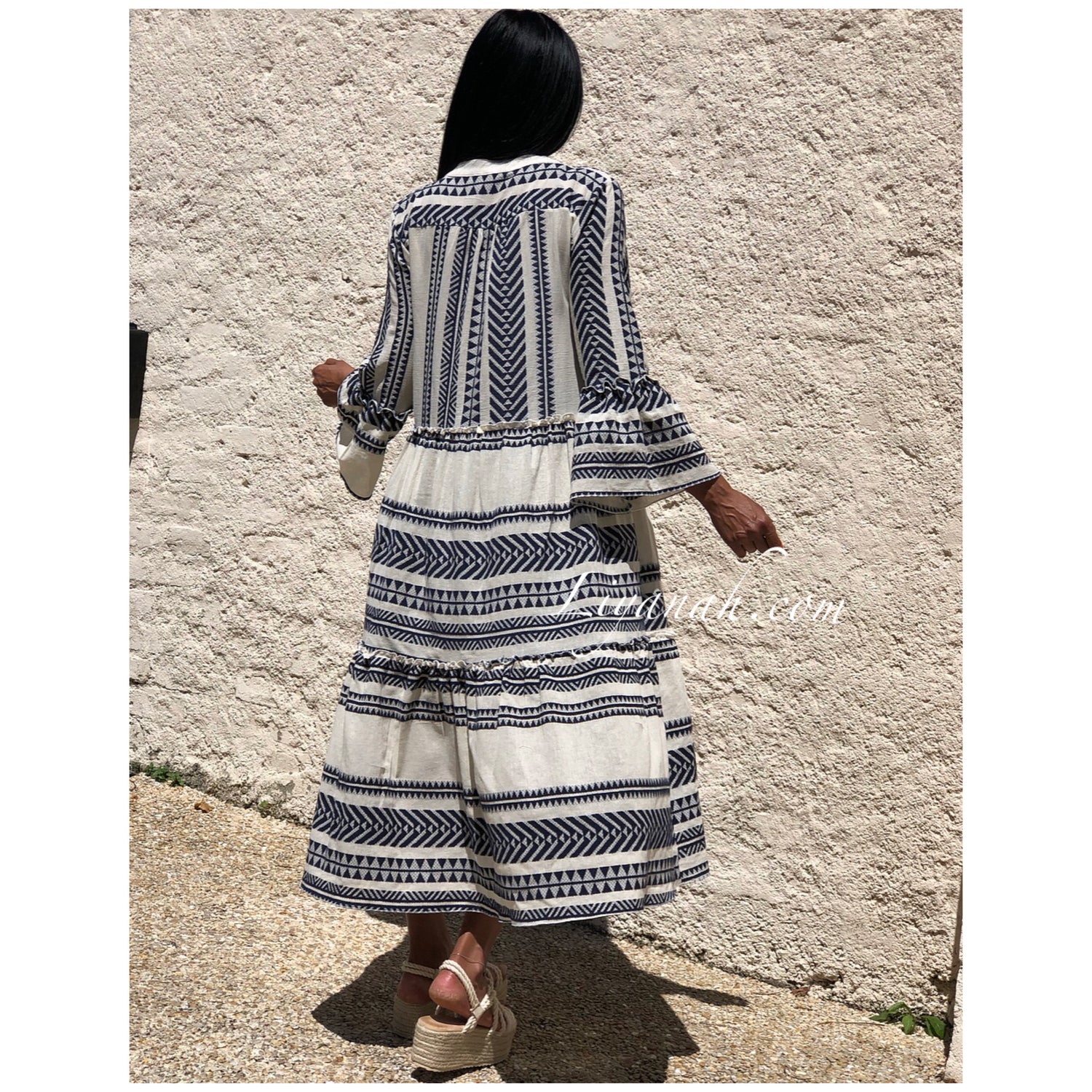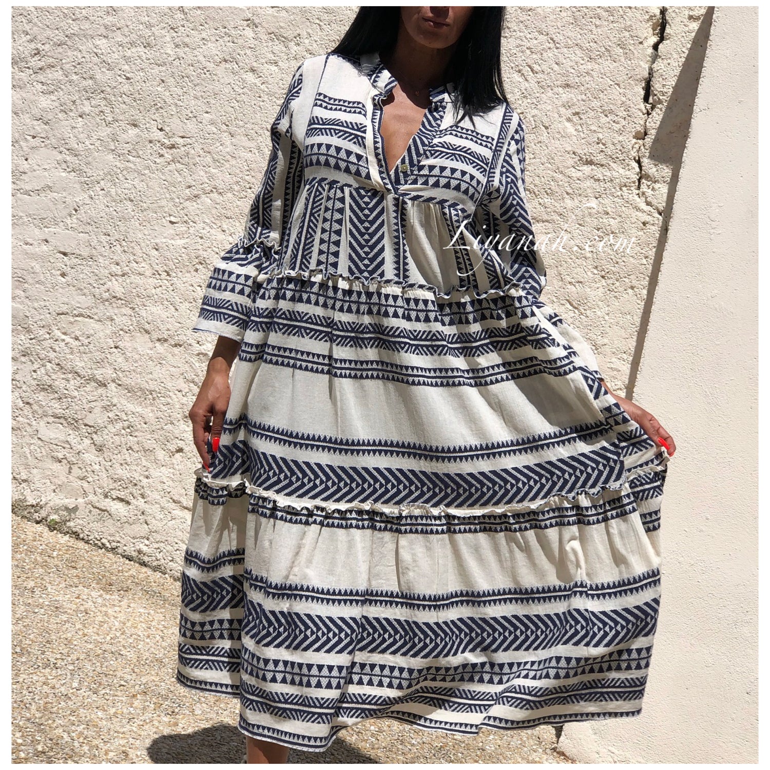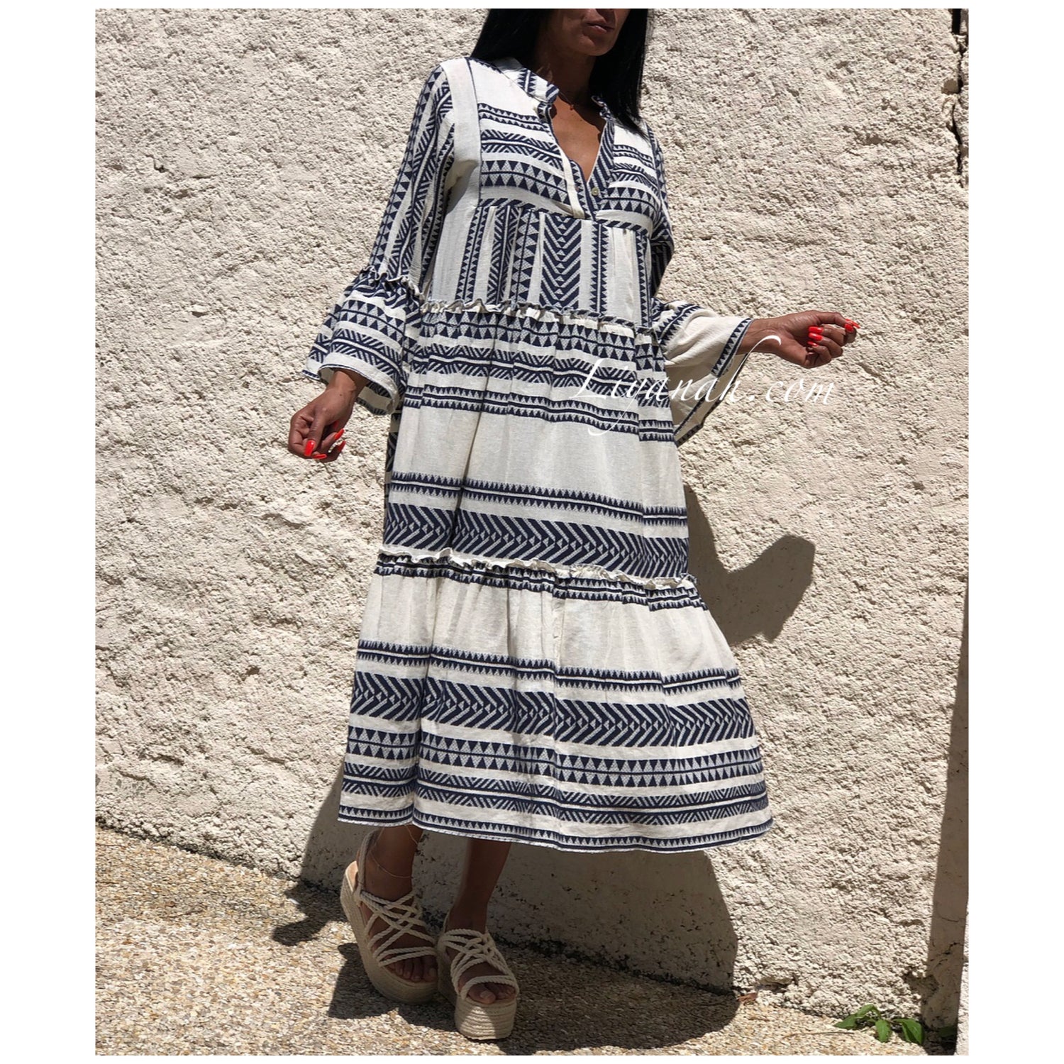 Robe longue à imprimée, manches 3/4, matière légèrement épaisse, col V avec un bouton (ce modèle est légèrement transparent, idéalement avec un dessous de robe ou cycliste par exemple) LONGUEUR : 122 CM - 50% COTON 50% LIN - Taille unique du 34 au 38 - Notre modèle mesure 1m70 et fait une taille 34