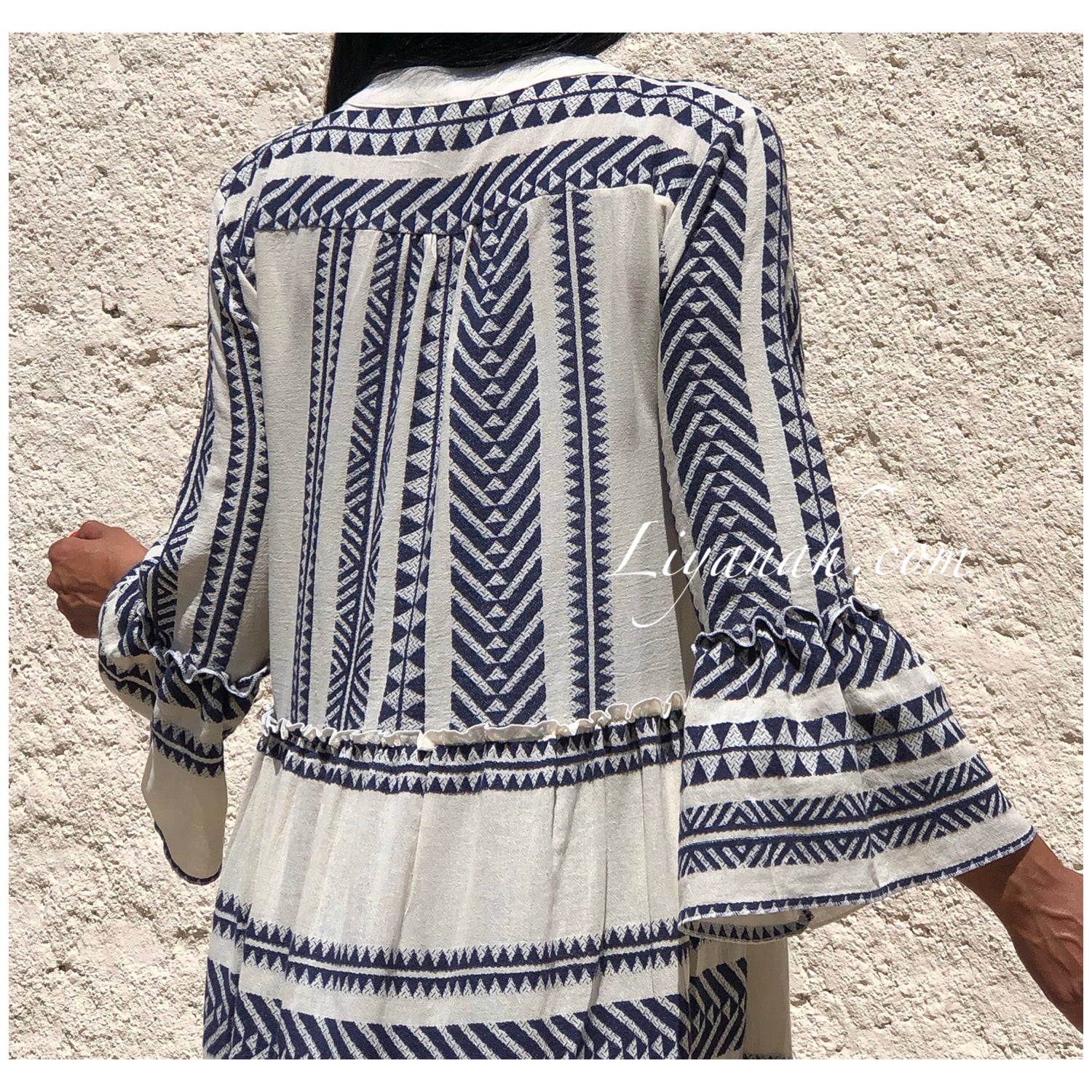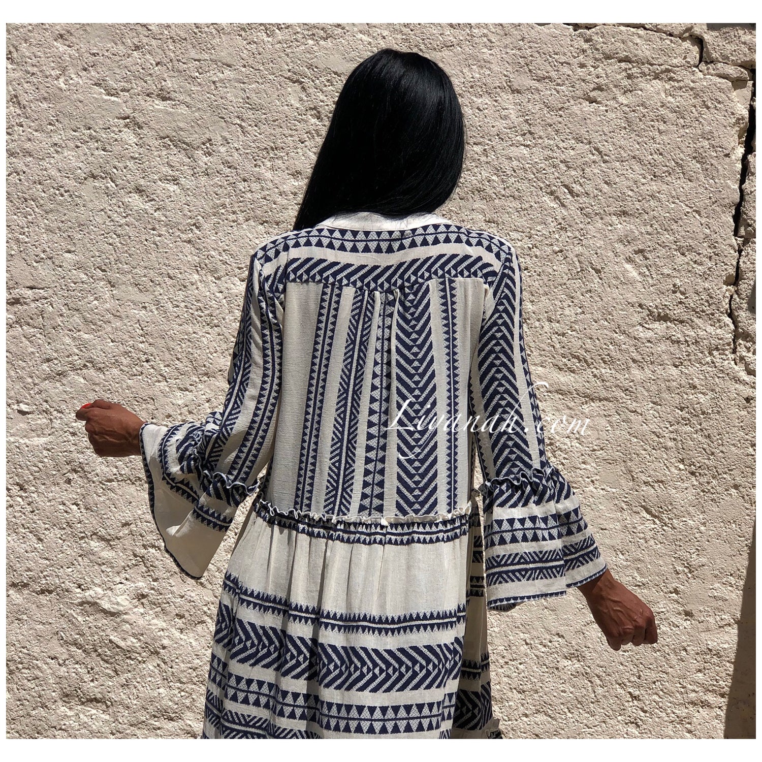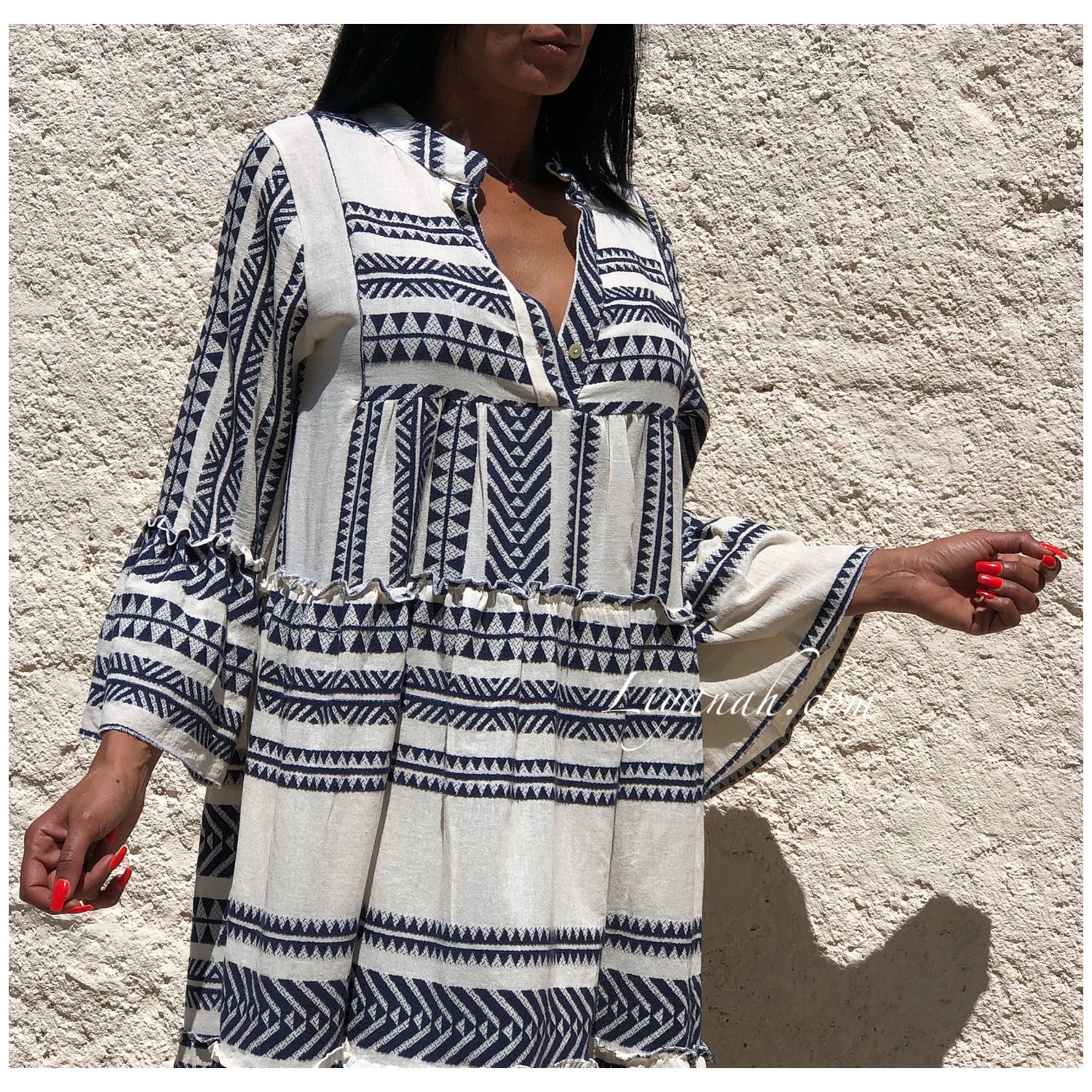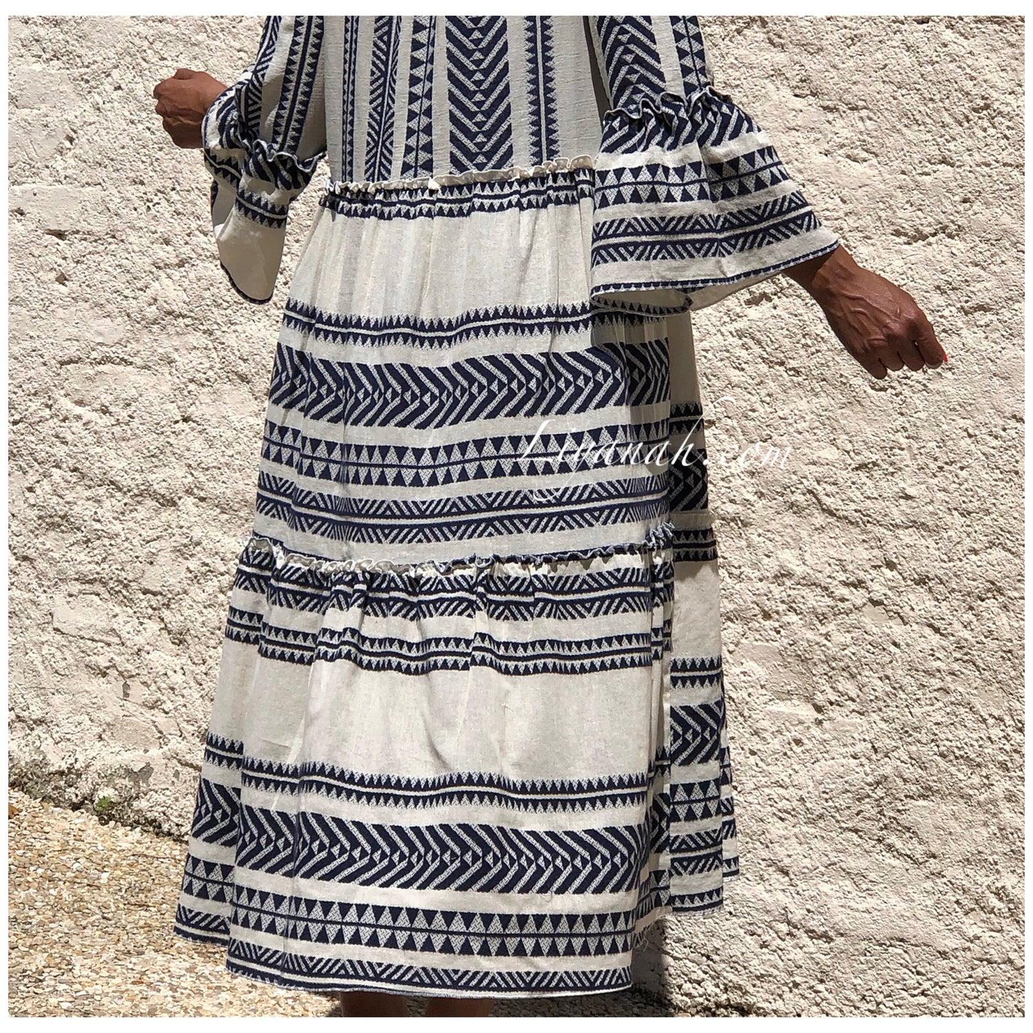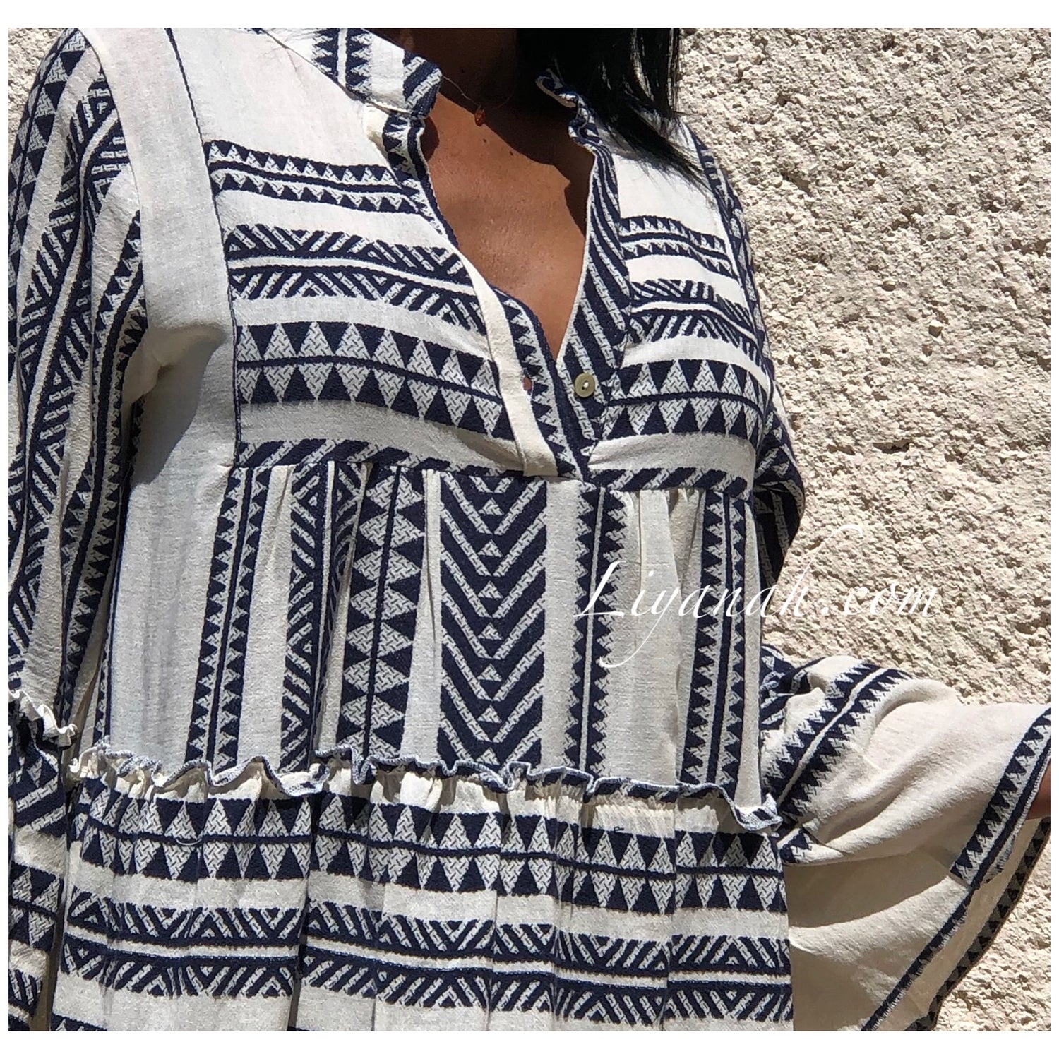 Robe longue à imprimée, manches 3/4, matière légèrement épaisse, col V avec un bouton (ce modèle est légèrement transparent, idéalement avec un dessous de robe ou cycliste par exemple) LONGUEUR : 122 CM - 50% COTON 50% LIN - Taille unique du 34 au 38 - Notre modèle mesure 1m70 et fait une taille 34