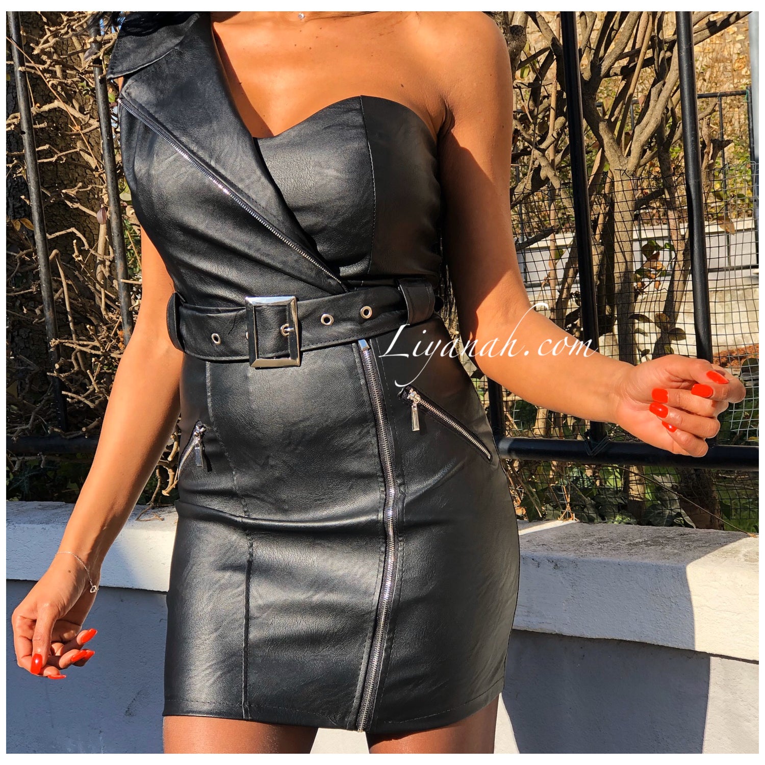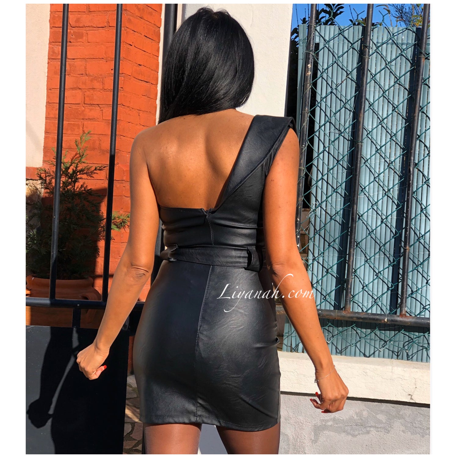 Robe Modèle RUBIS NOIR - Robe aspect cuir, près du corps, courte à une manche, détail ZIP sur la robe munie d’une ceinture, fausses poches - Fermeture ZIP au dos - 50% Viscose 50% PU - Taille XS au L