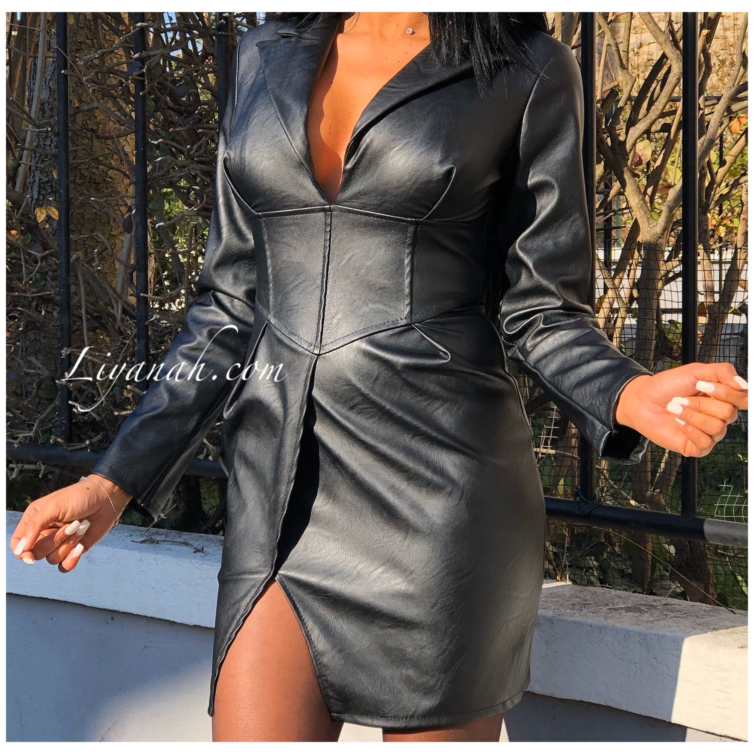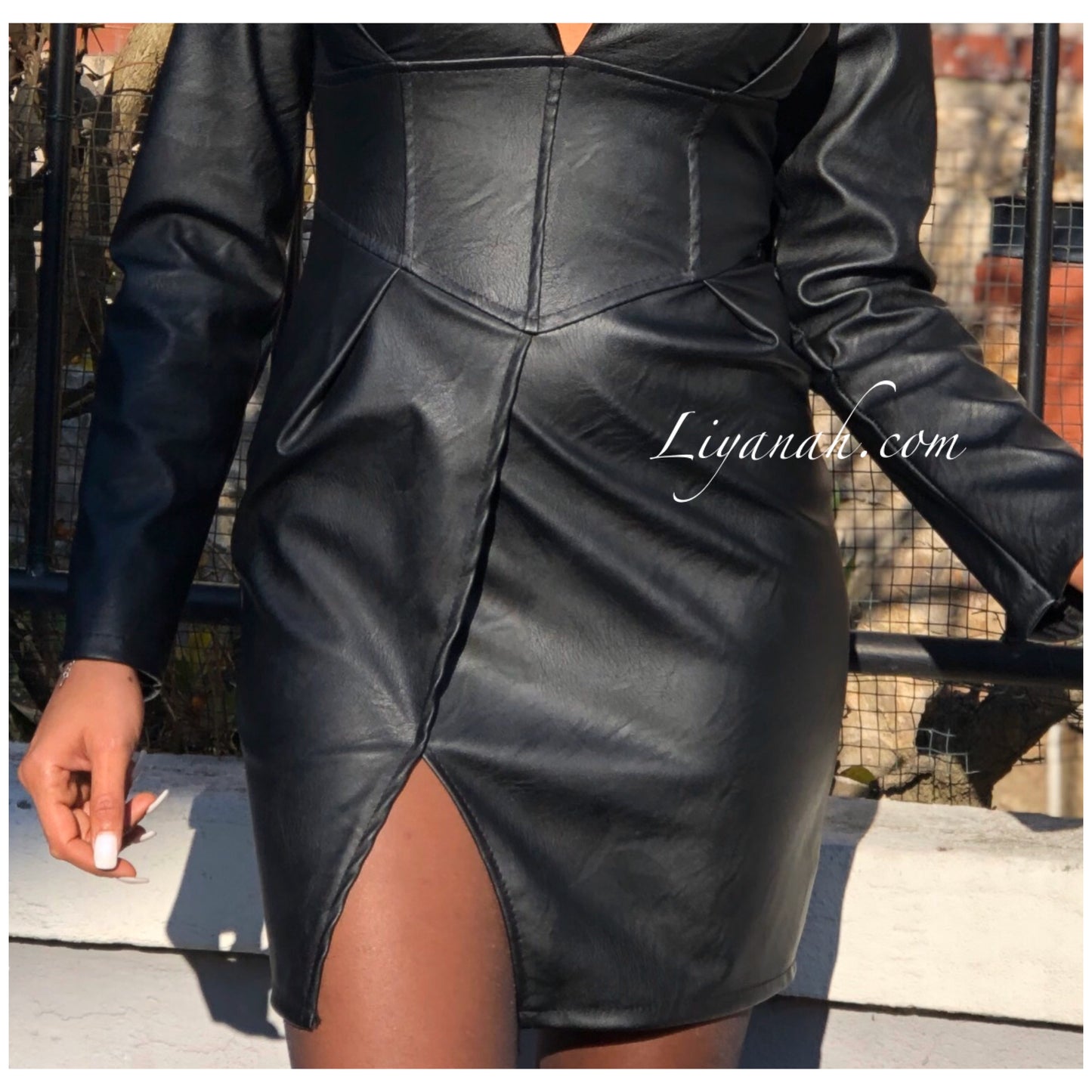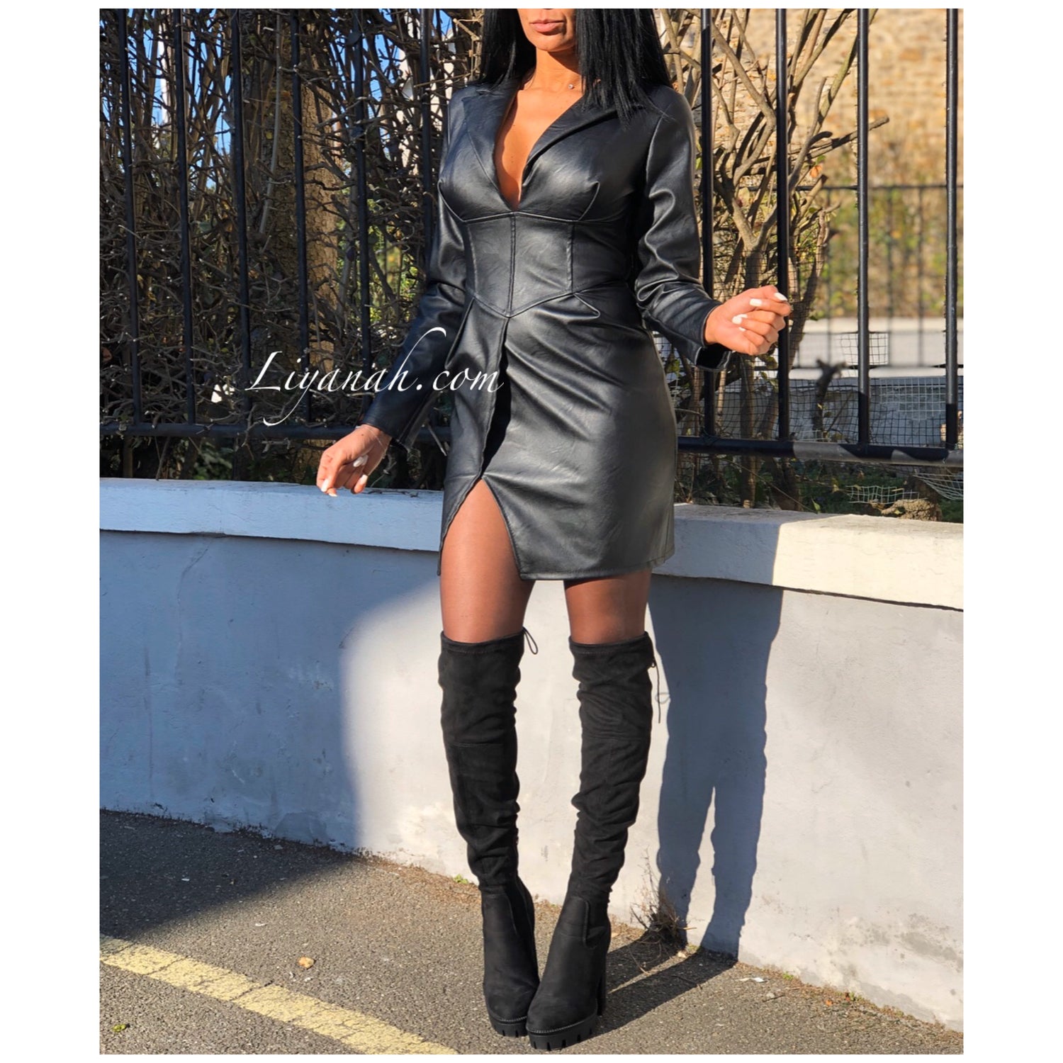 Robe Modèle YARA NOIR  - Robe aspect cuir, courte et cintrée, fermeture ZIP au dos, décolleté plongeant, échancrée au niveau de la cuisse - Longueur : 75 cm - 95% Polyester 5% Elasthanne - Taille XS au L - Notre modèle mesure 1m70, fait une taille 34 et porte une taille XS