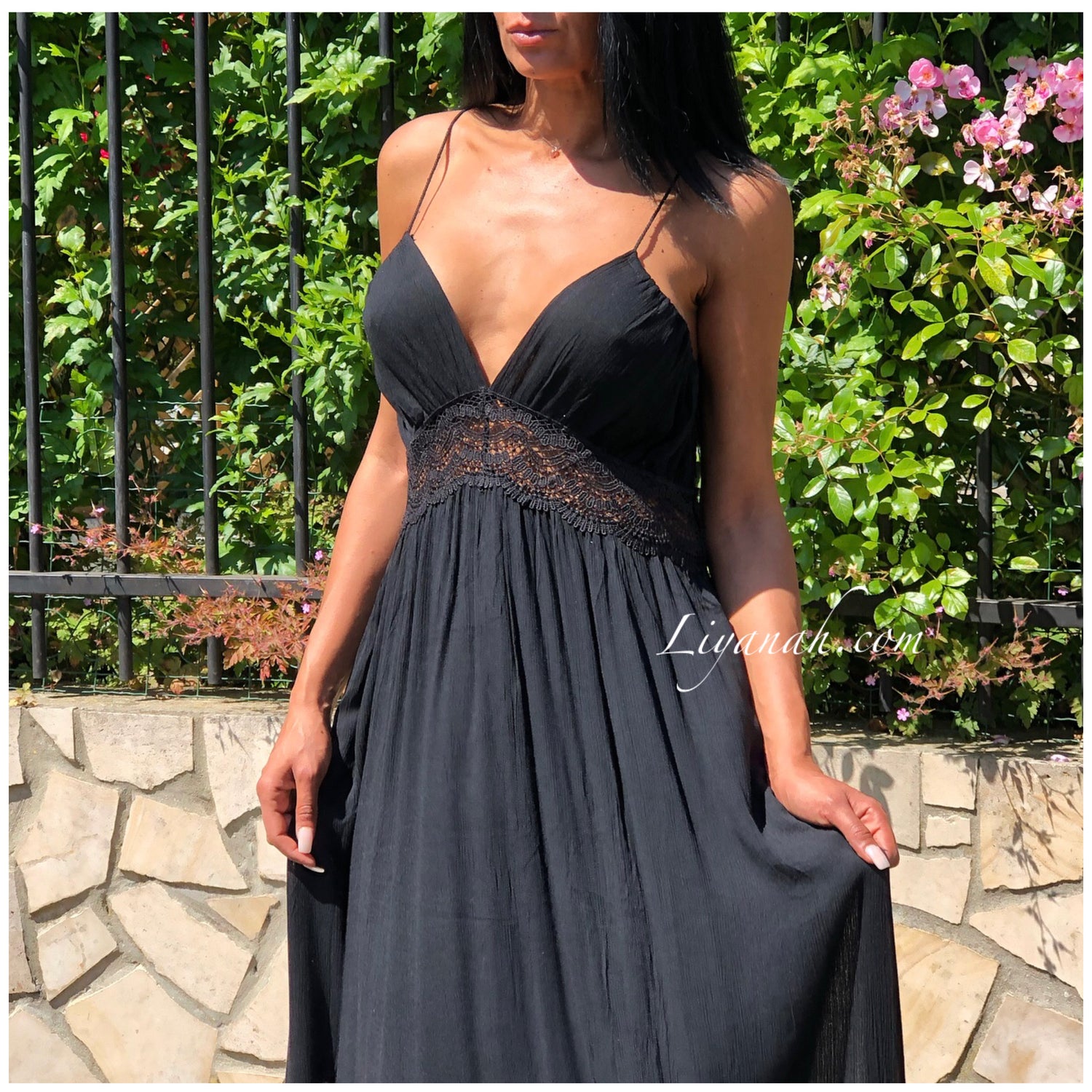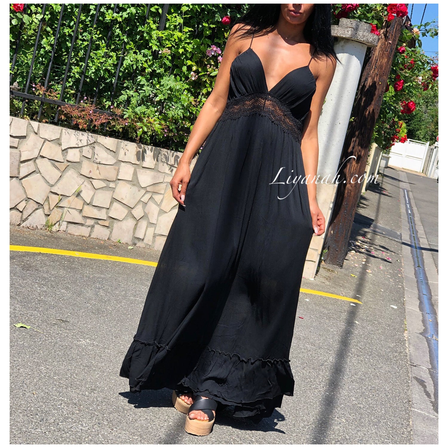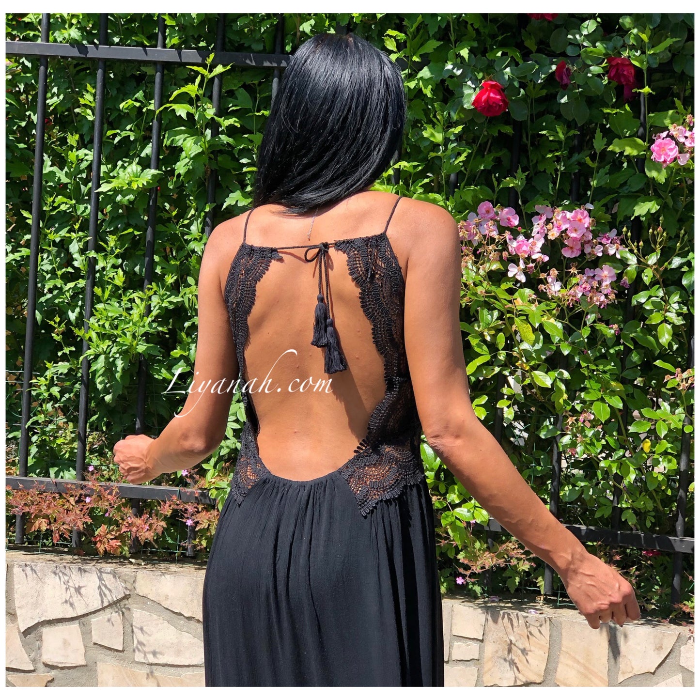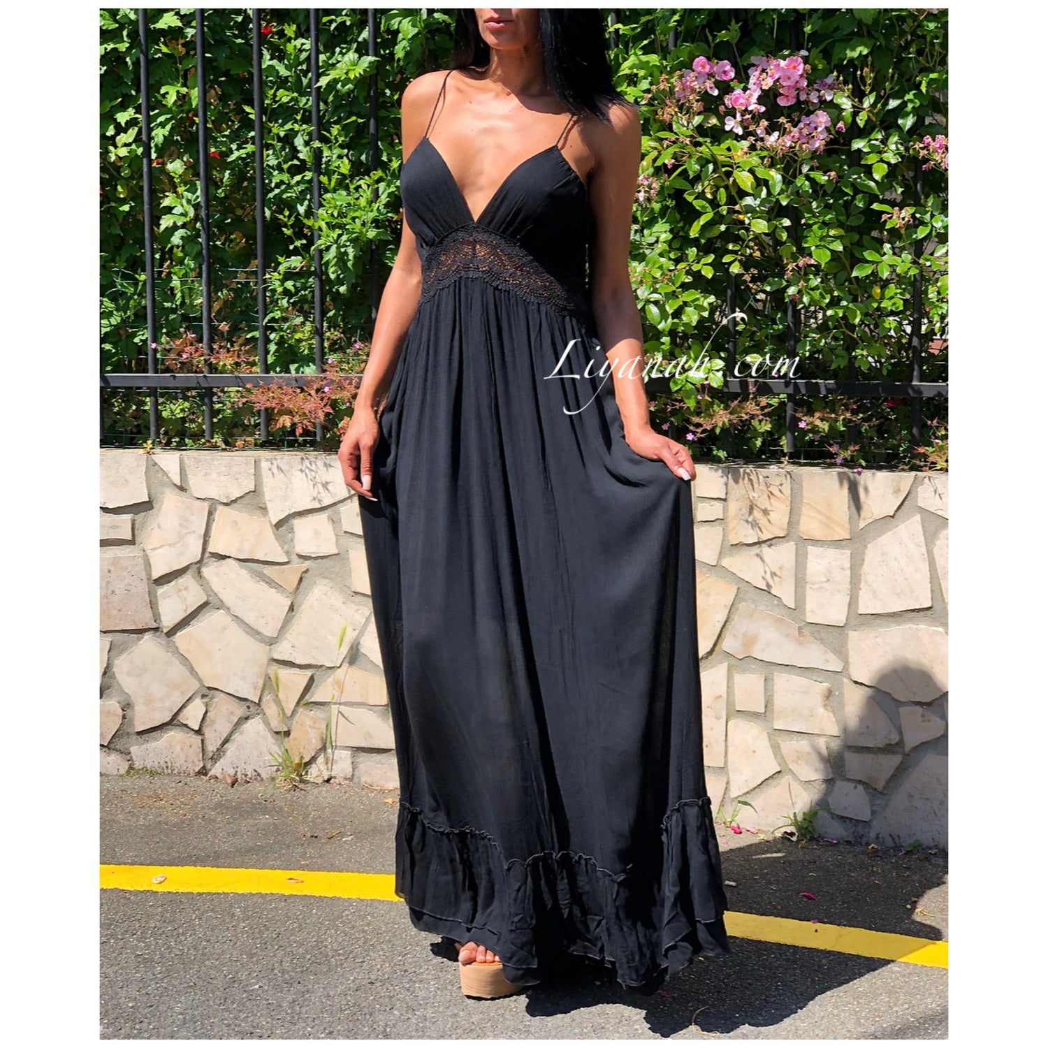 Une robe longue avec un dos nu, détail dentelle et noeud au cou, modèle épais avec doublure, jolie décolleté - Très agréable à porter et fluide - 65% Coton 35% Polyester - Taille S au L (Notre modèle fait une taille 34, mesure 1m70 et porte une taille S