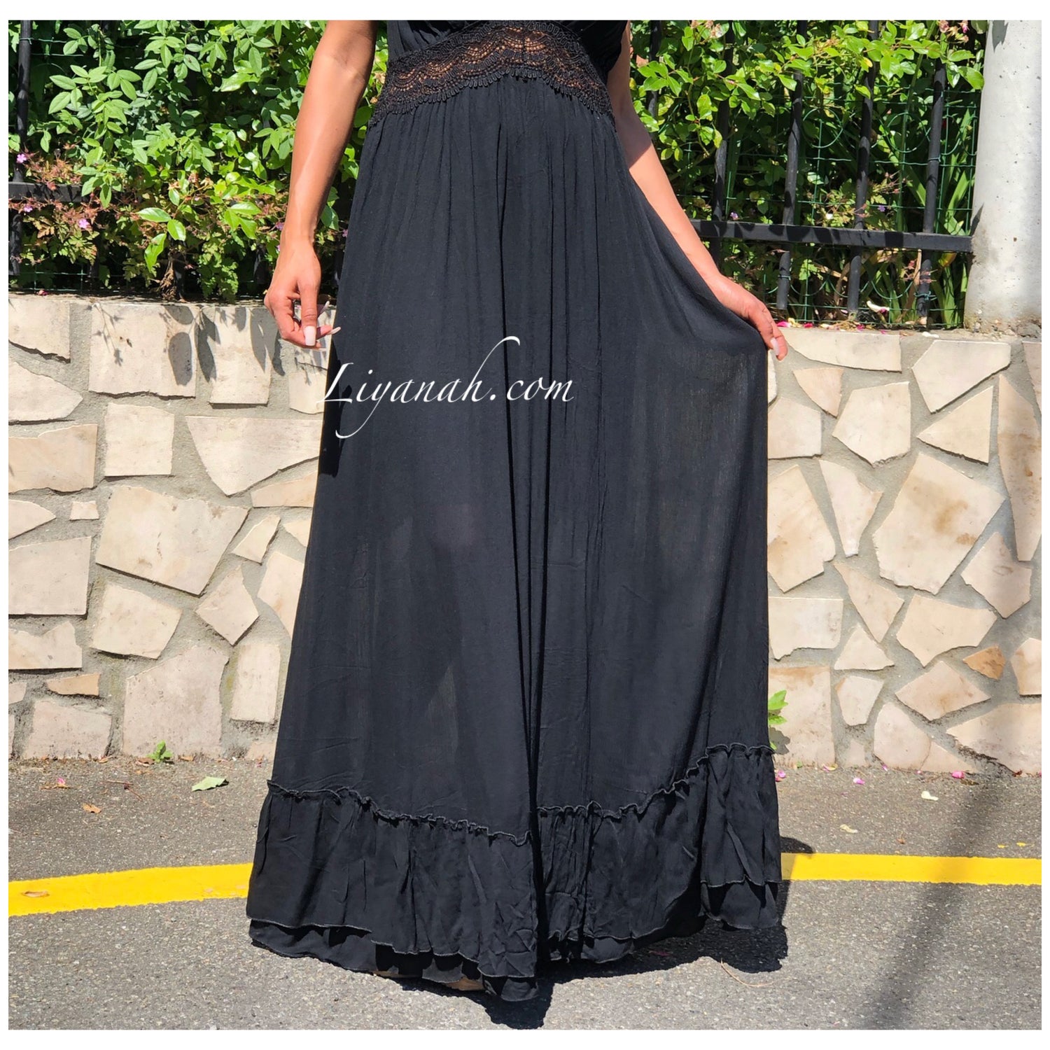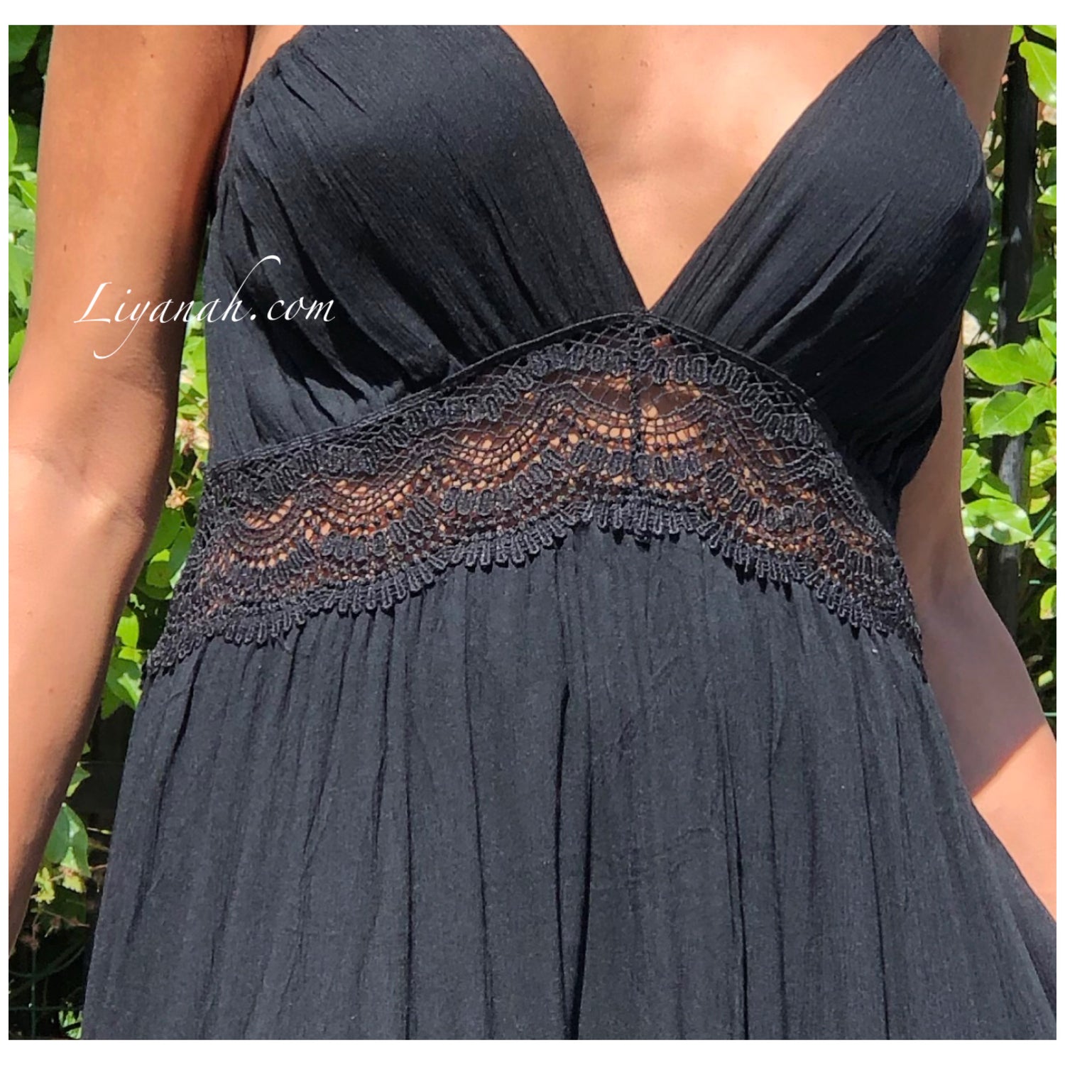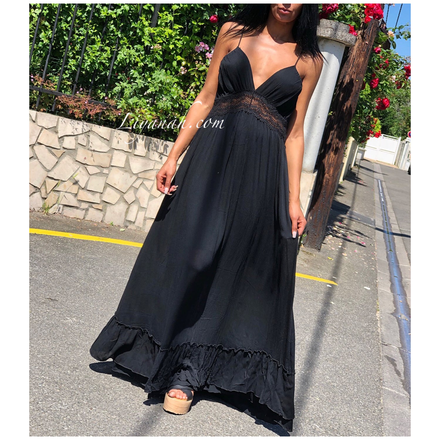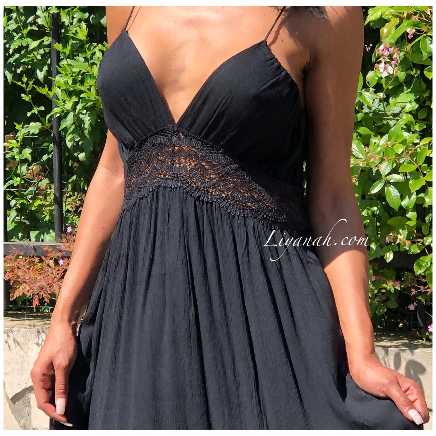 Une robe longue avec un dos nu, détail dentelle et noeud au cou, modèle épais avec doublure, jolie décolleté - Très agréable à porter et fluide - 65% Coton 35% Polyester - Taille S au L (Notre modèle fait une taille 34, mesure 1m70 et porte une taille S