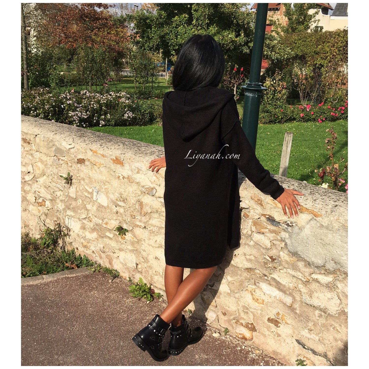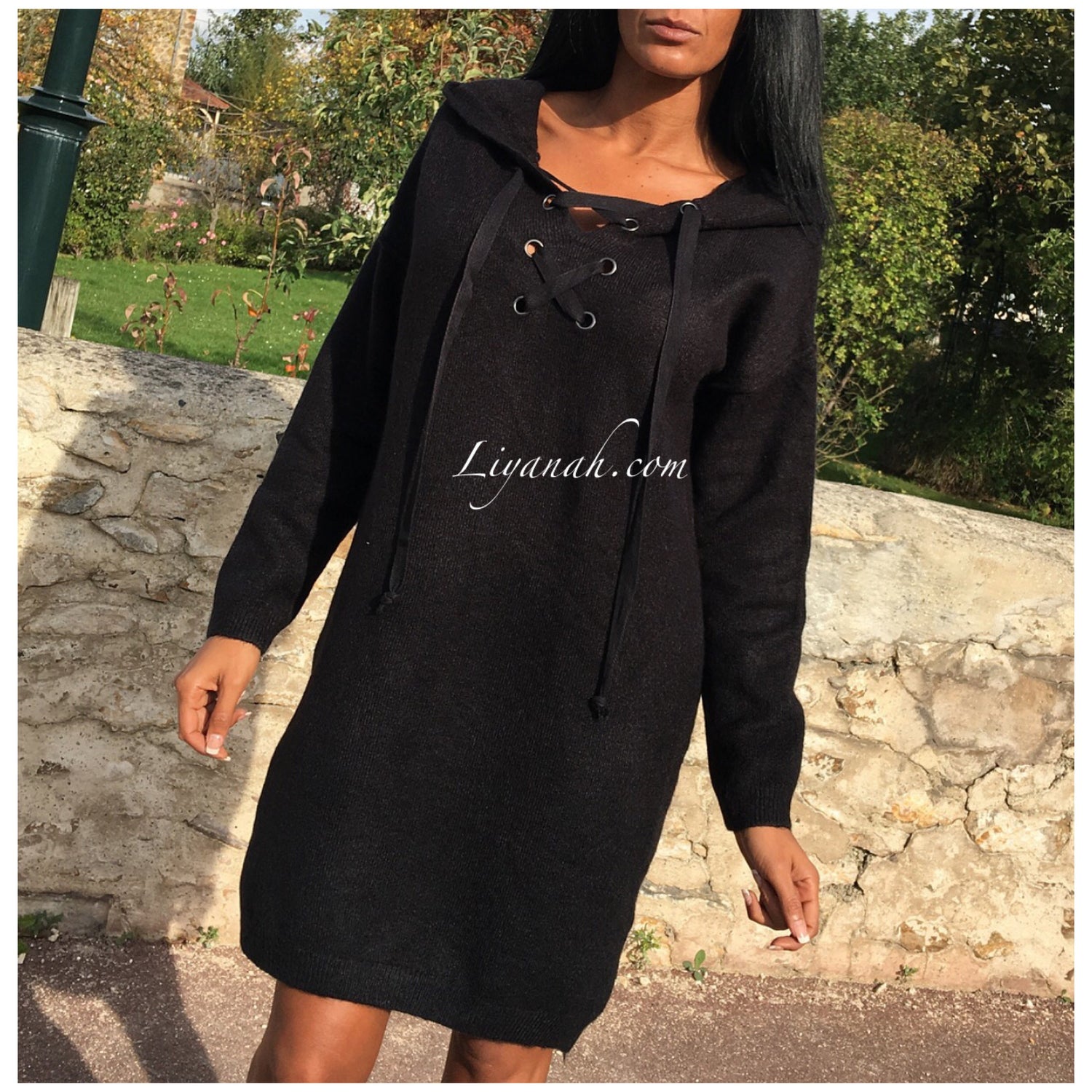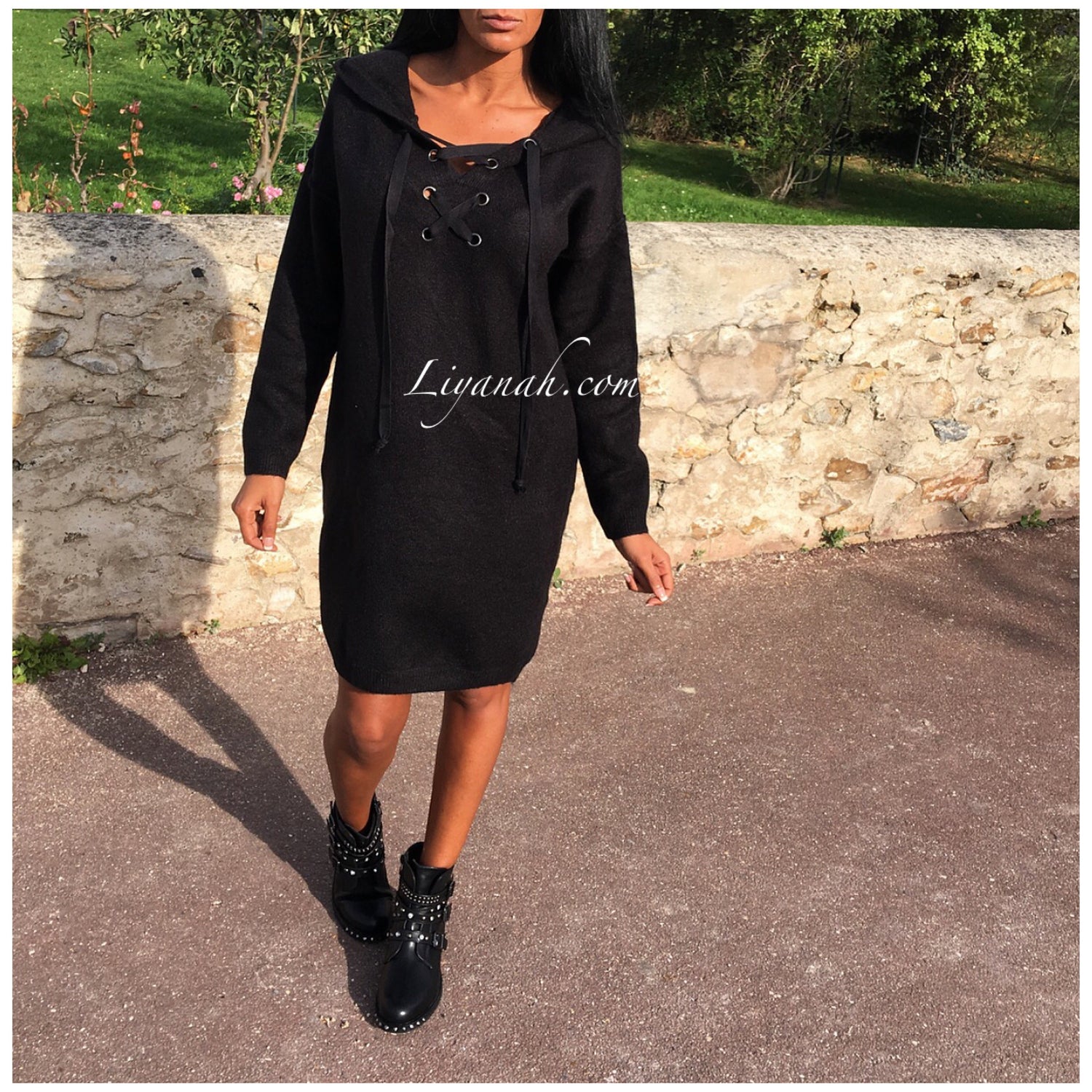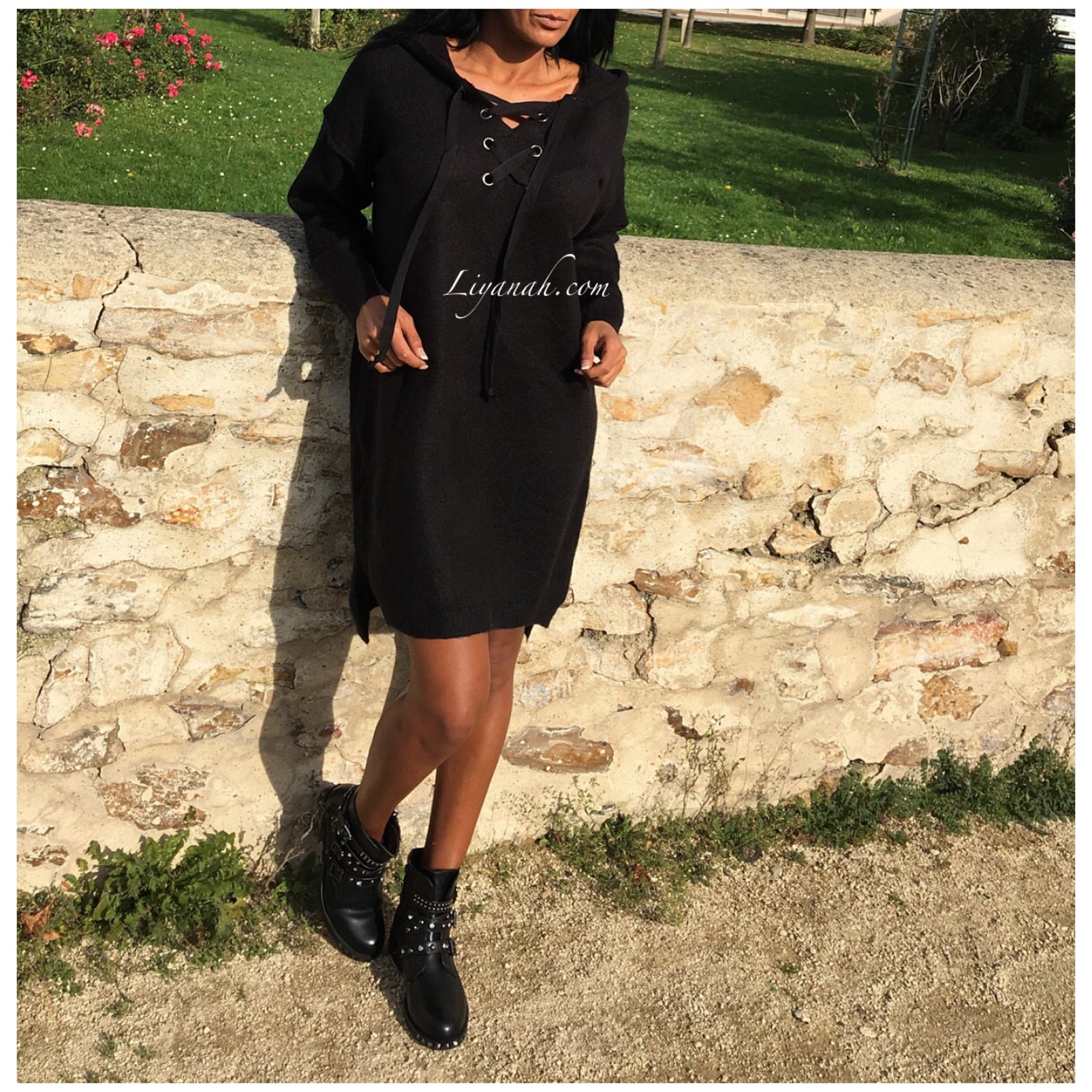ROBE PULL À CAPUCHE À NOEUDS Modèle MAKA NOIR
