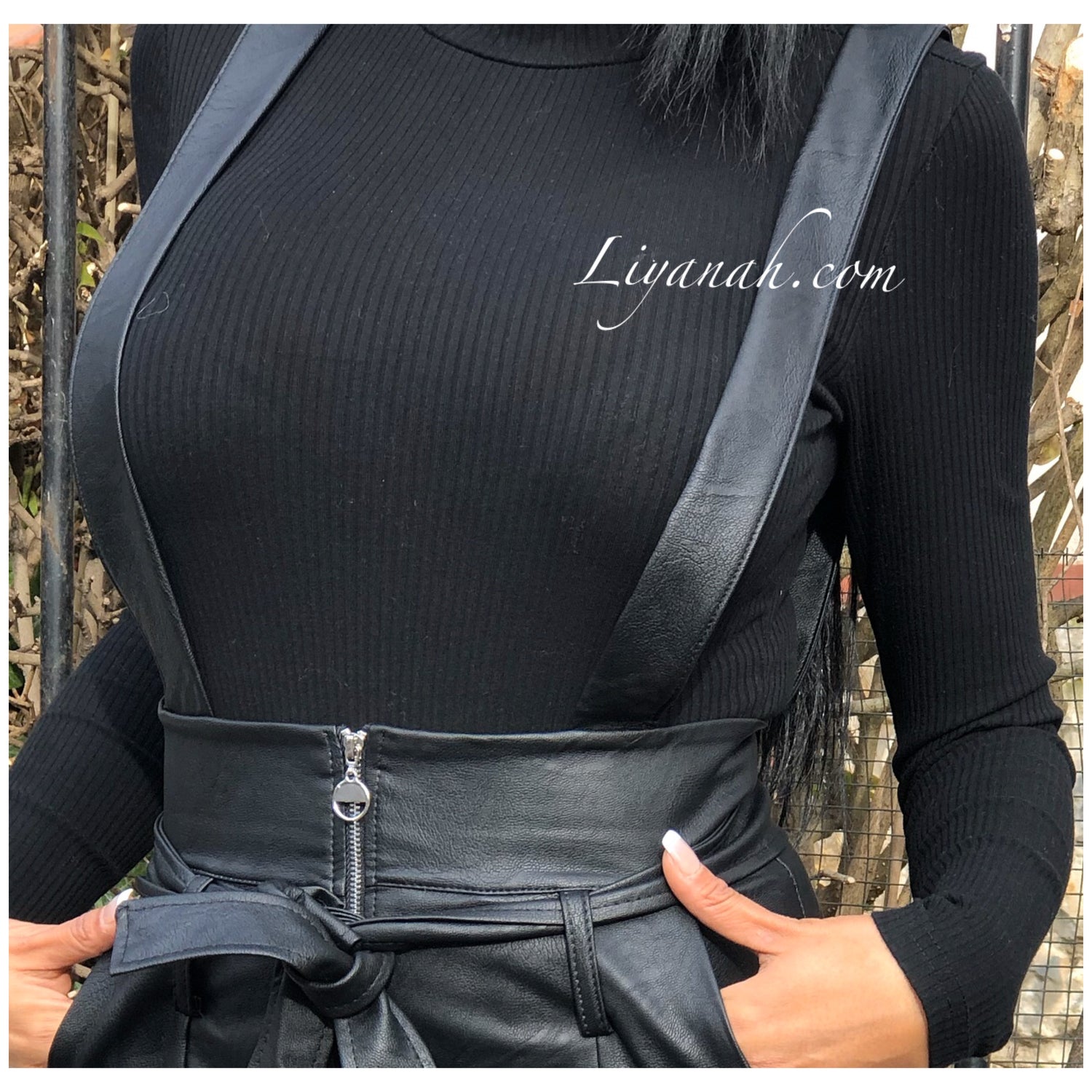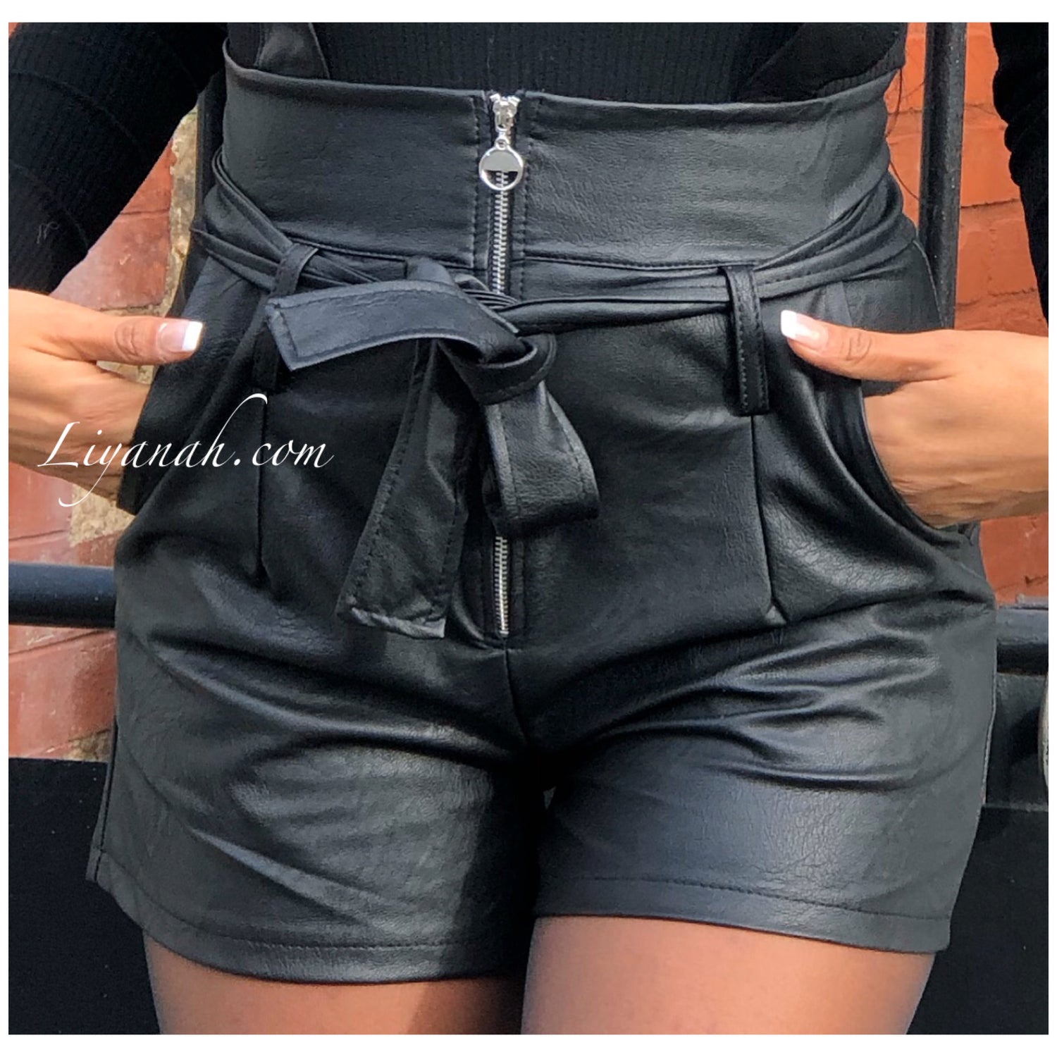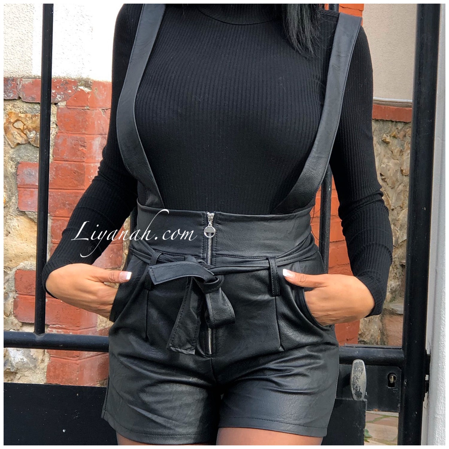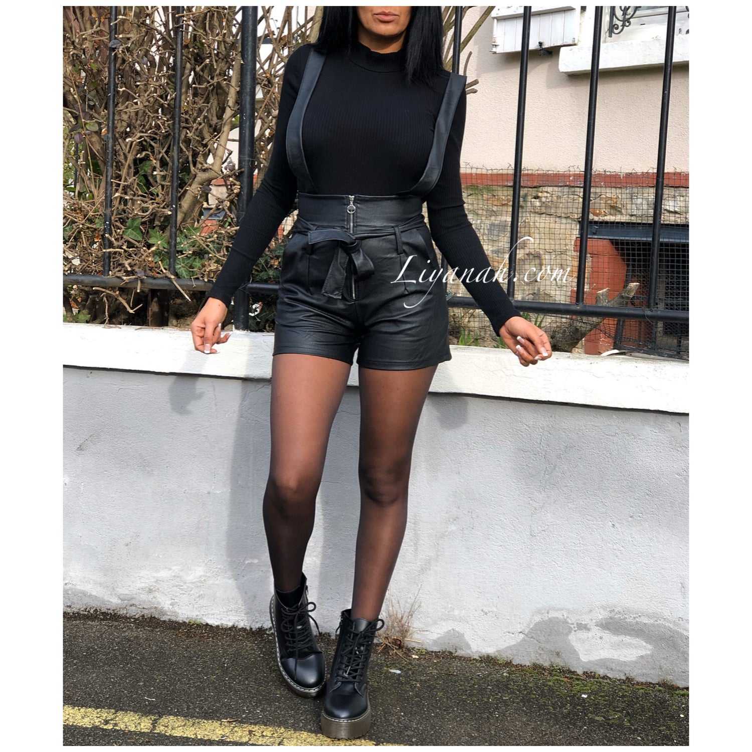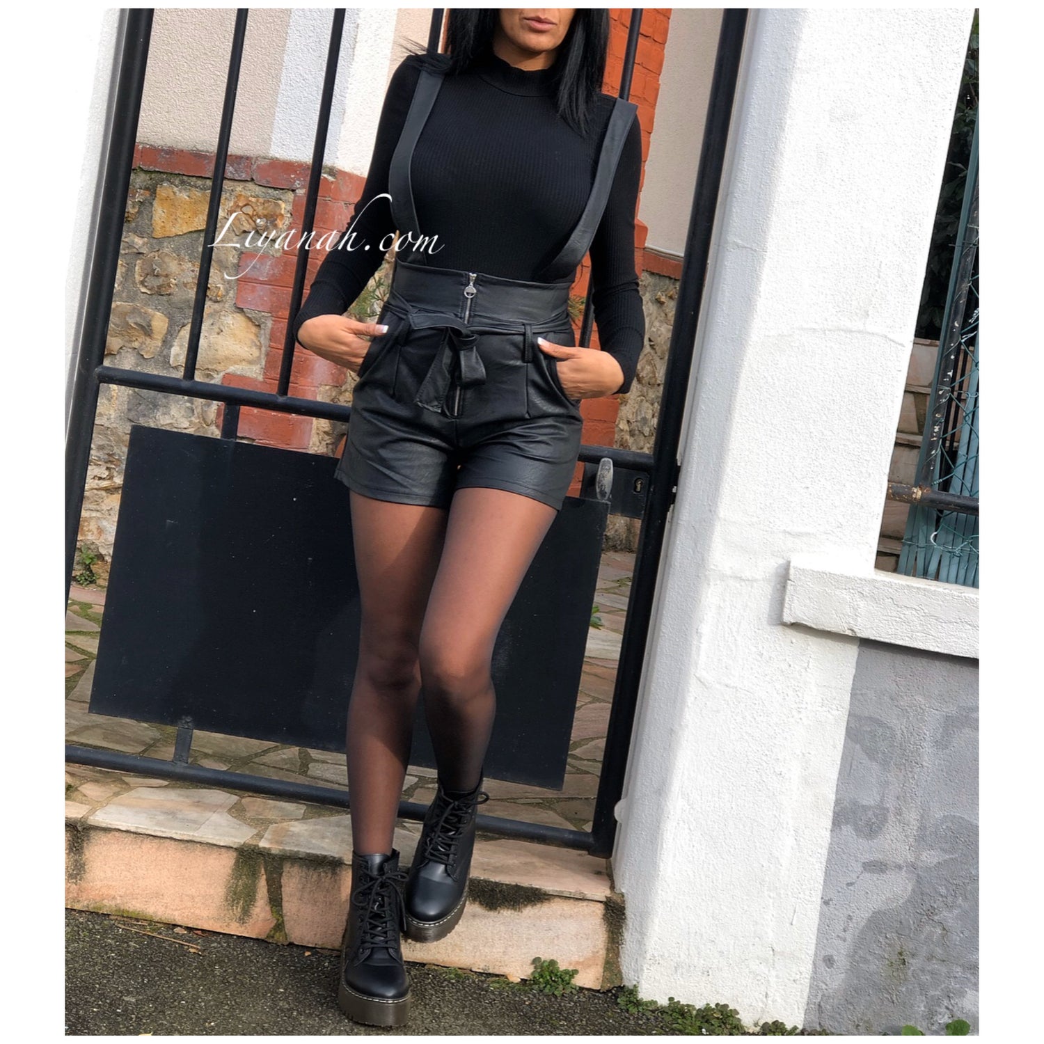 Short à bretelles Modèle AFIA NOIR - Short avec bretelles fixes, aspect cuir, court et coupe droite, fermeture ZIP à l’avant, ceinture à nouer, taille haute- 97% Polyester 3% Elasthanne - Taille S au L - Notre modèle mesure 1m70, fait une taille 34 et porte une taille S