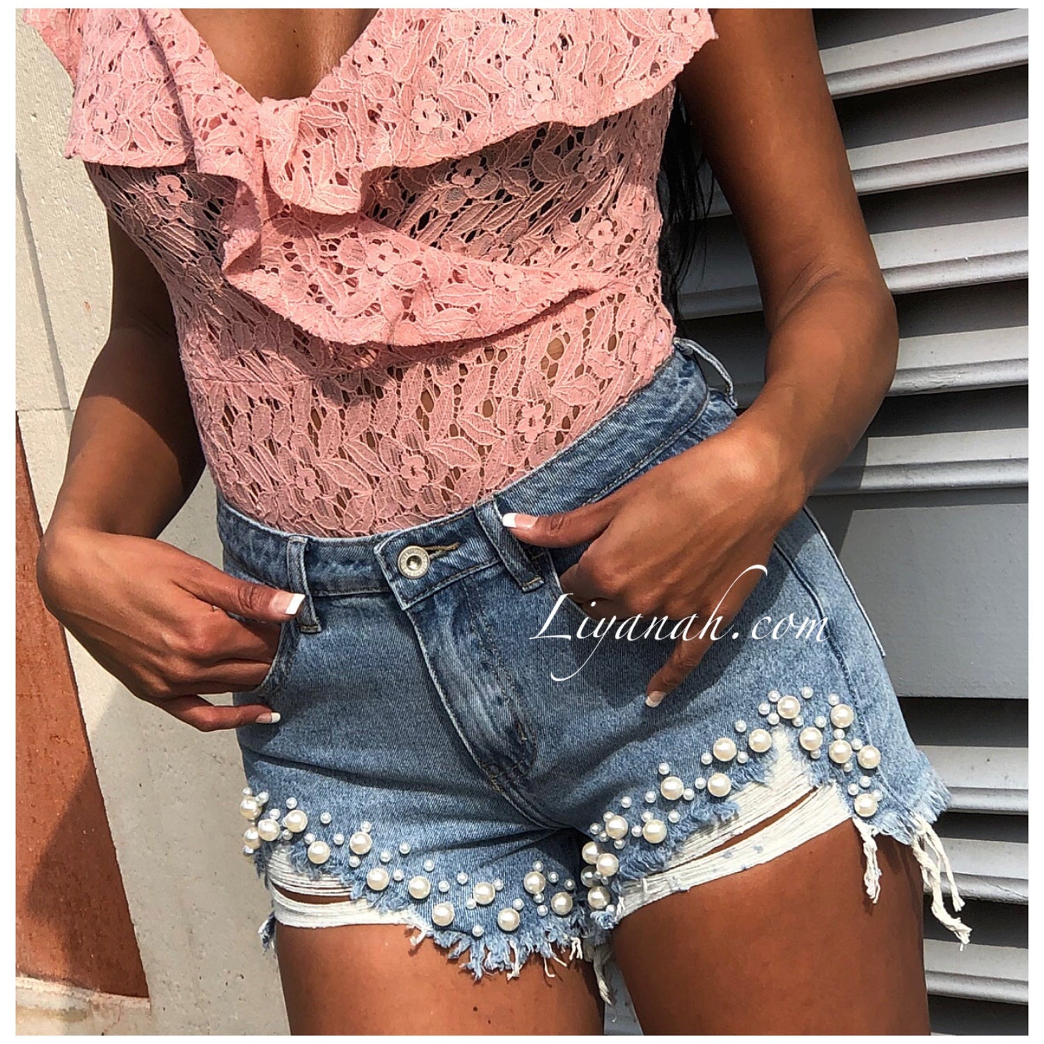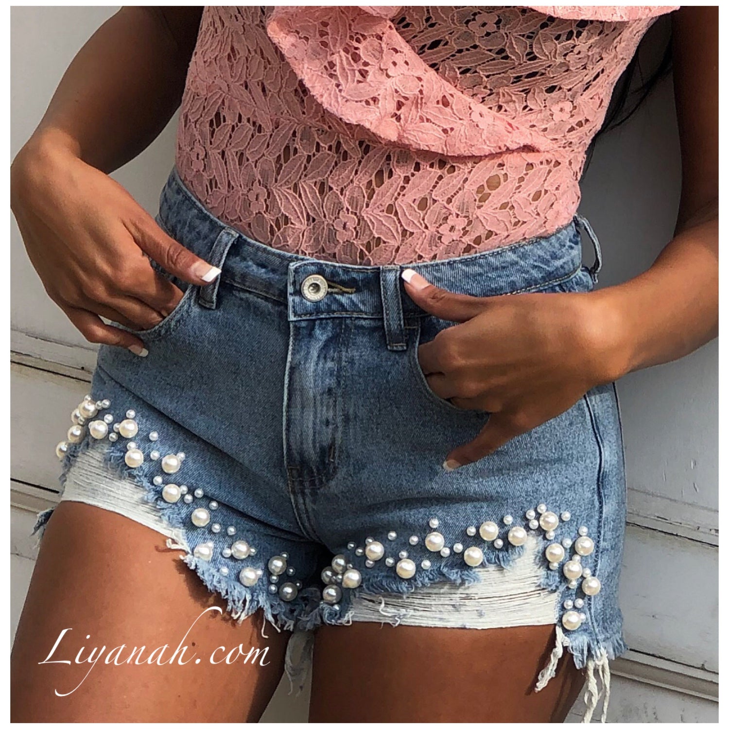 Totalement en Kiff sur ce Short court Taille normale en jean destroy avec ses PERLES !!! Totalement tendance !!!! Un effet déchiré, poches apparentes, Short près du corps