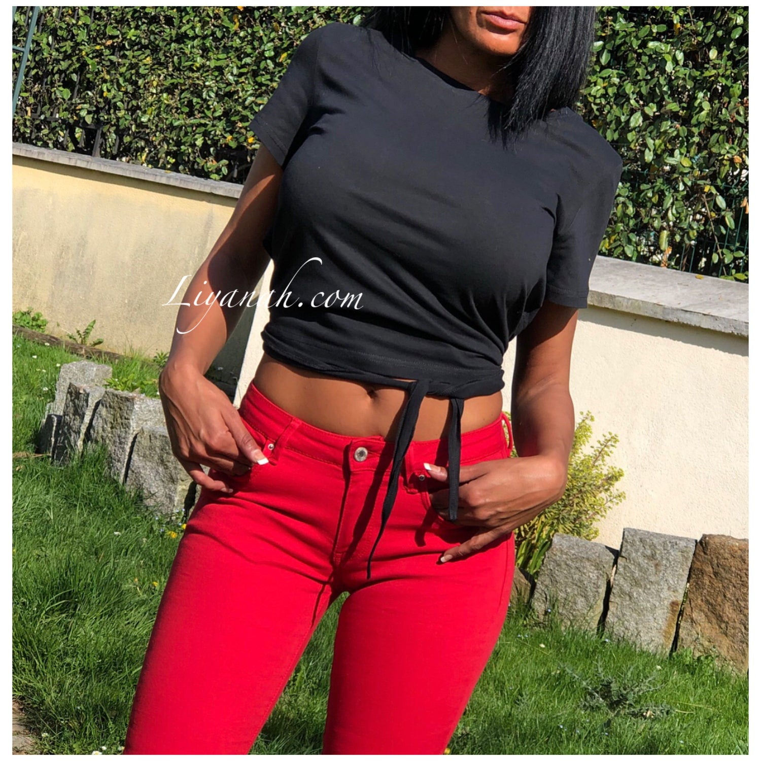 T-Shirt Modèle AMANE NOIR - Col Rond Et Encolure légèrement dégagée / A NOUER A L'ARRIÈRE ET A L'AVANT - 100% COTON (Taille S à L)