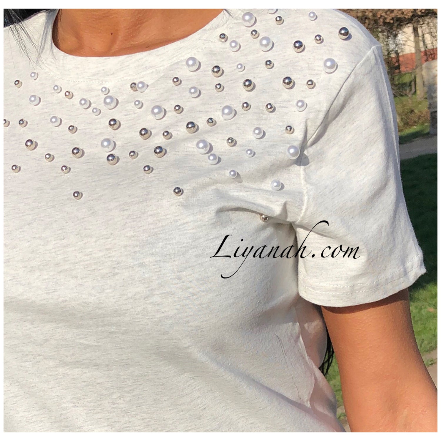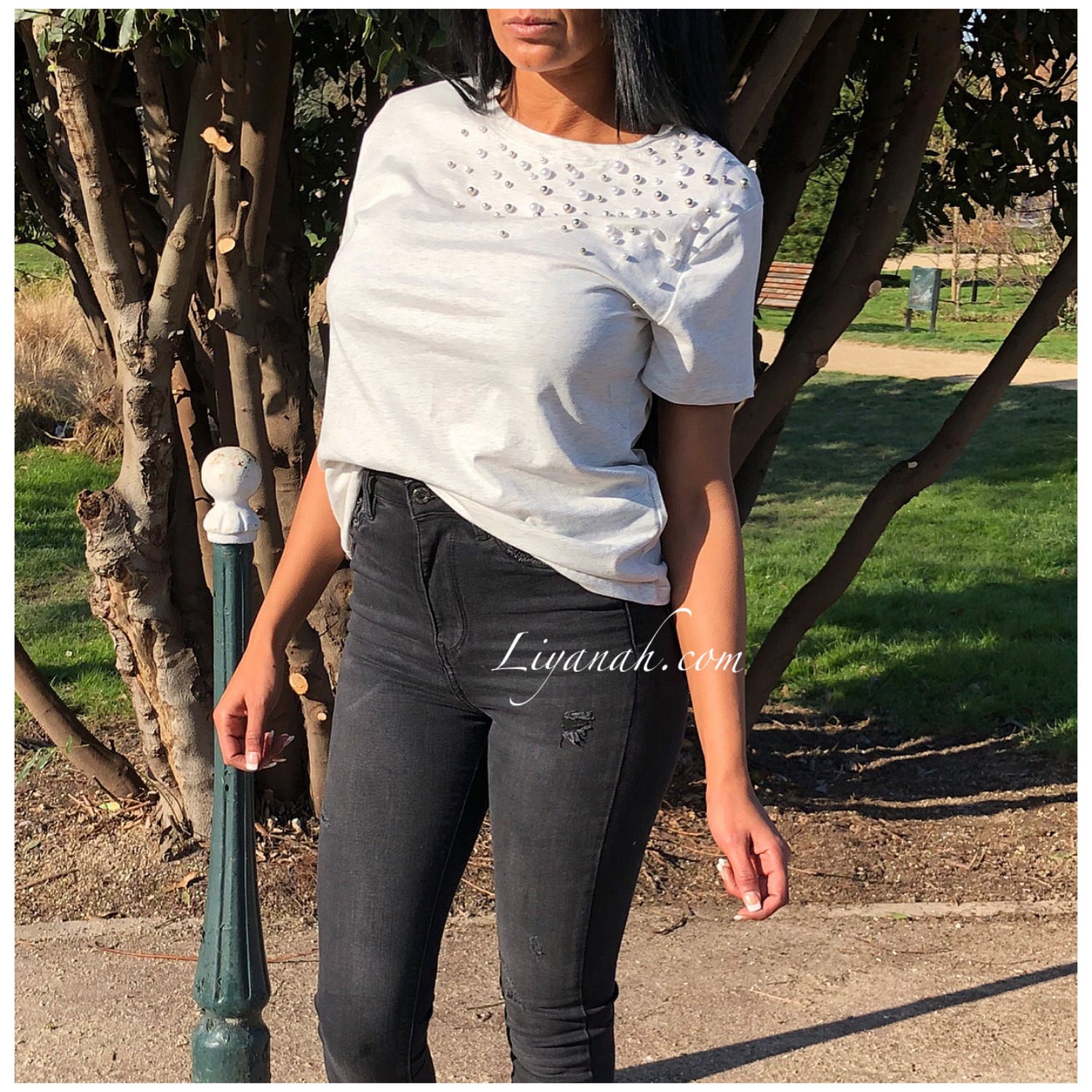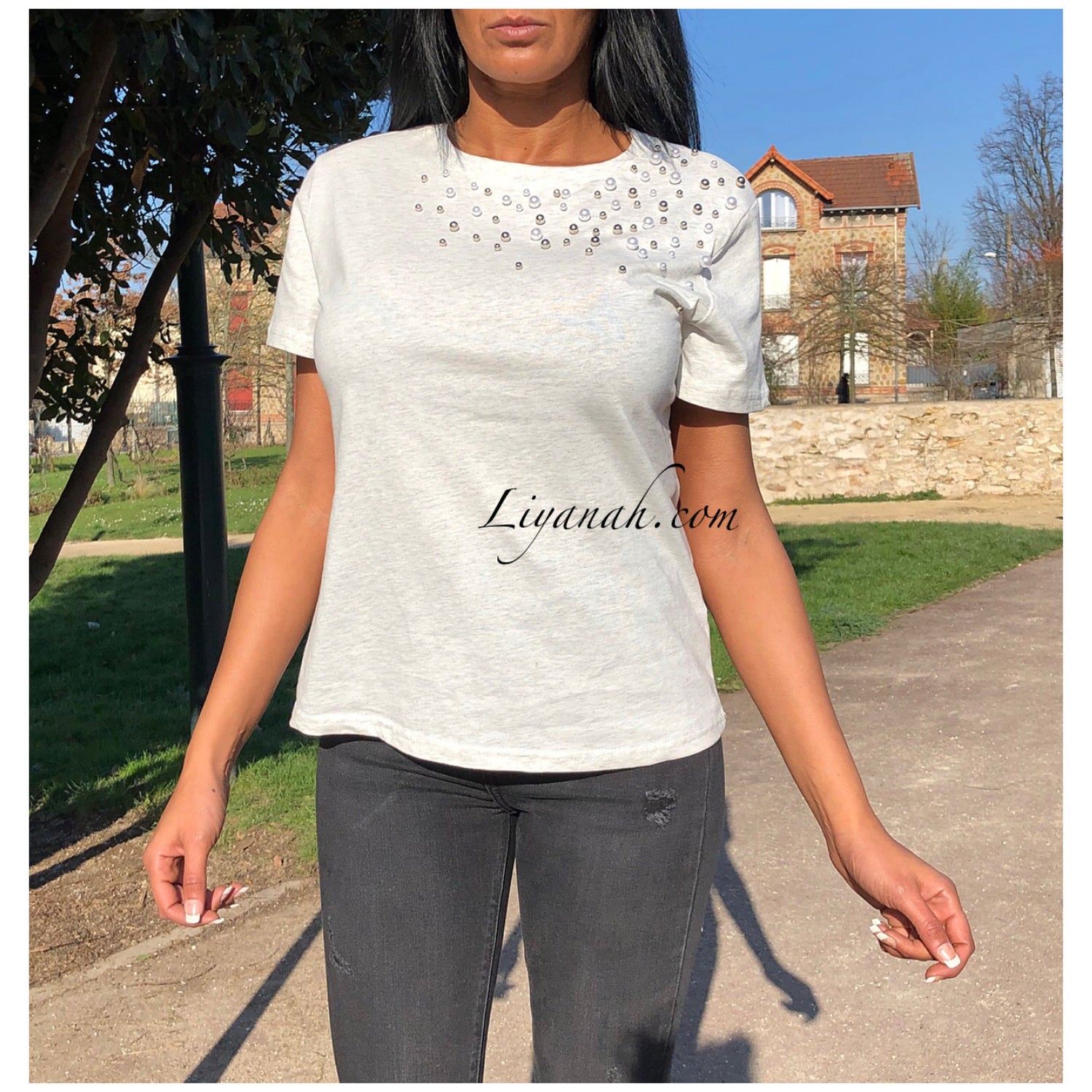T-shirt avec détails !! Perles sur l’épaule 🖤 Écru chiné gris !!! Notre modèle porte une taille S et fait une taille 34 !! Couleurs disponibles Écru/Gris ou Noir -Taille S au L (Matières : 100% COTON)