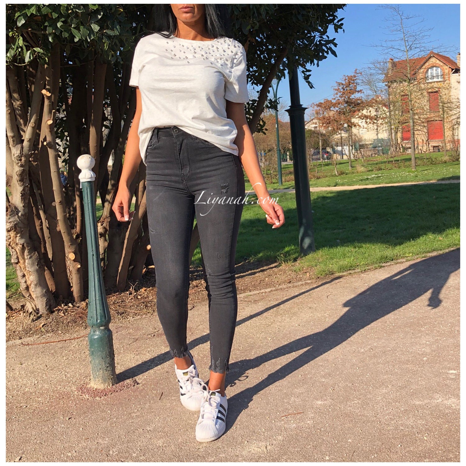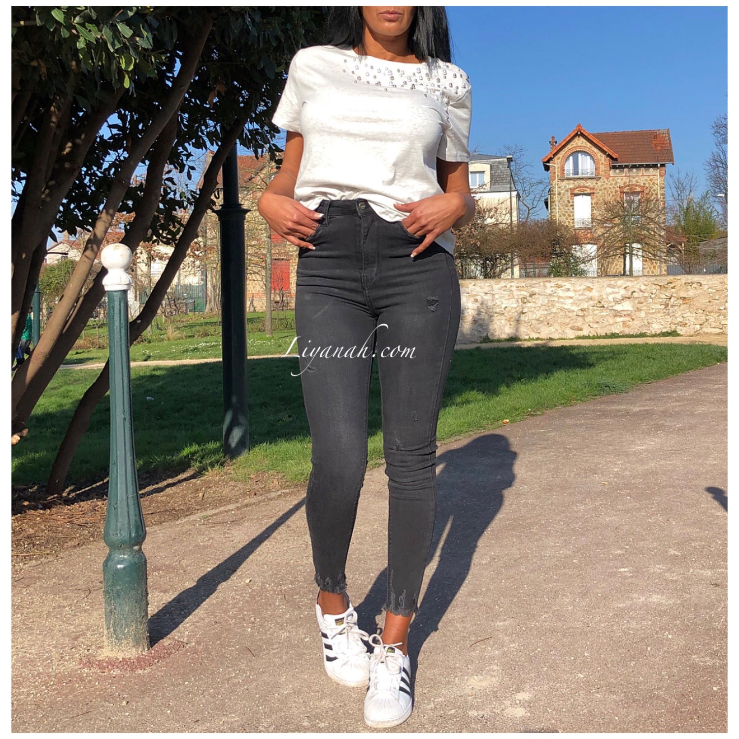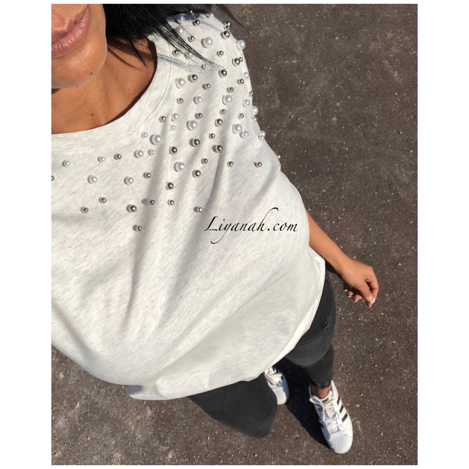 T-shirt avec détails !! Perles sur l’épaule 🖤 Écru chiné gris !!! Notre modèle porte une taille S et fait une taille 34 !! Couleurs disponibles Écru/Gris ou Noir -Taille S au L (Matières : 100% COTON)