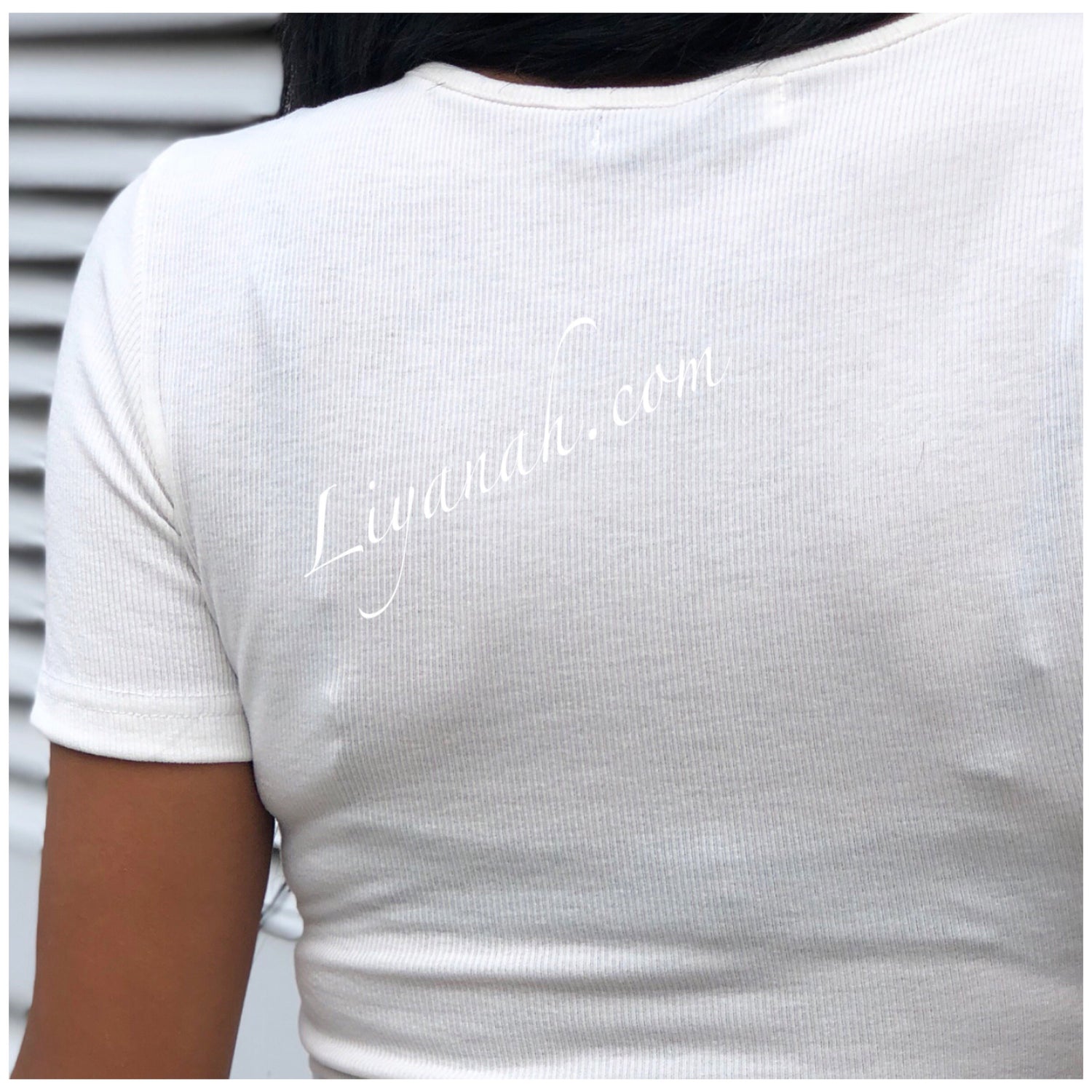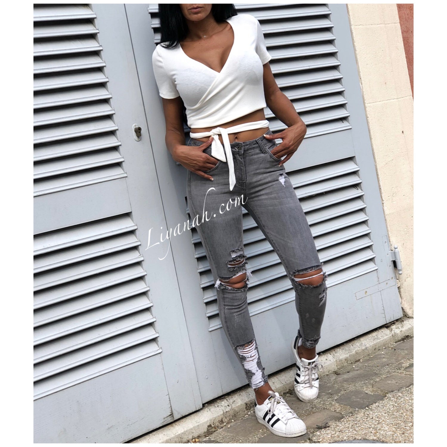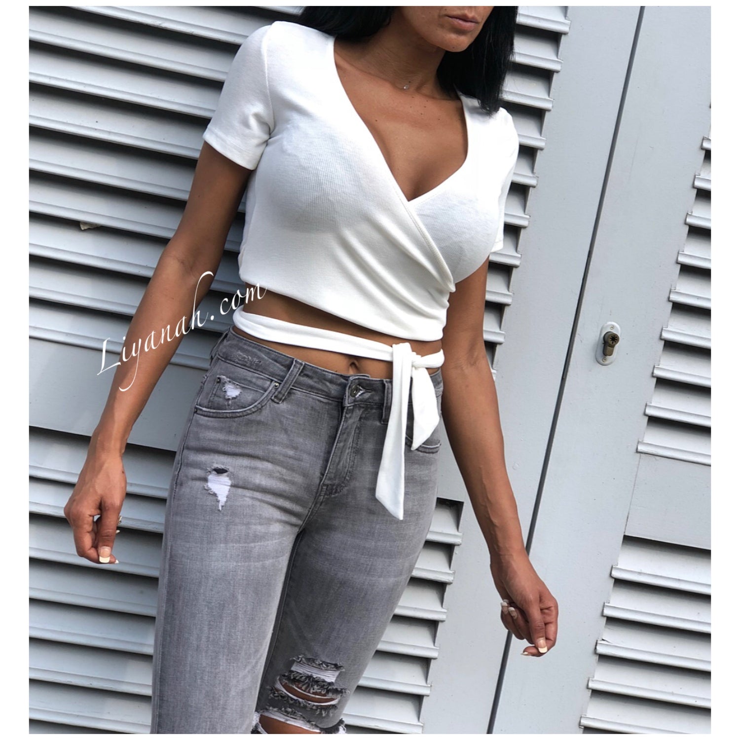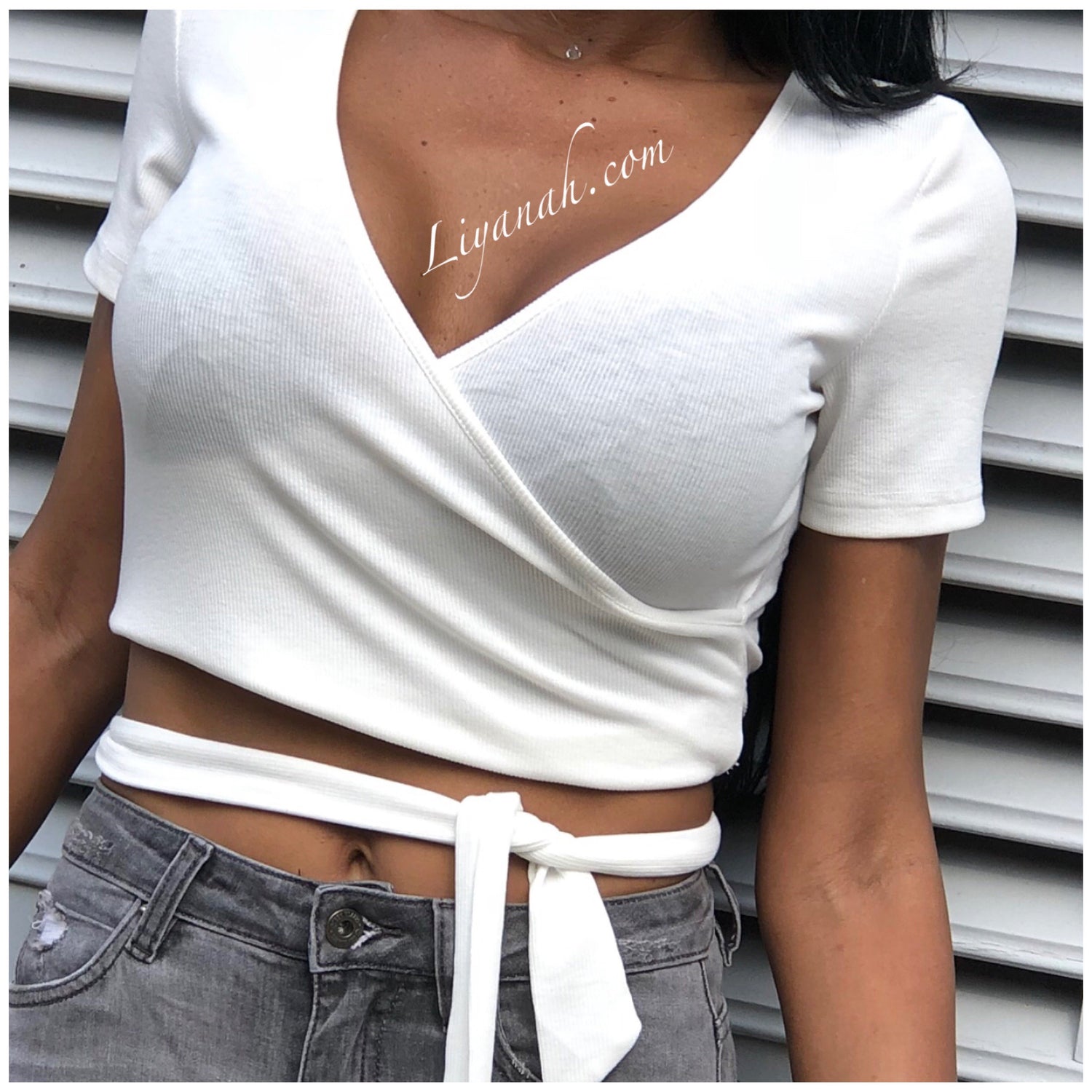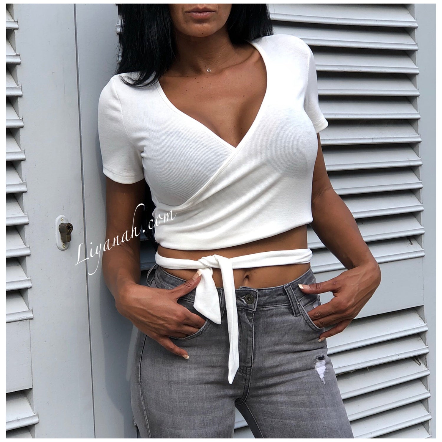 TOP Modèle WILNA BLANC - Top court aspect cache coeur avec noeud à nouer fixe - Matière agréable à porter !! Tissus Côtelé 💋 60% Polyester 35% Coton 5% Elasthanne 🖤 Taille SM ou ML