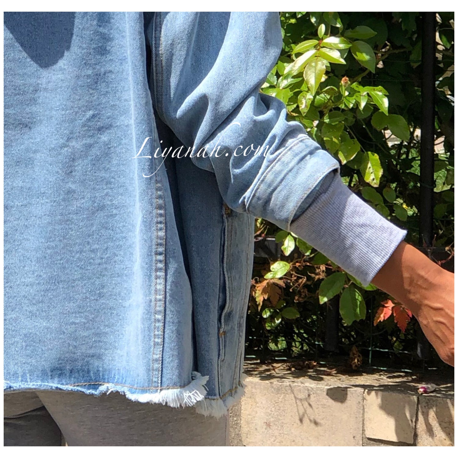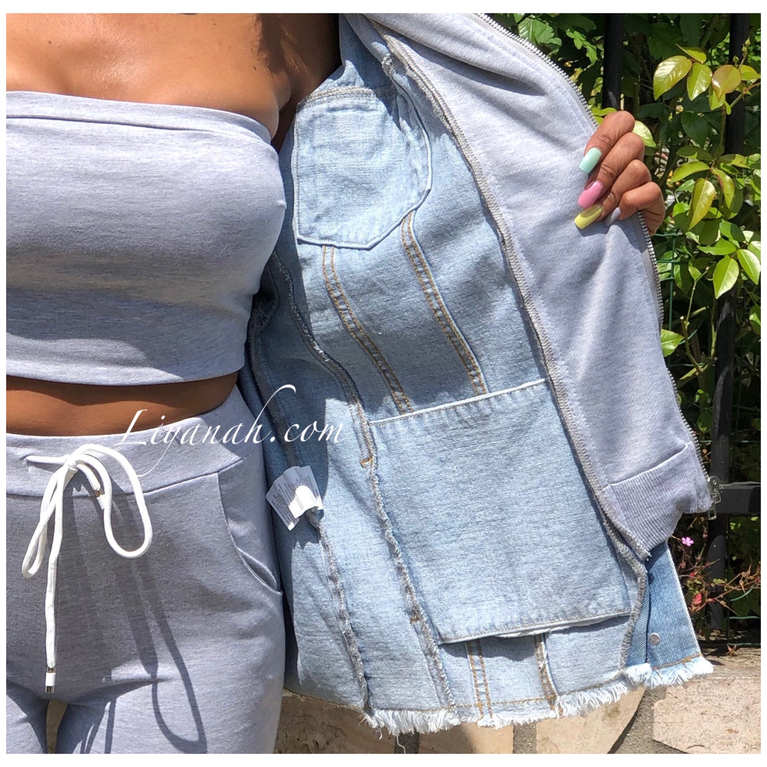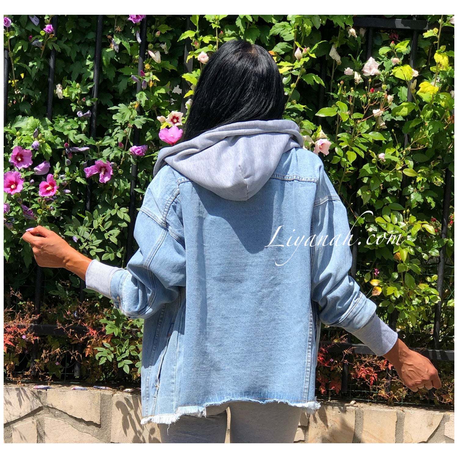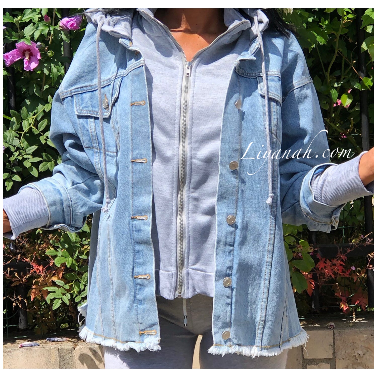 Veste jean BLEU CLAIR / Sweat GRIS CLAIR - COUPE LARGE, modèle style SWEAT à capuche avec lien de serrage et manches, intérieur couture apparente, fermeture ZIP et boutons, 4 poches fonctionnelles dont deux à la poitrine - 100% COTON - Taille 34/36 ou 38/40 - Notre modèle mesure 1m70, fait une taille 34 et porte une taille XS/S