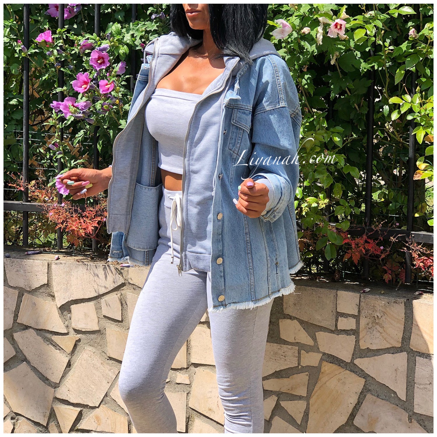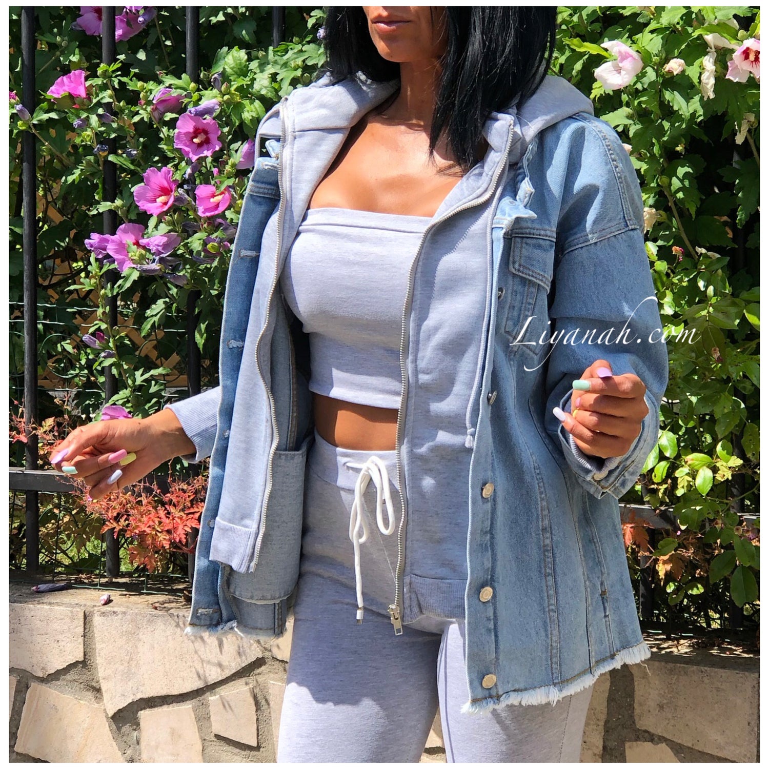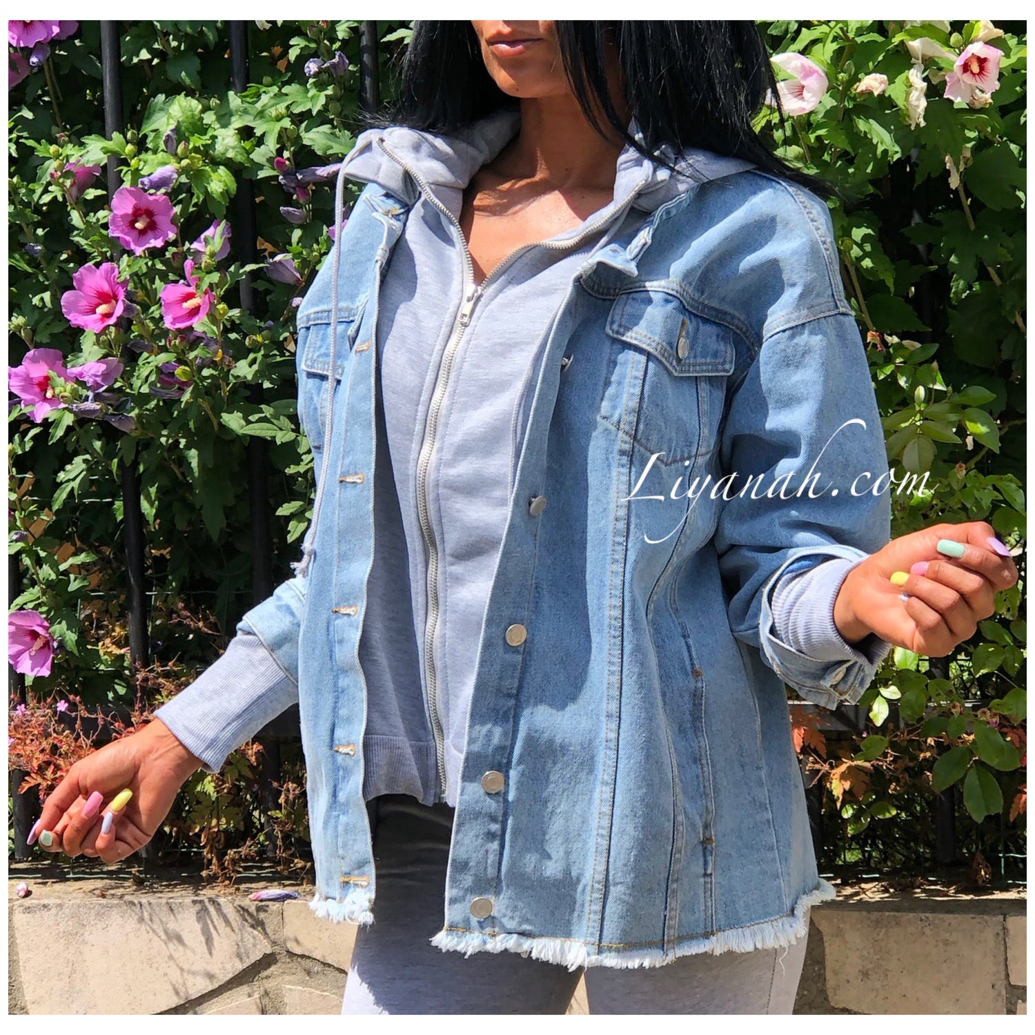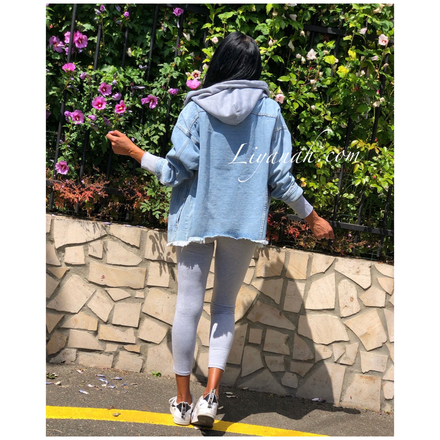 Veste jean BLEU CLAIR / Sweat GRIS CLAIR - COUPE LARGE, modèle style SWEAT à capuche avec lien de serrage et manches, intérieur couture apparente, fermeture ZIP et boutons, 4 poches fonctionnelles dont deux à la poitrine - 100% COTON - Taille 34/36 ou 38/40 - Notre modèle mesure 1m70, fait une taille 34 et porte une taille XS/S