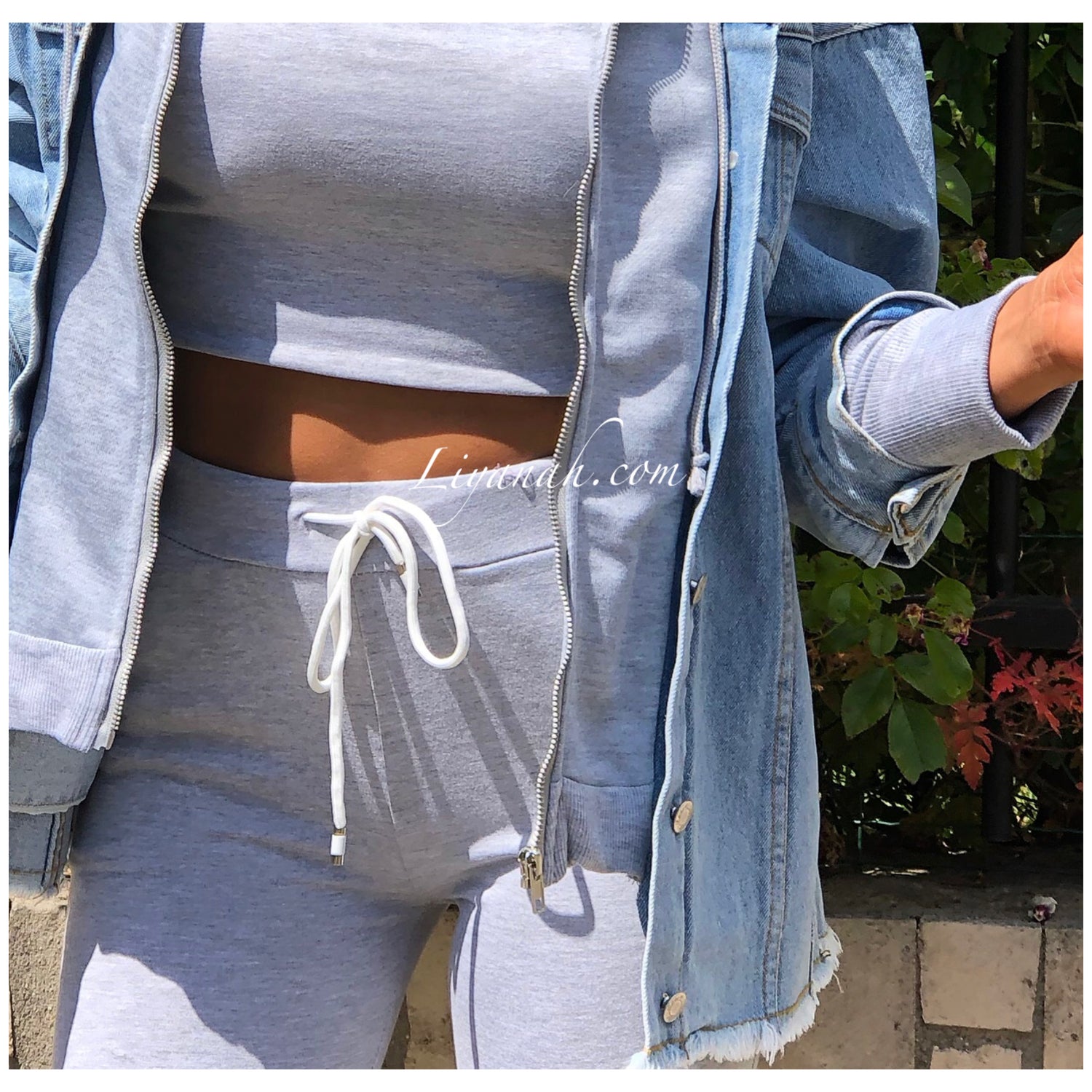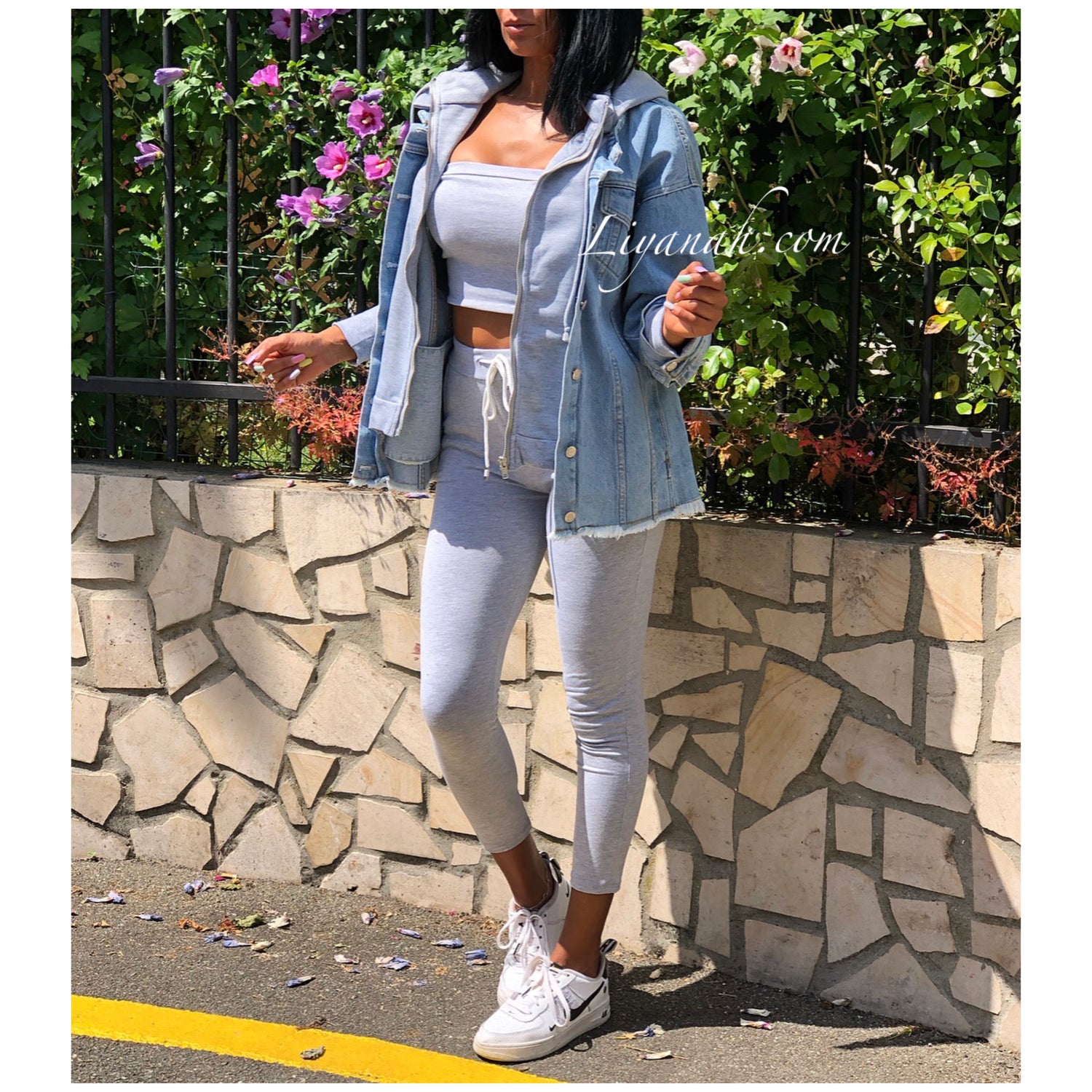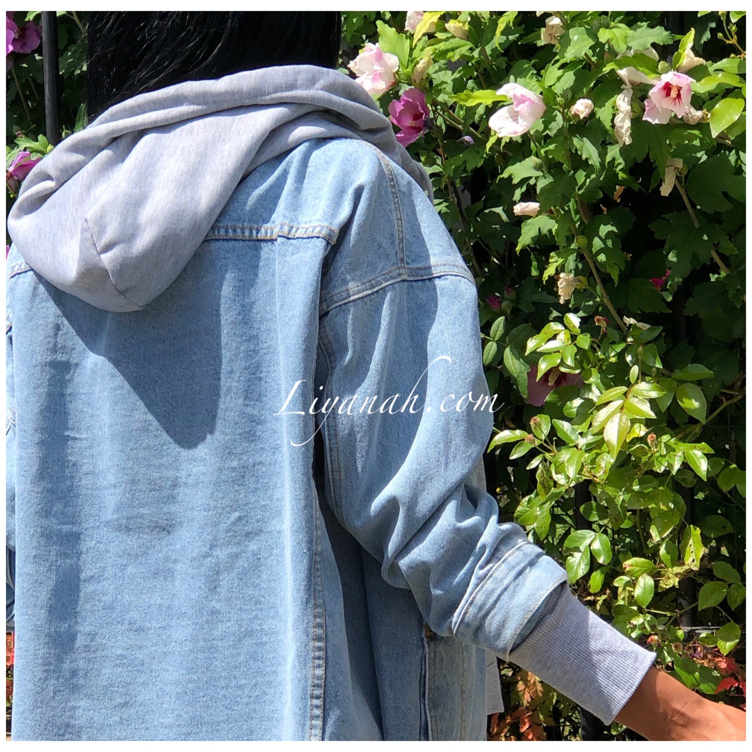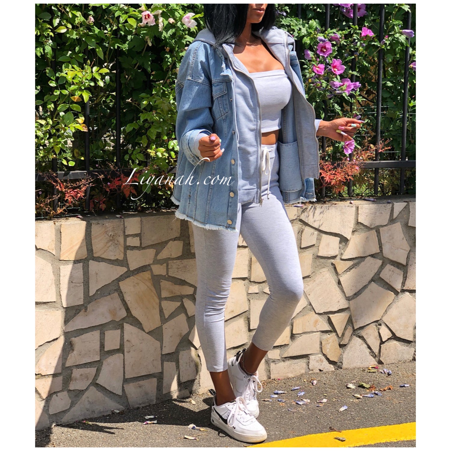 Veste jean BLEU CLAIR / Sweat GRIS CLAIR - COUPE LARGE, modèle style SWEAT à capuche avec lien de serrage et manches, intérieur couture apparente, fermeture ZIP et boutons, 4 poches fonctionnelles dont deux à la poitrine - 100% COTON - Taille 34/36 ou 38/40 - Notre modèle mesure 1m70, fait une taille 34 et porte une taille XS/S
