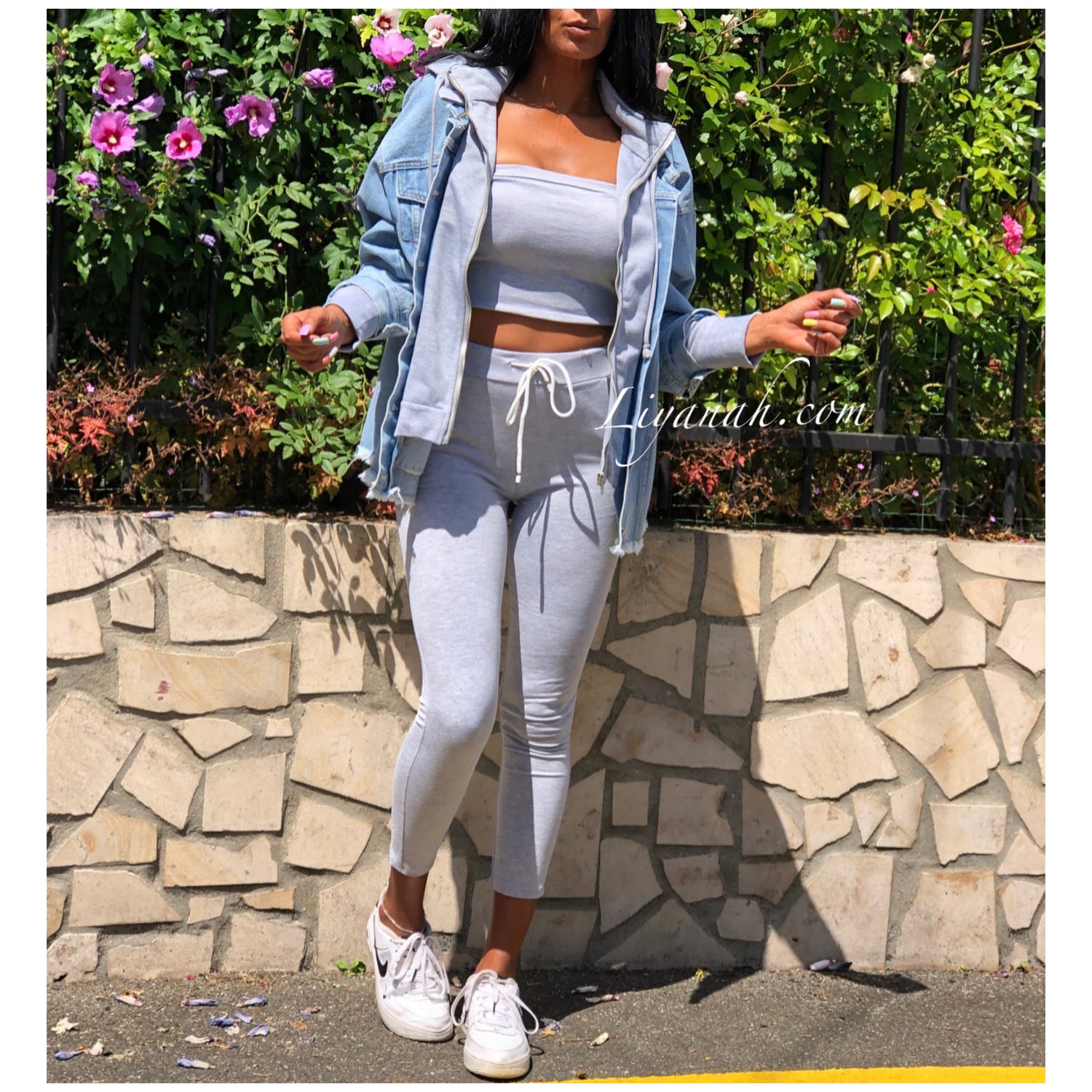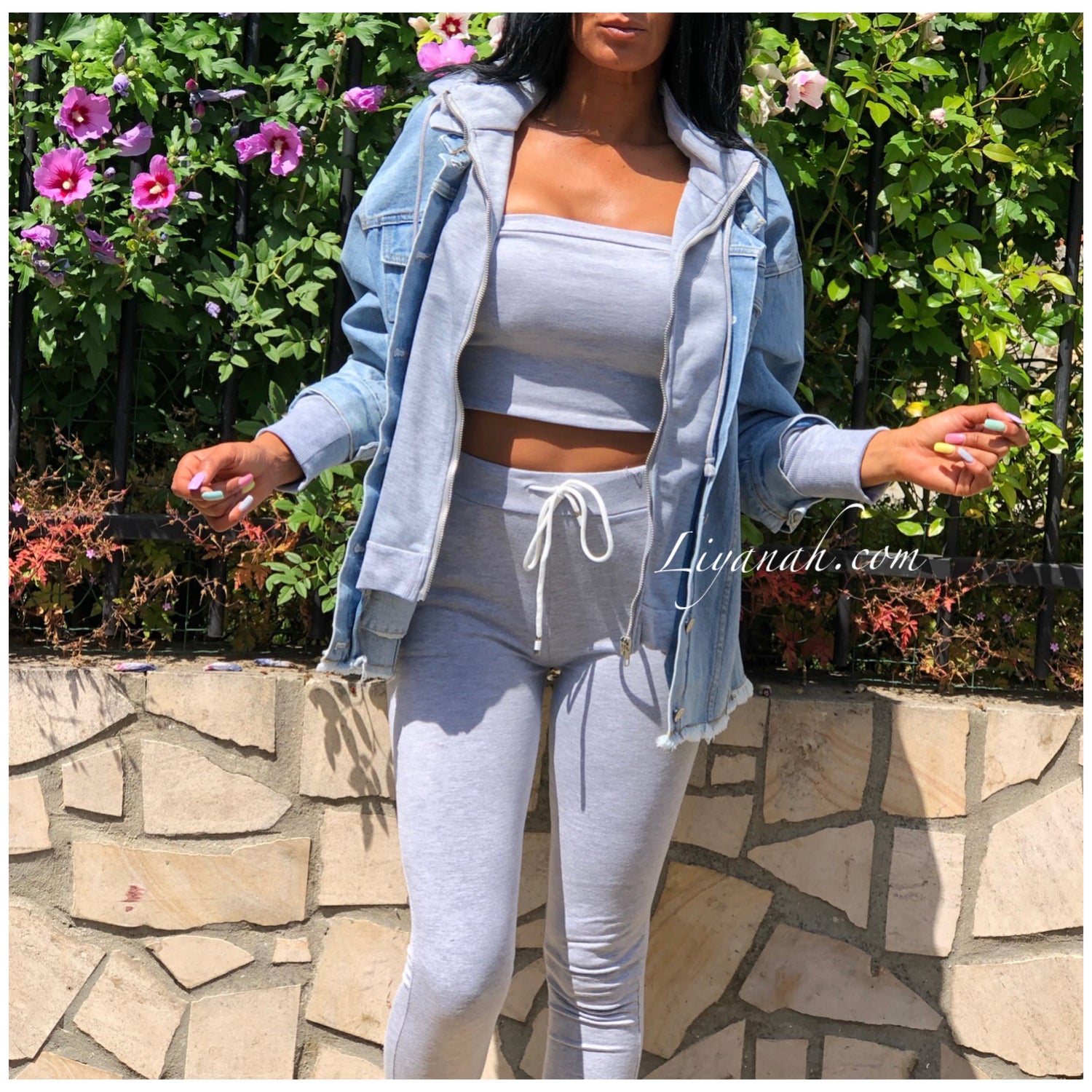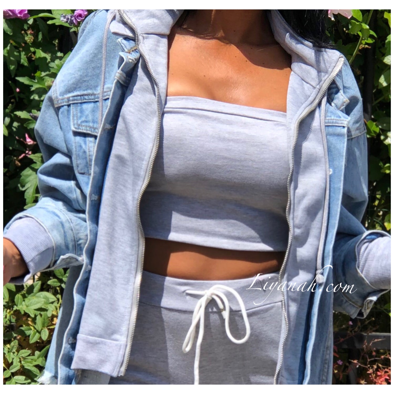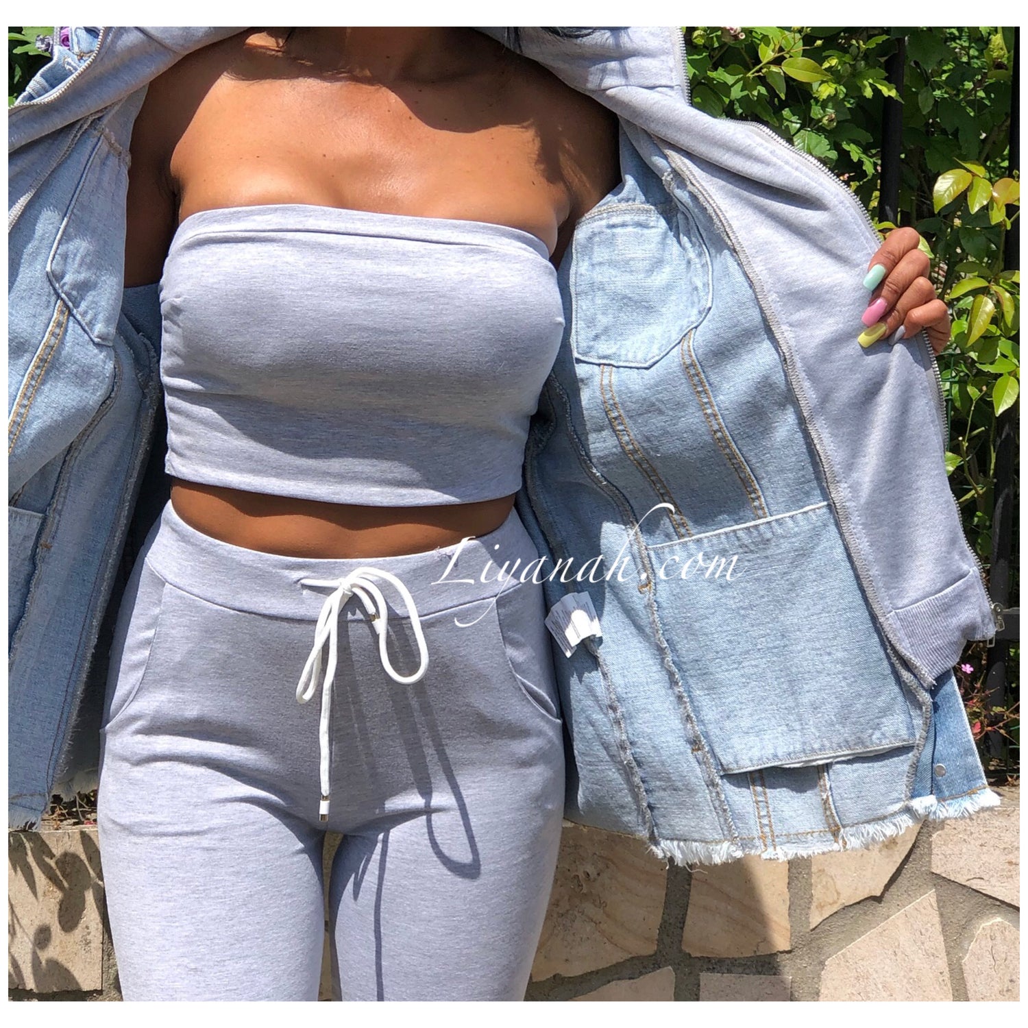 Veste jean BLEU CLAIR / Sweat GRIS CLAIR - COUPE LARGE, modèle style SWEAT à capuche avec lien de serrage et manches, intérieur couture apparente, fermeture ZIP et boutons, 4 poches fonctionnelles dont deux à la poitrine - 100% COTON - Taille 34/36 ou 38/40 - Notre modèle mesure 1m70, fait une taille 34 et porte une taille XS/S