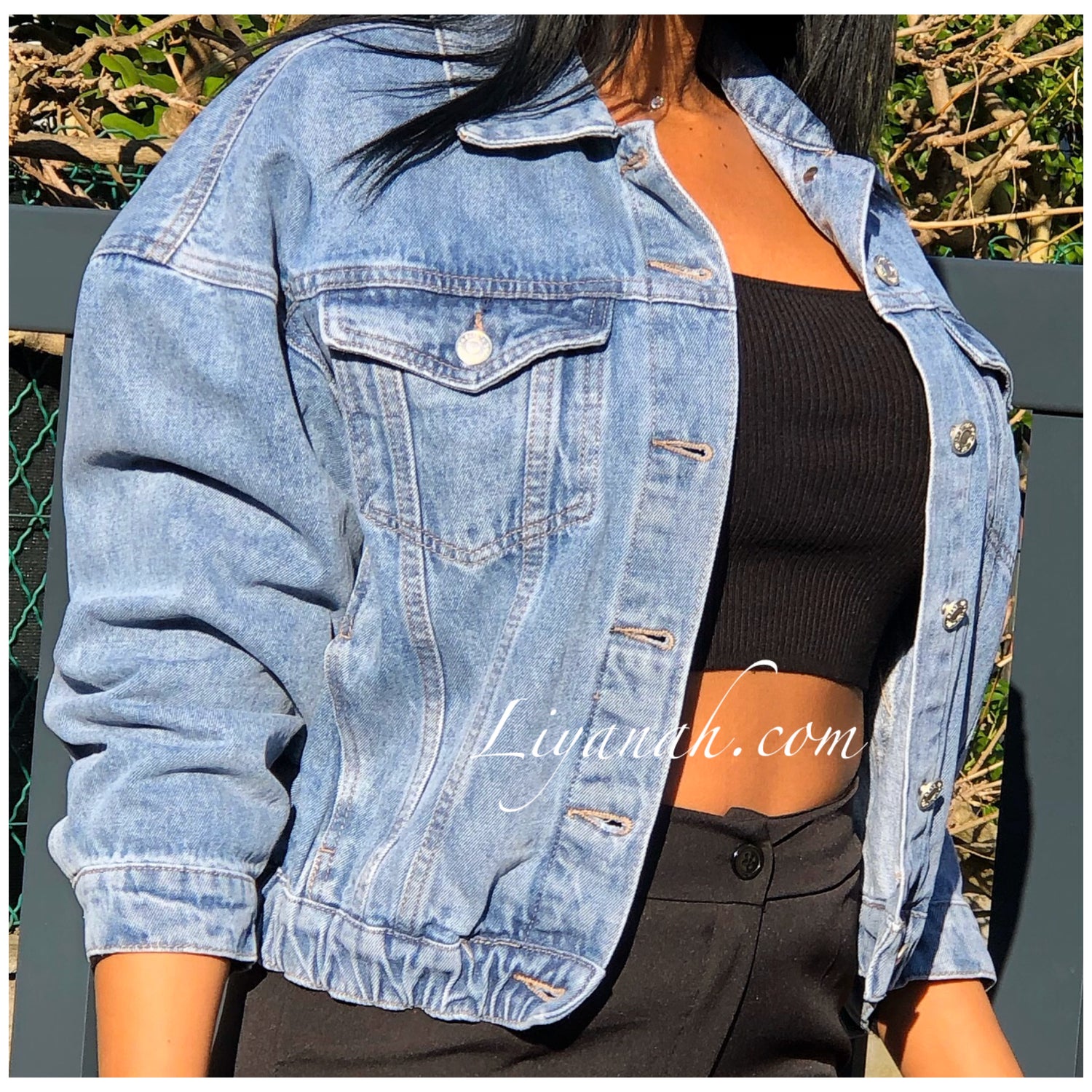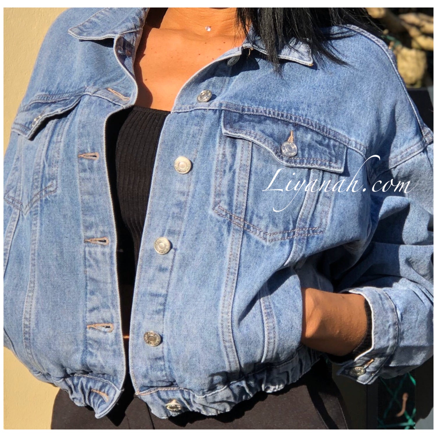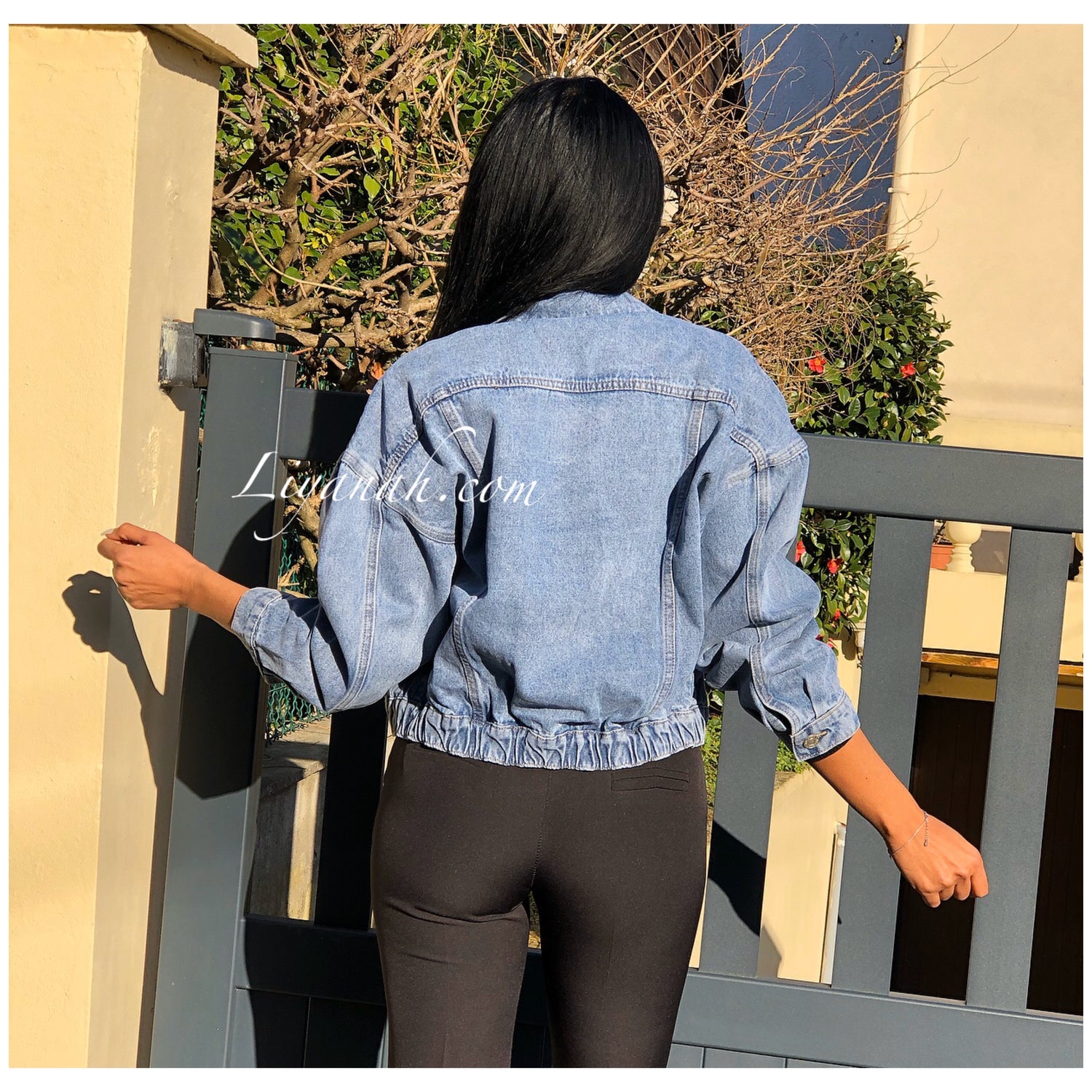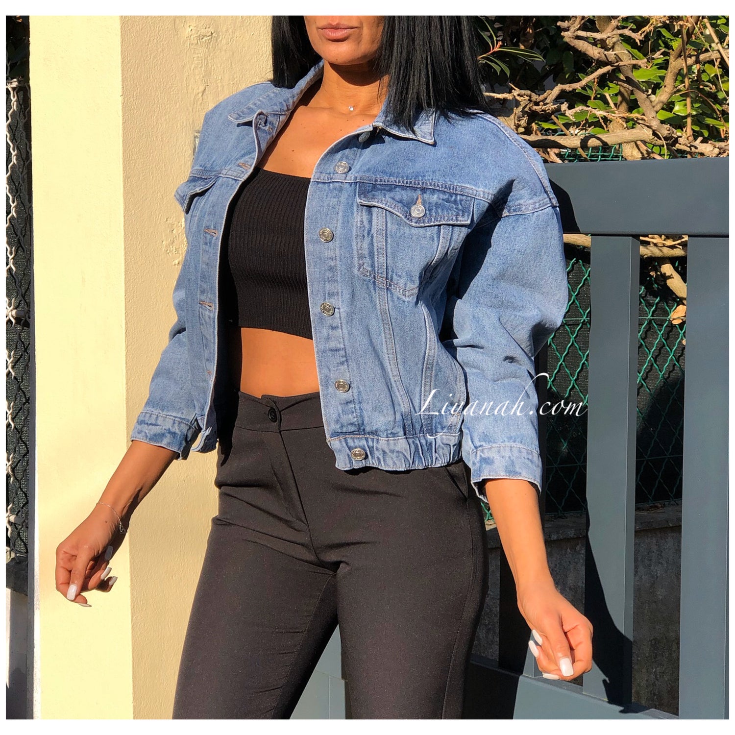VESTE JEAN COURTE BLUE Modèle LYKA - Veste en jeans COURTE ET légèrement OVERSIZE - elle se porte courte et large, comportant 4 poches fonctionnelles dont deux à la poitrine - détails élastique à la taille - MANCHES 3/4 - Taille S à L / Composition: 98% COTON 2% Elasthanne - Longueur : 54 cm (Notre modèle porte la taille S, fait un 32/34 Et mesure 1m70)