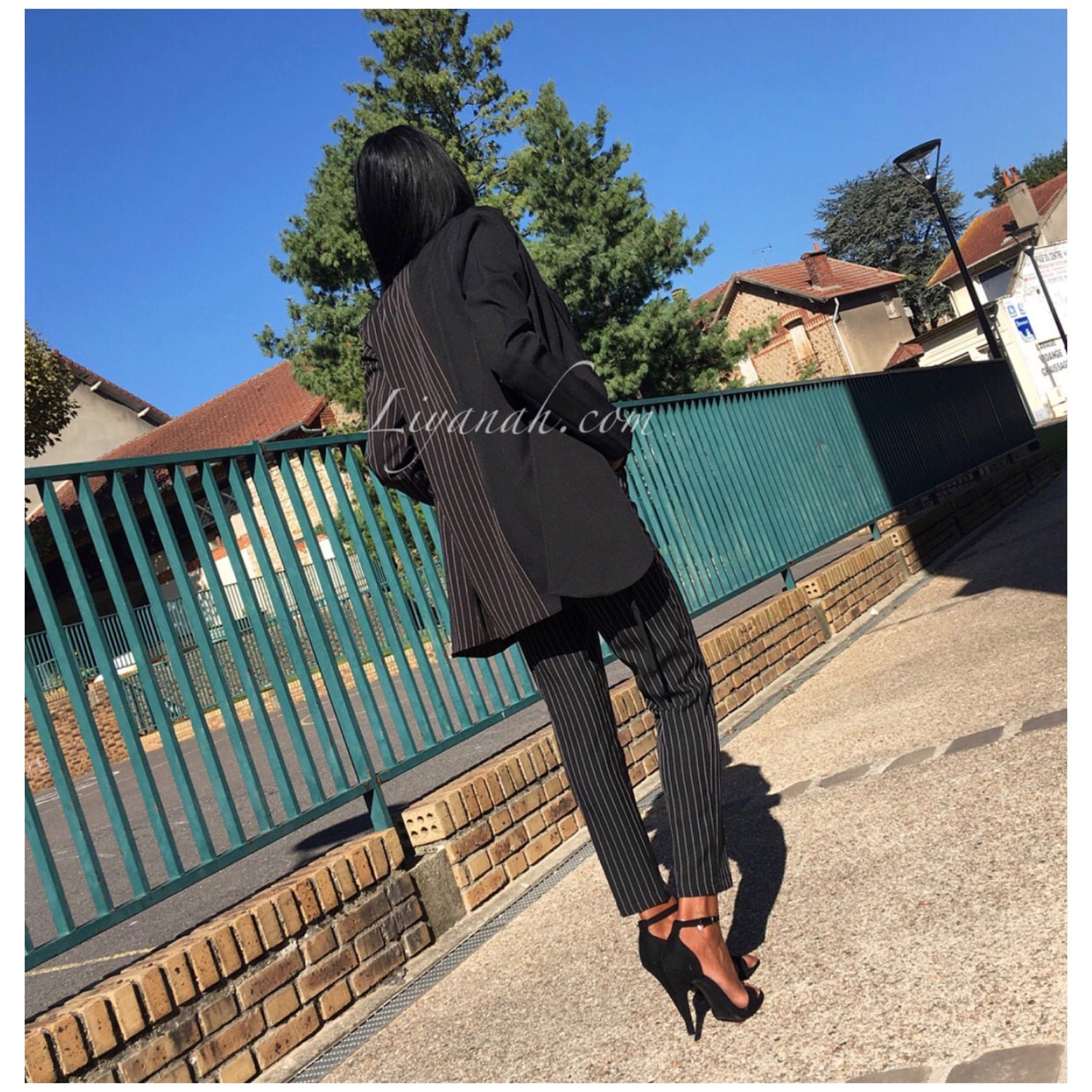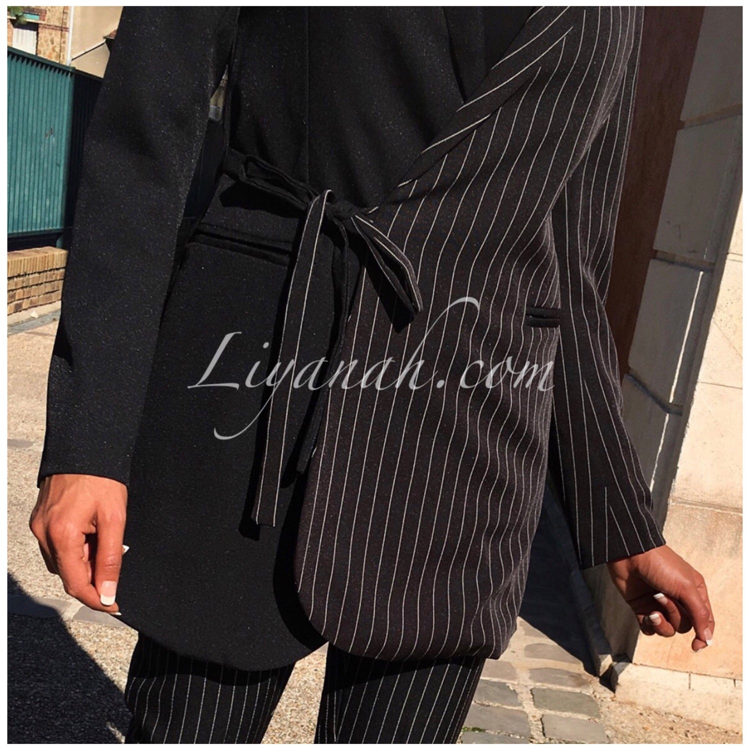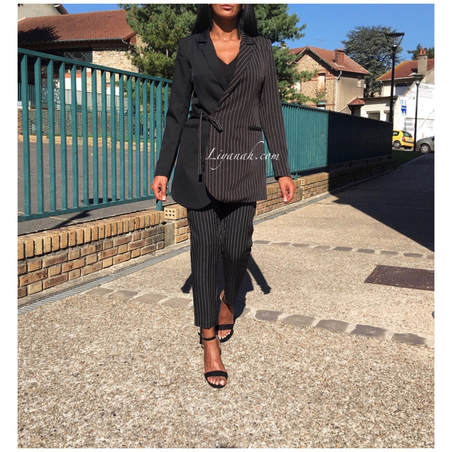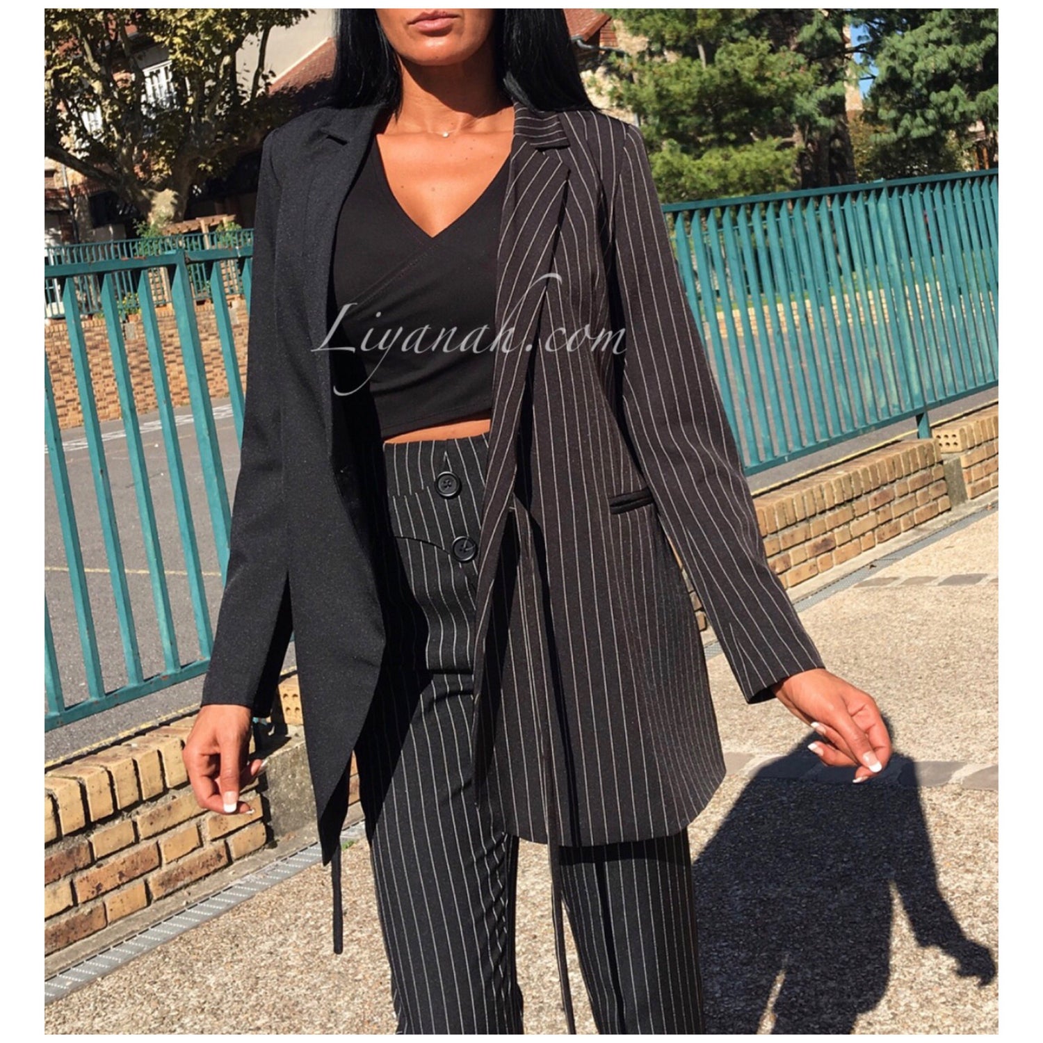 Veste TAILLEUR Modèle SAVERIA Confort idéal, des rayures légères et raffinées pour un tailleur qui surfe joliment sur la tendance urbain chic. Veste BI-COULEUR : Coupe légèrement cintrée Doublure intérieur Col avec revers Fermeture a noeuds Et un bouton intérieur 2 poches fonctionnelles 95% Polyester 5% Elasthanne Taille du XS au L