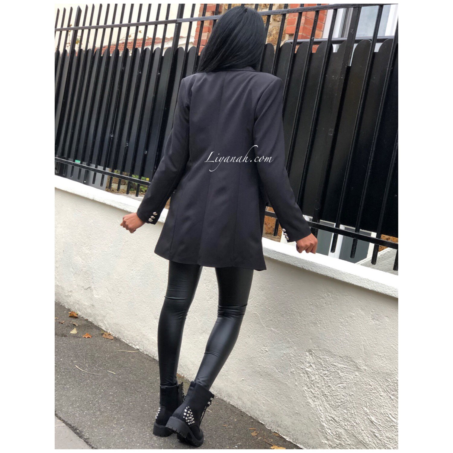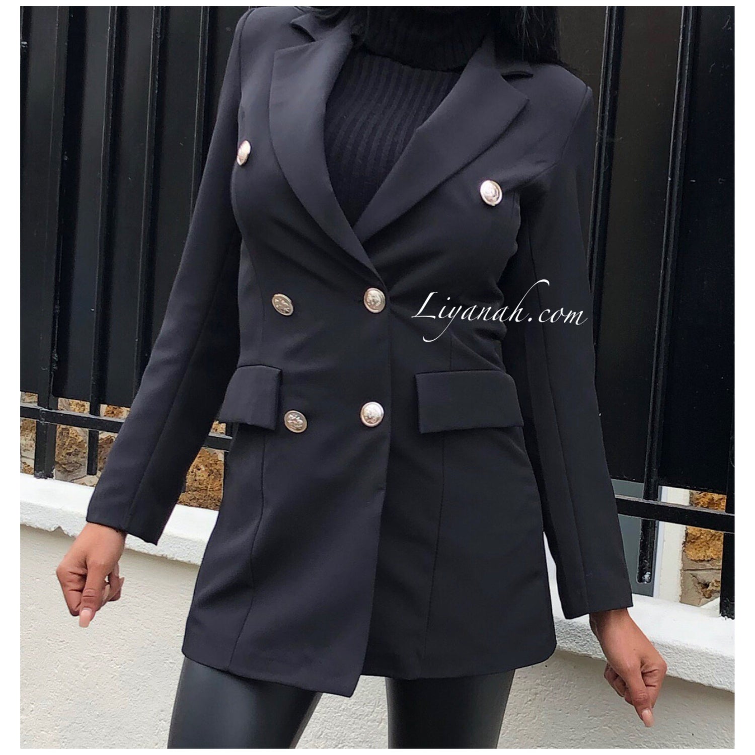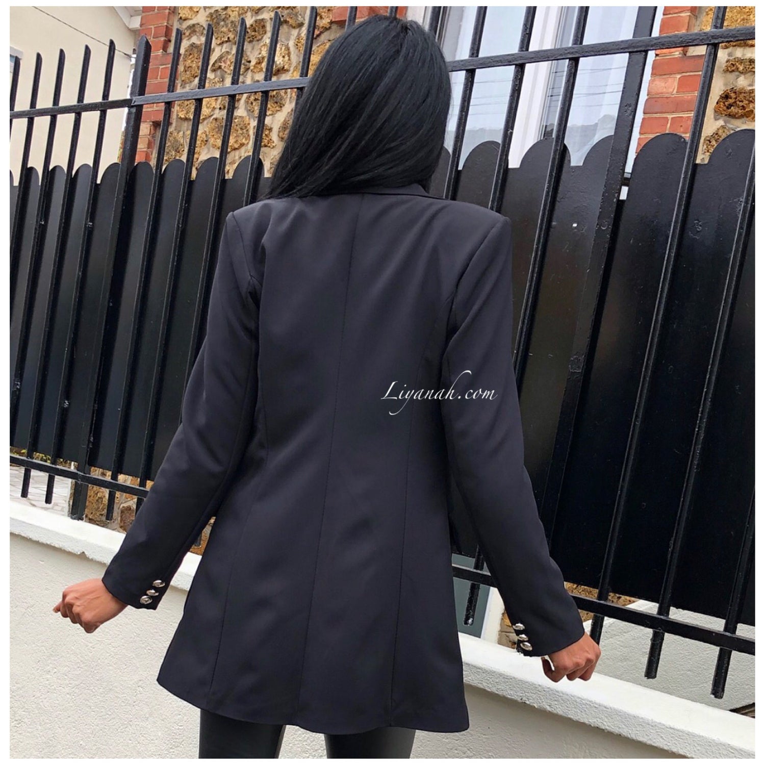 Blazer Modèle BELYA NOIR - Adoptez le modèle BELYA !! Une coupe mi longue et cintrée !!! Des manches longues et Un Tissus fluide !!! Portez La avec un t-shirt, body ou chemise, jean skinny ou pantalon simili !!! Elle rehaussera votre tenue !! 2 Poches fonctionnelles, boutons à l'avant Et sur les manches, Doublure intérieur et épaulettes 🖤 Notre modèle porte une Taille S - (Taille S à XL) matières : 95% Polyester 5% Elasthanne !!
