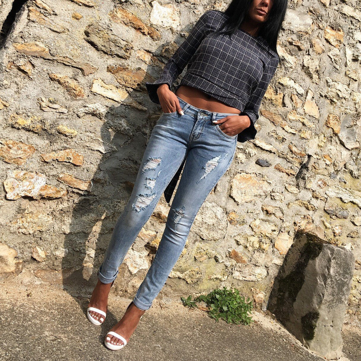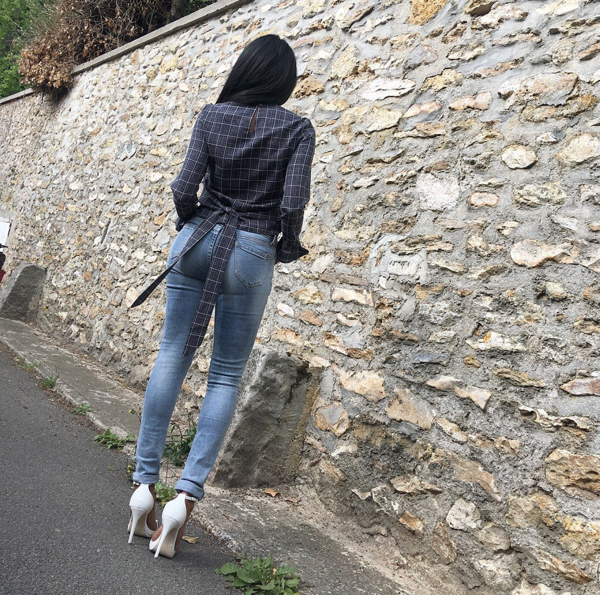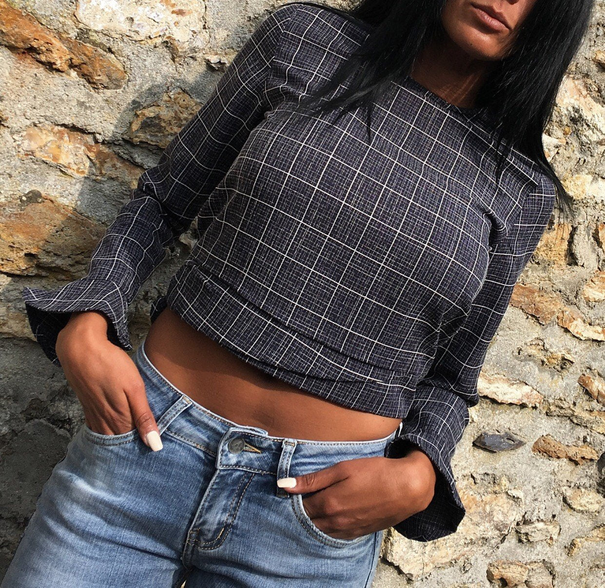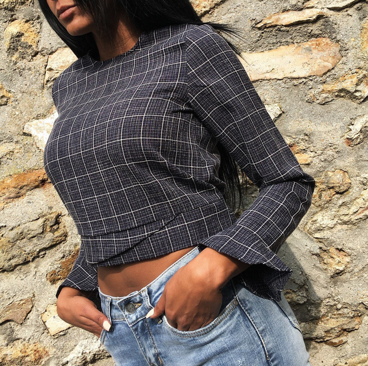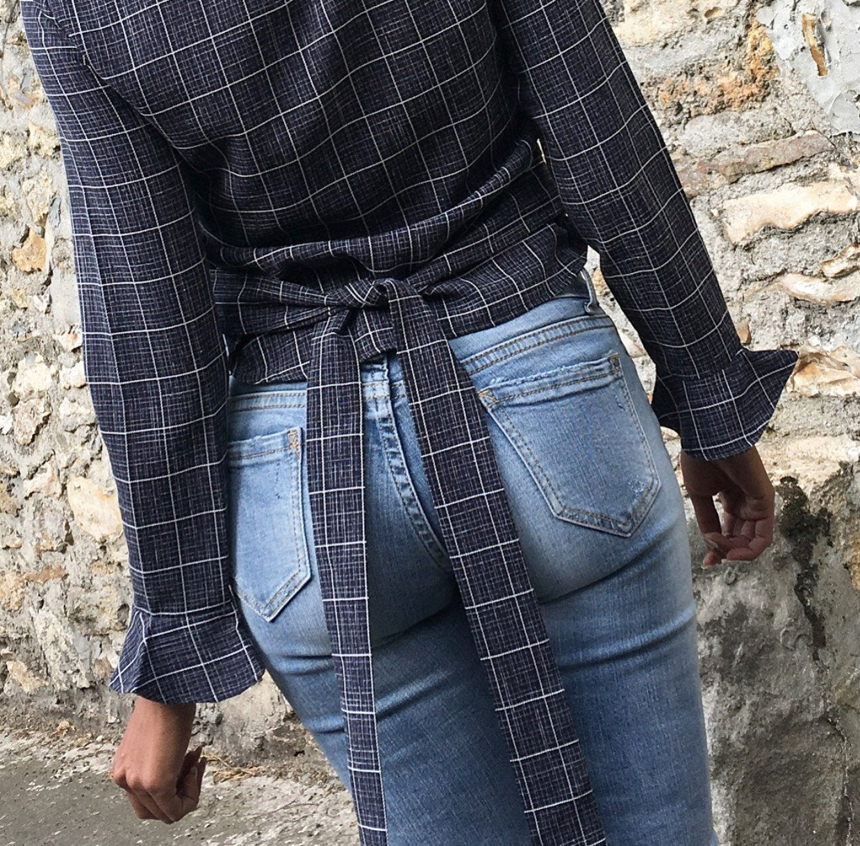 Blouse à carreaux Modèle EMY - manches longues avec détails évasés aux manches - Noeud fixe à nouer dans le dos - Carreaux couleur Blanc Et bleu - Col rond - Boutonné dans le dos 100% Polyester Osez les manches évasées avec cette blouse chic qui se porte de jour comme de nuit !!! Avec un jean clair ou foncé !! Totalement élégante !!!