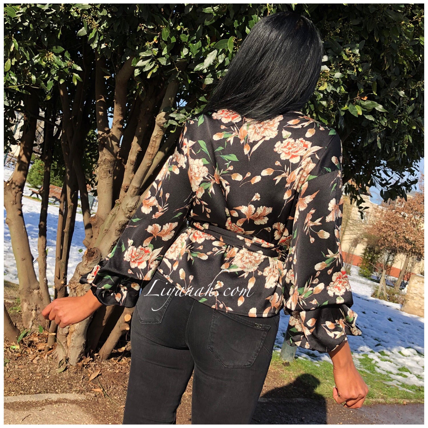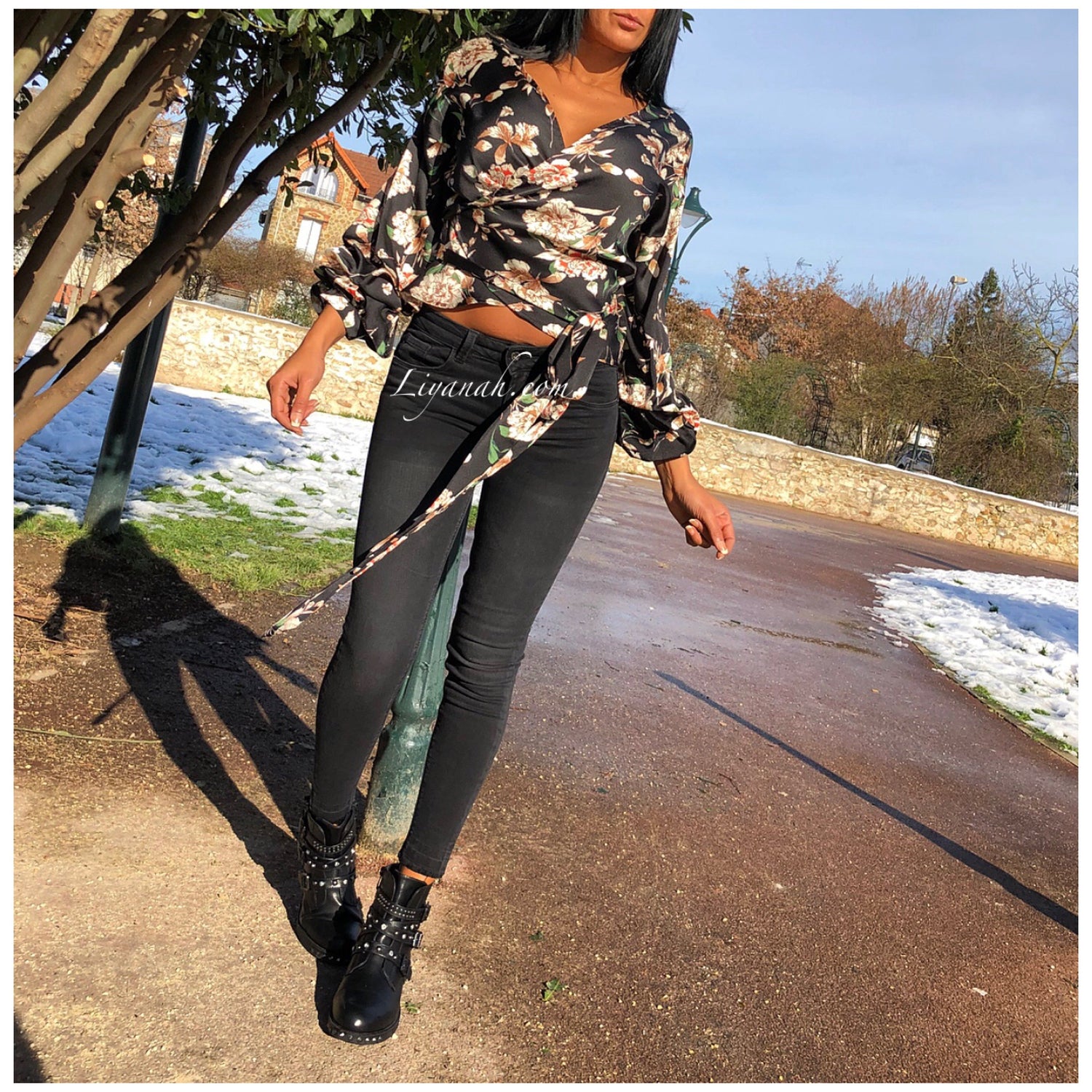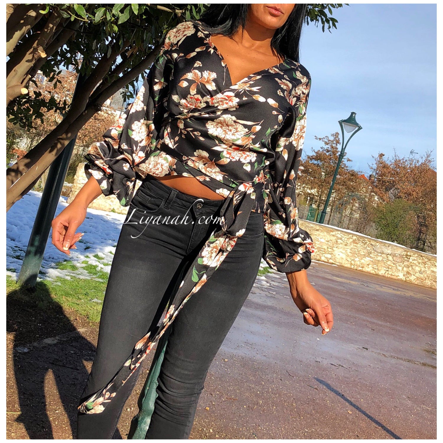Blouse cache-coeur à manches bouffantes avec noeuds à nouer Modèle KALYSSA !!! Imprimé fleuri ... Encolure Profonde Col V Portefeuille croisé !!! (Taille S au L) 100% Polyester - Notre modèle fait une taille 34 et porte une Taille S - Disponible en Noir ou vert