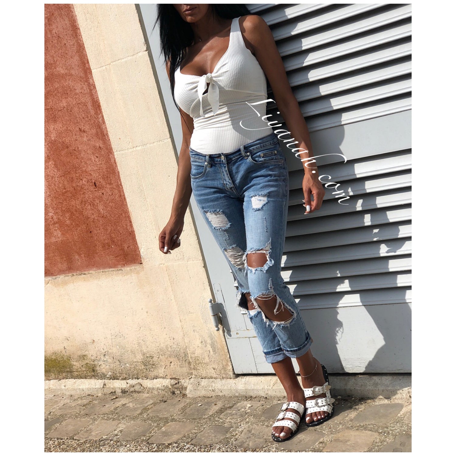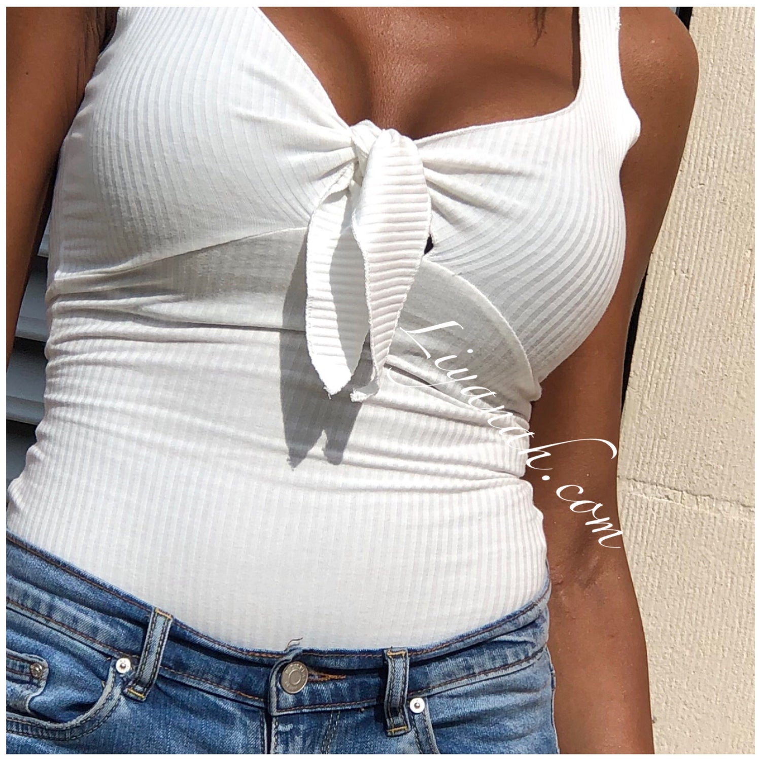 BODY Modèle BAKHTA Blanc - Dingue des bodys chez Liyanah et ce modèle est sexy et décontracté !!! Portez-le avec un jean, short, pantalon ou jupe !!! Il s'adaptera à toutes vos envies !! Décolleté plongeant avec noeud fixe à nouer à la poitrine !! 95% Coton 5% Elasthanne 💋 Style COTELÉ !!! Taille XS au M - Disponible en Noir ou Blanc - FERMETURE À BOUTONS A L’ENTREJAMBE - Notre modèle porte une Taille XS / Pour des raisons d'hygiène, les bodys et sous vêtement ne sont ni repris ni échangé