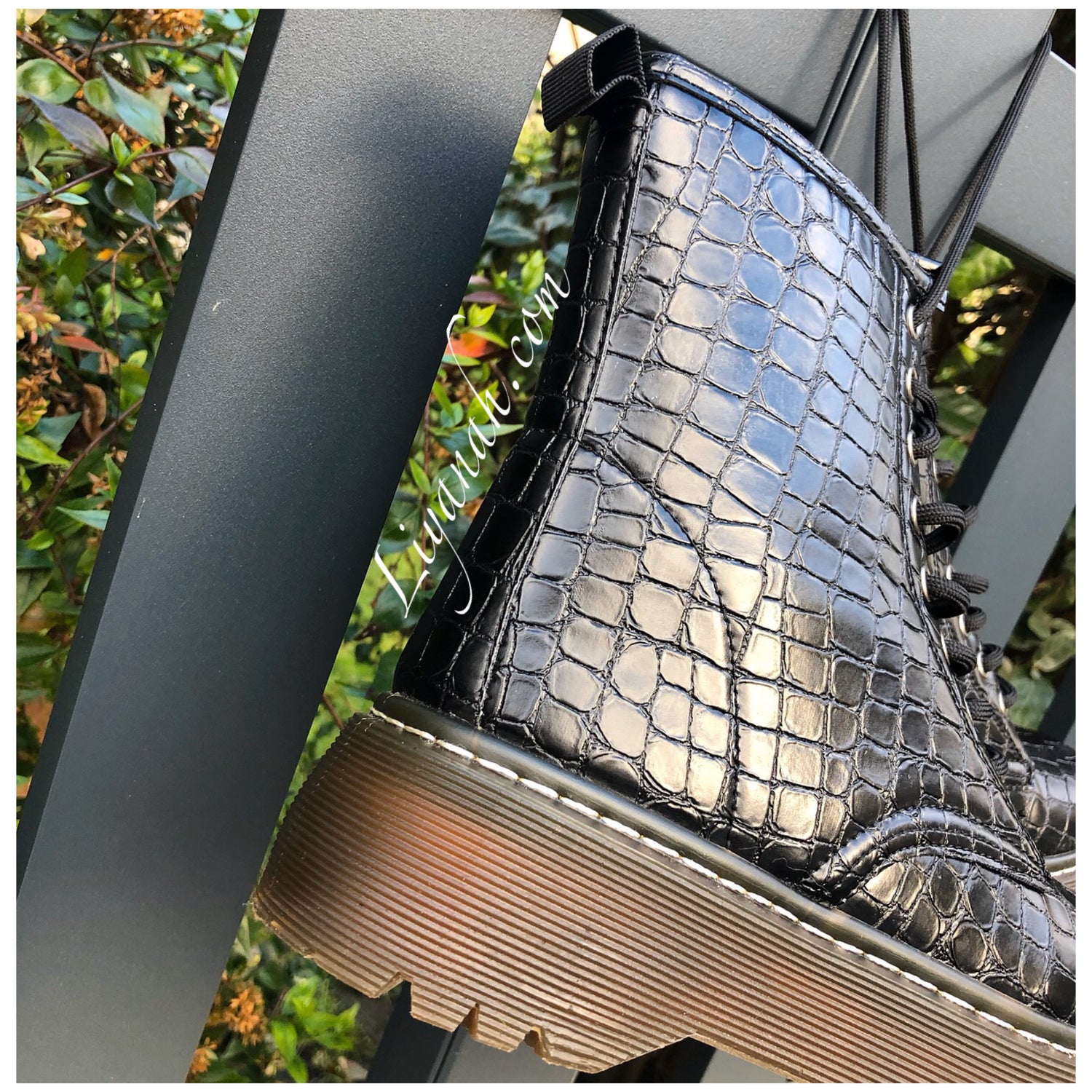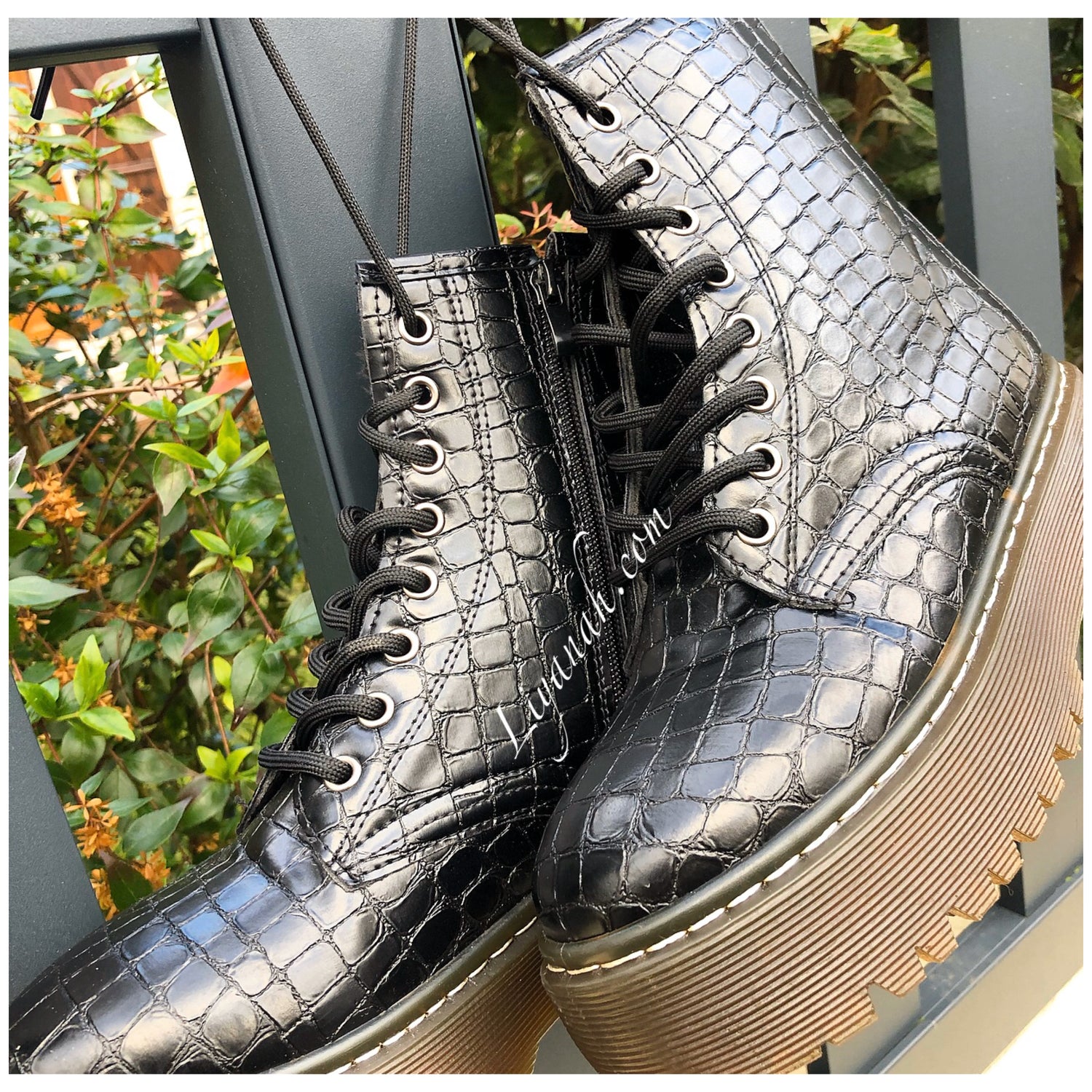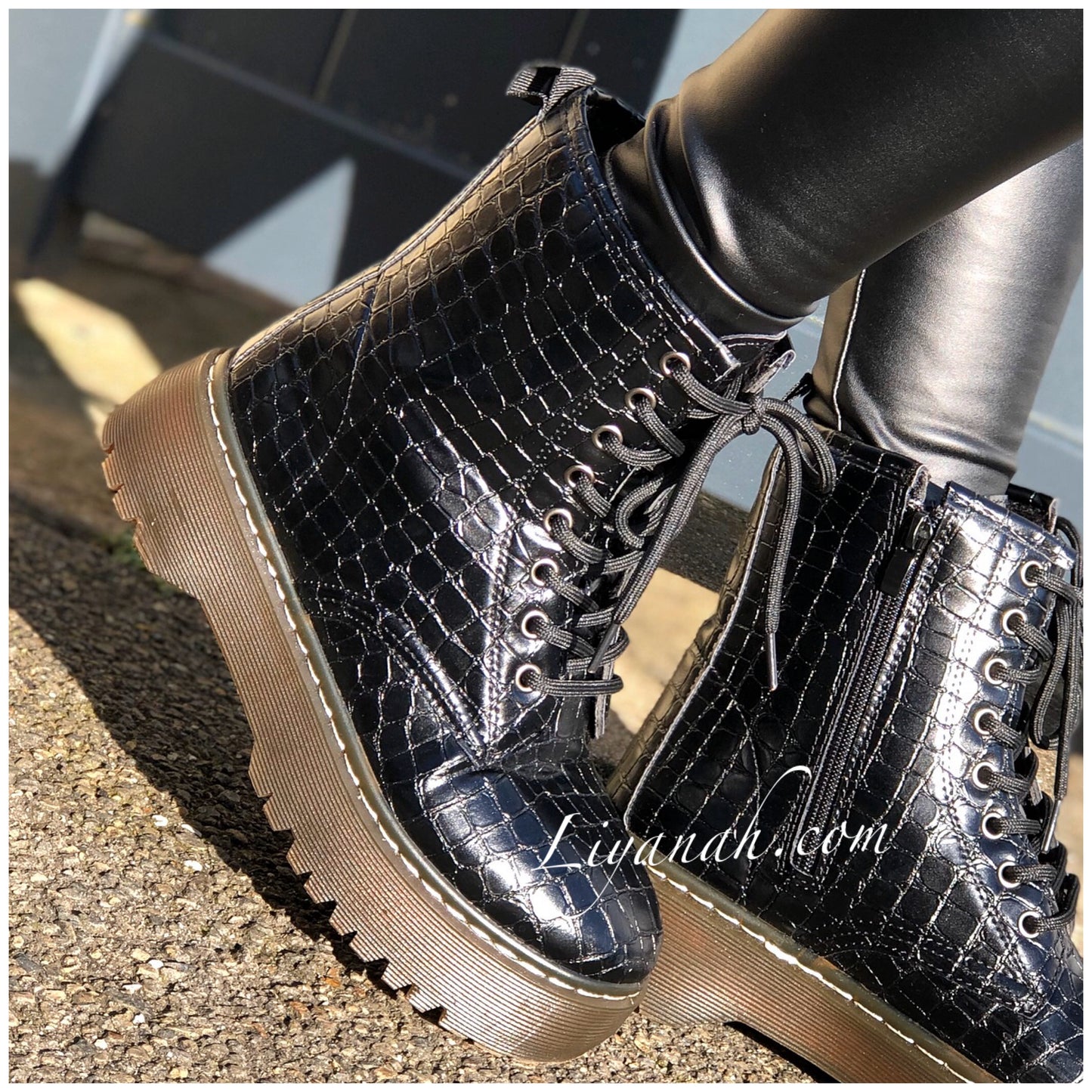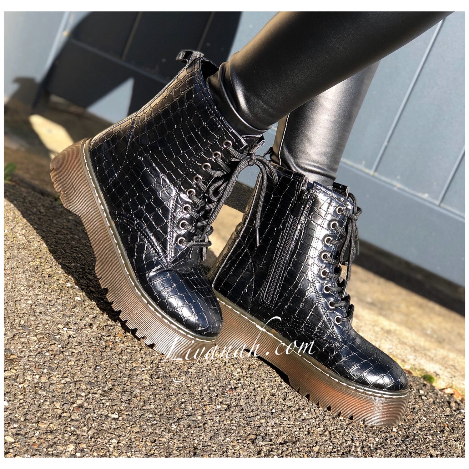 BOOTS Modèle LIZZY NOIR CROCO - Boots noir à fermeture ZIP sur le côté et laçage à 8 œillets, montées sur semelle plateforme, bout rond et languette à l’arrière. Hauteur de la tige Noir : 2,5 cm - Hauteur de la plateforme : 4,5 cm - Matière Synthétique - Taille 36 au 41 (Les chaussures vendus sur notre site ne sont ni repris ni échangé pour des raisons d'hygiène !! CONSEIL : Prenez votre Taille Habituelle)
