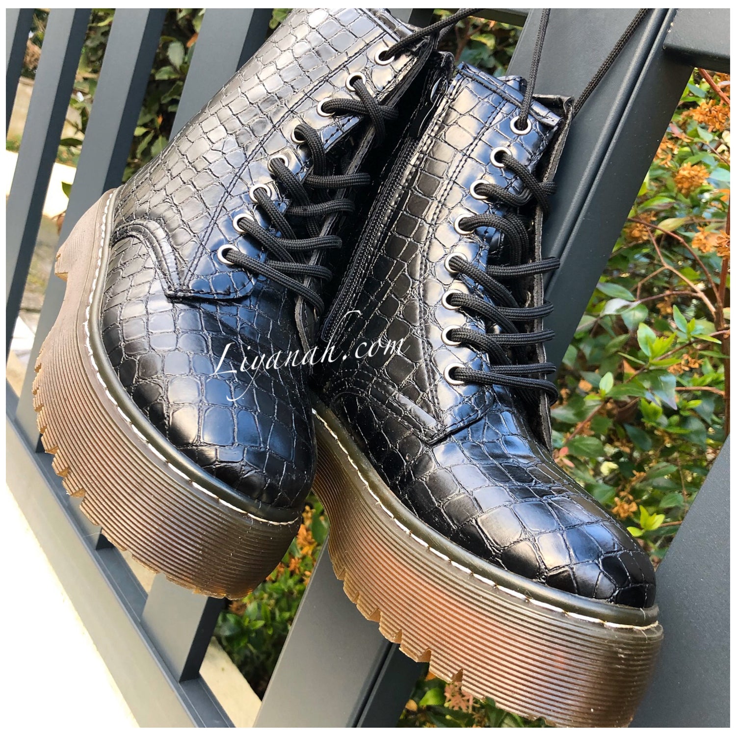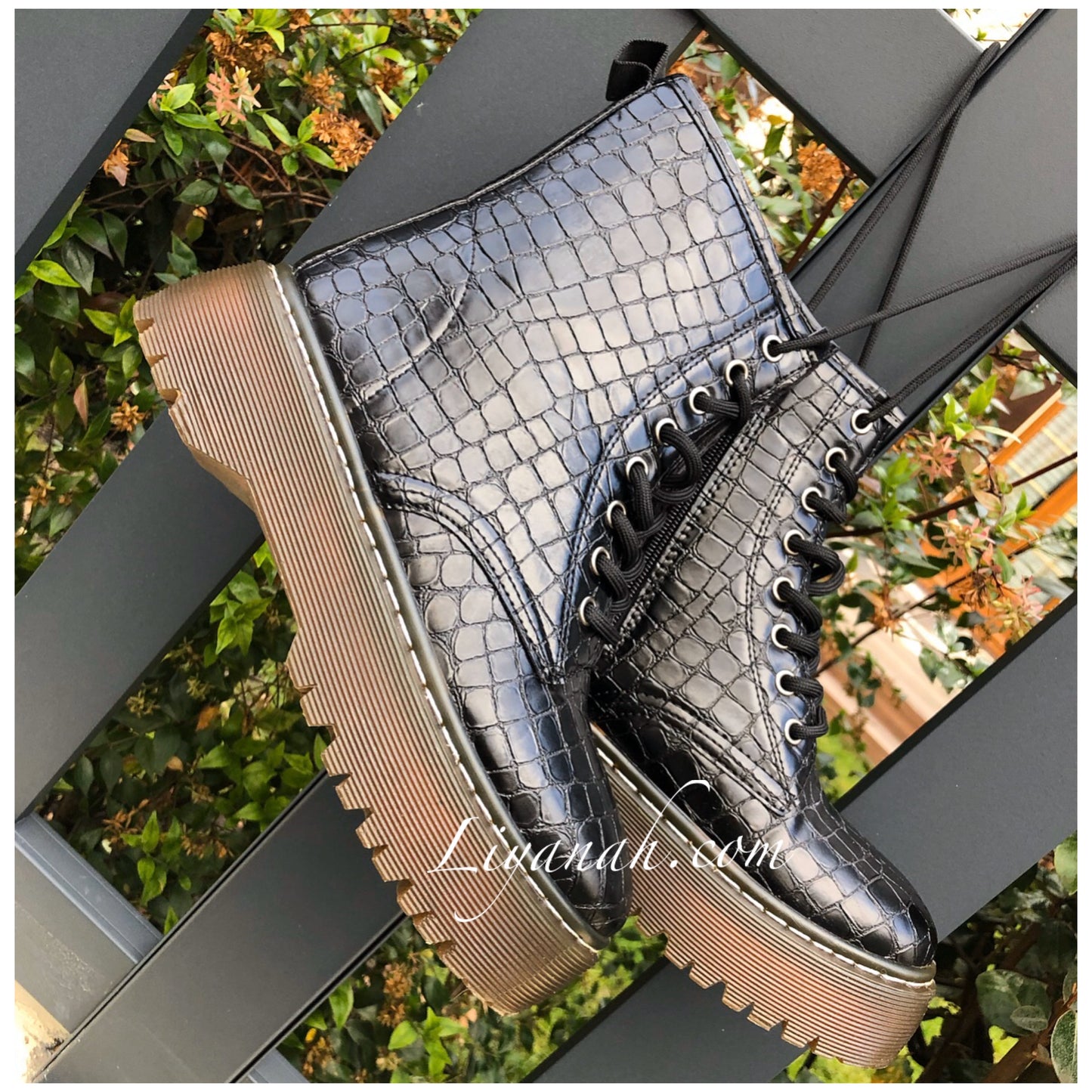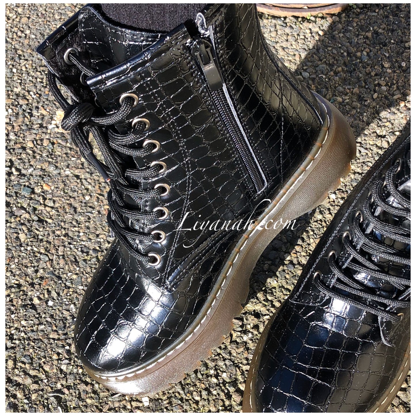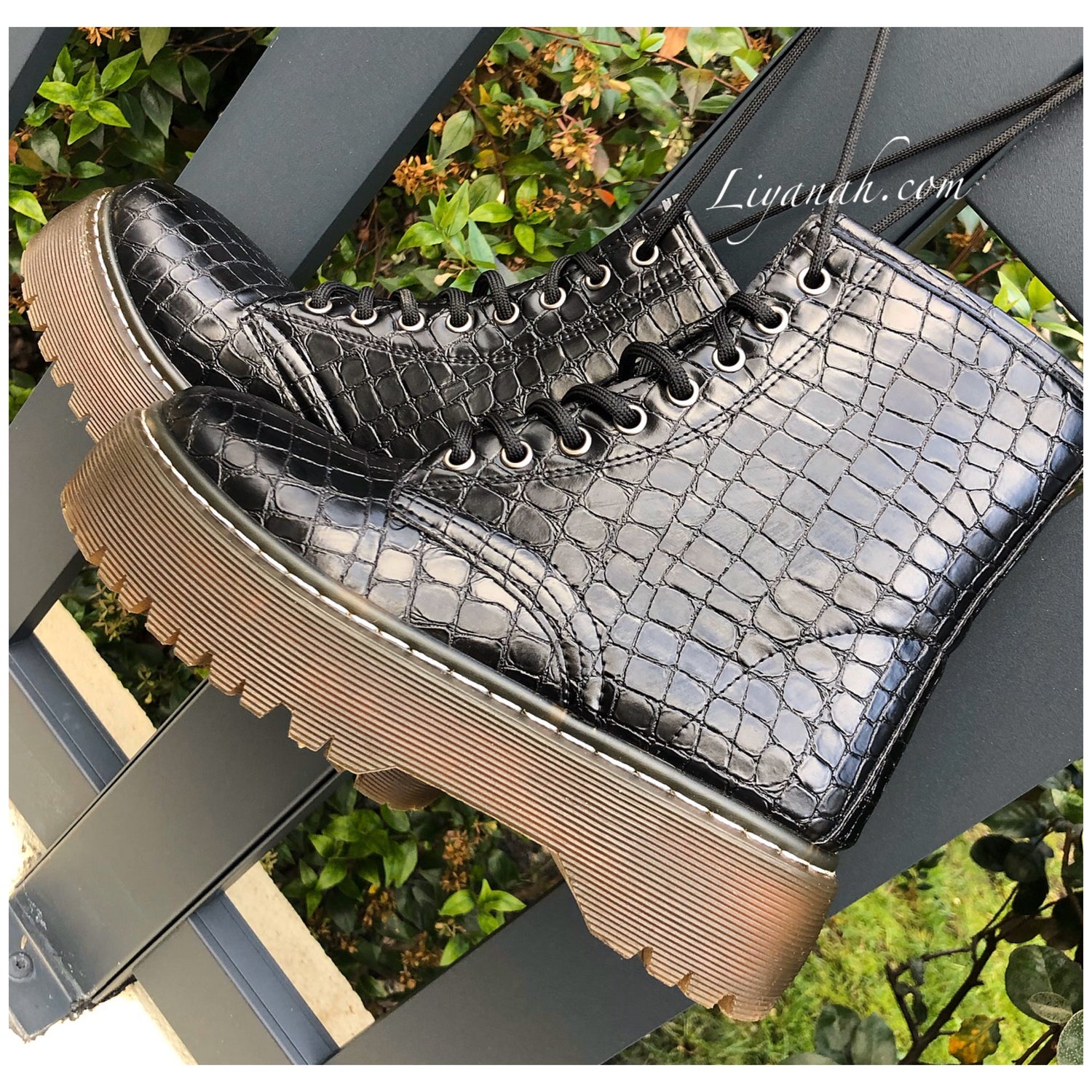 BOOTS Modèle LIZZY NOIR CROCO - Boots noir à fermeture ZIP sur le côté et laçage à 8 œillets, montées sur semelle plateforme, bout rond et languette à l’arrière. Hauteur de la tige Noir : 2,5 cm - Hauteur de la plateforme : 4,5 cm - Matière Synthétique - Taille 36 au 41 (Les chaussures vendus sur notre site ne sont ni repris ni échangé pour des raisons d'hygiène !! CONSEIL : Prenez votre Taille Habituelle)