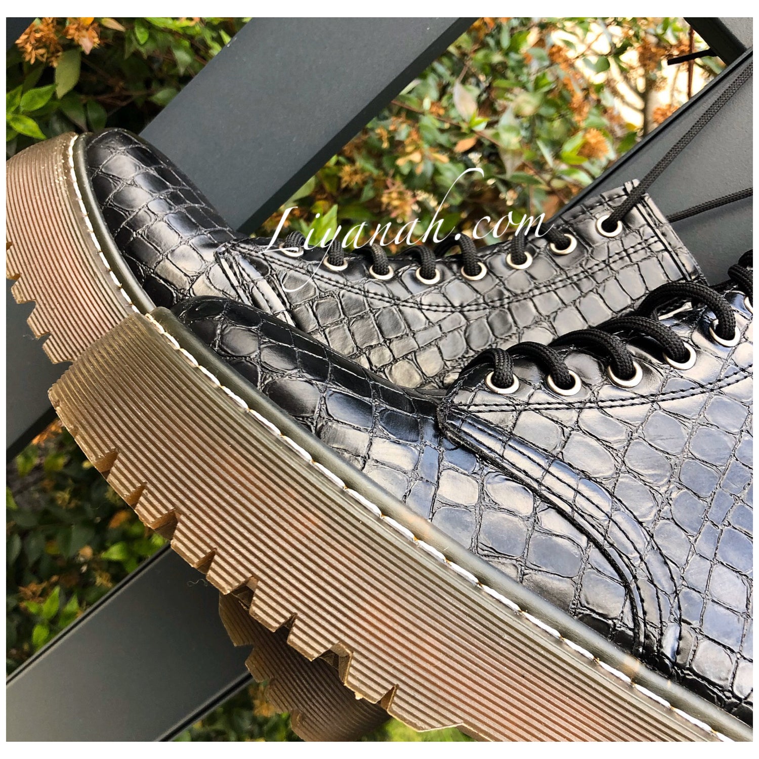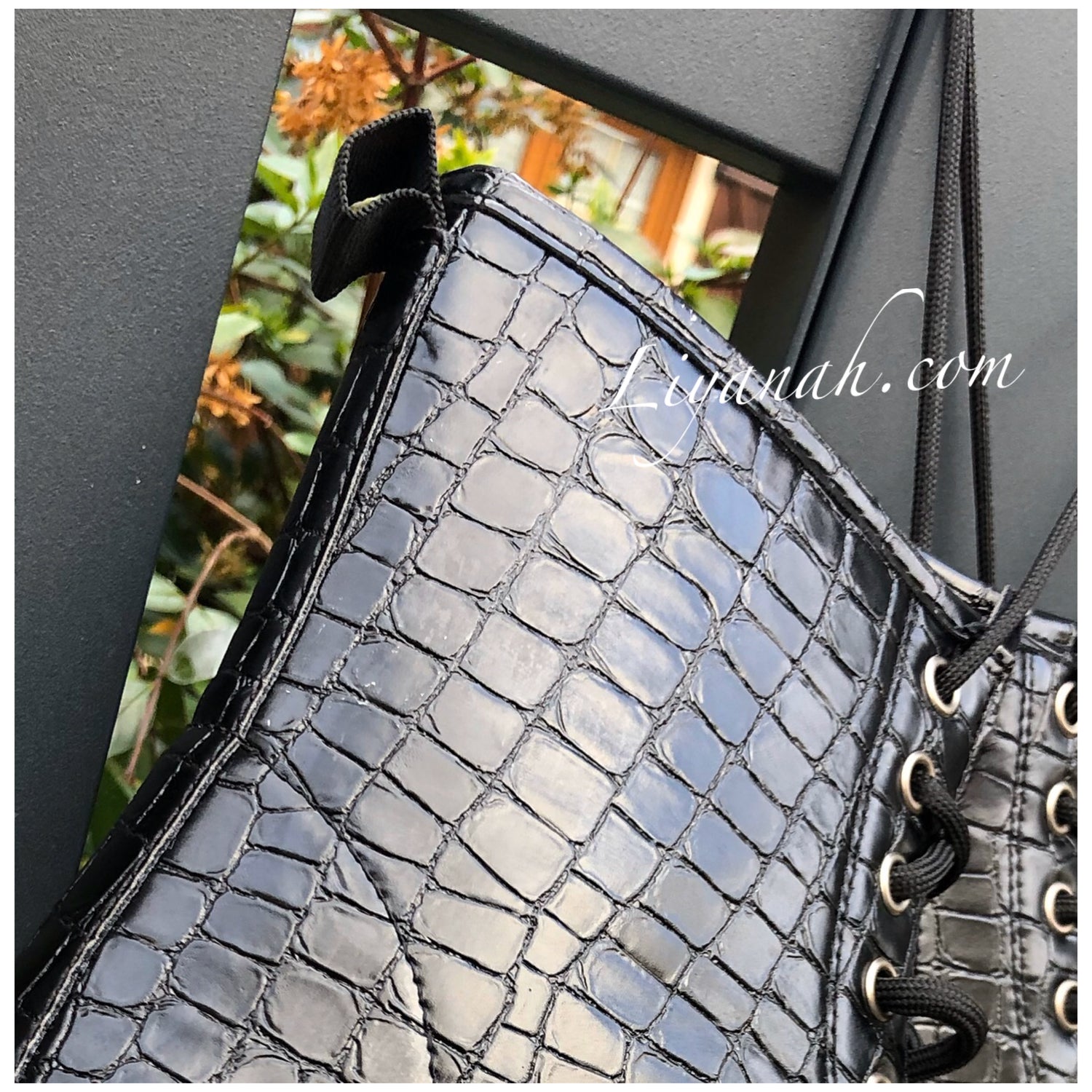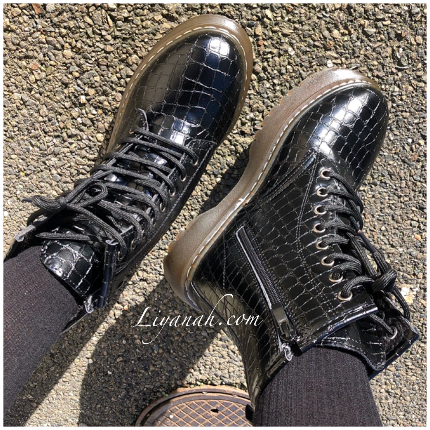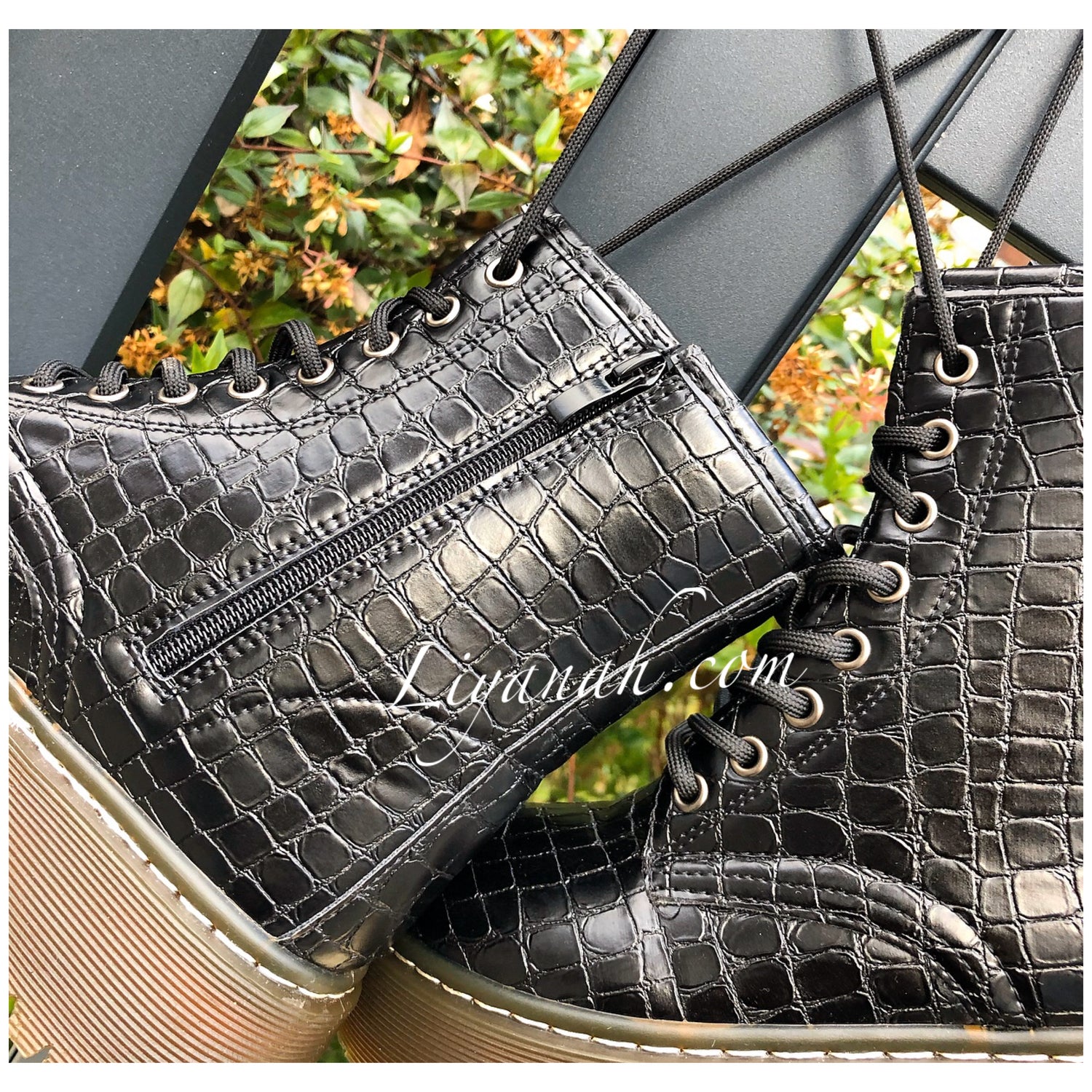 BOOTS Modèle LIZZY NOIR CROCO - Boots noir à fermeture ZIP sur le côté et laçage à 8 œillets, montées sur semelle plateforme, bout rond et languette à l’arrière. Hauteur de la tige Noir : 2,5 cm - Hauteur de la plateforme : 4,5 cm - Matière Synthétique - Taille 36 au 41 (Les chaussures vendus sur notre site ne sont ni repris ni échangé pour des raisons d'hygiène !! CONSEIL : Prenez votre Taille Habituelle)
